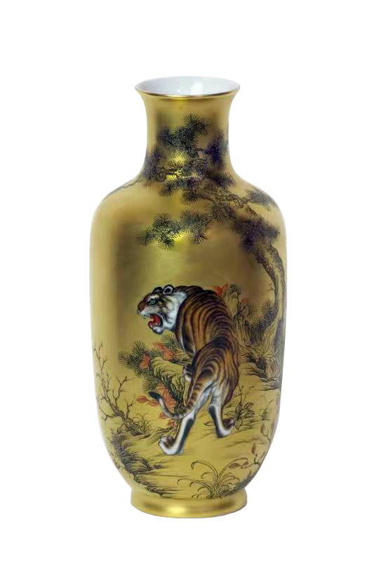 此瓶为故宫藏瓷精品,系当年御用画师郎世宁在宫廷中,为乾隆帝所绘。所以画风具有浓郁的西洋色彩,但总体仍系中国工笔画风格。草木栩栩如生,动物简练传神。通体瓶身施以本金,彰显此器物的宫廷“身价”。虎皮上的毛发,丝丝清晰分明,松树苍劲挺拔,喻意皇恩浩荡,栩栩如生。