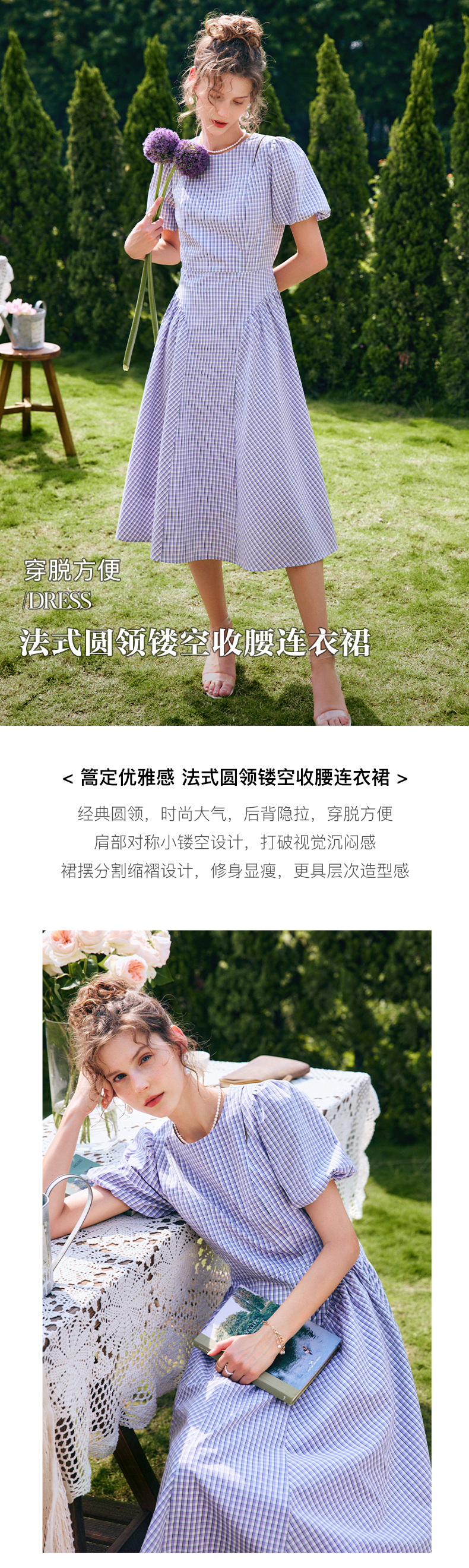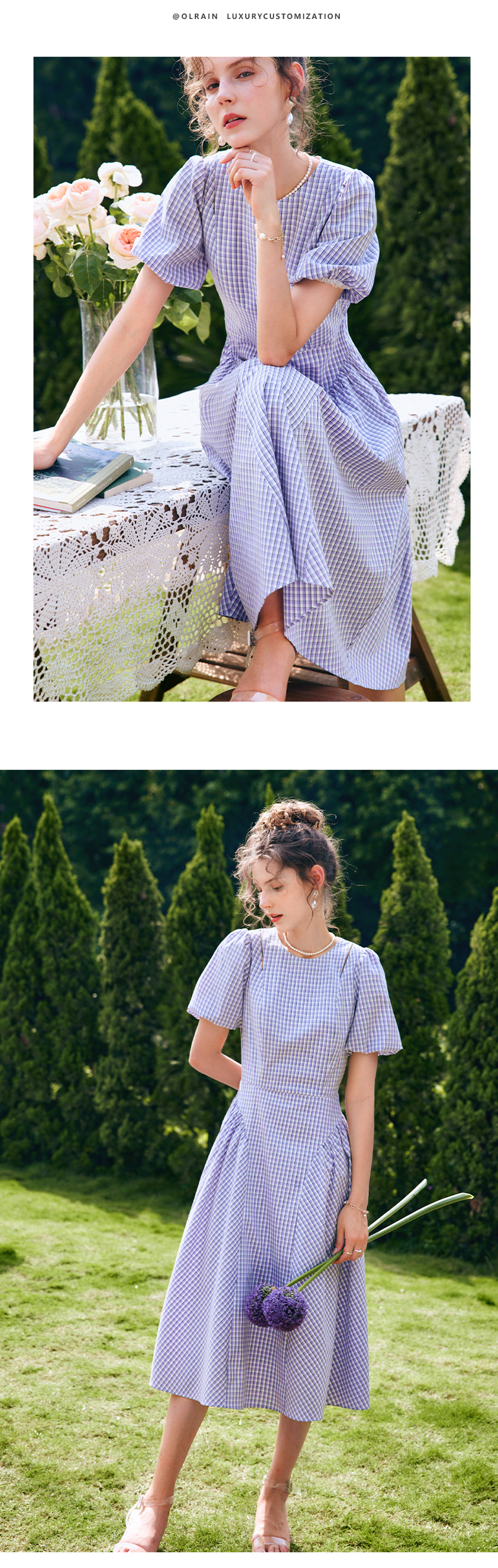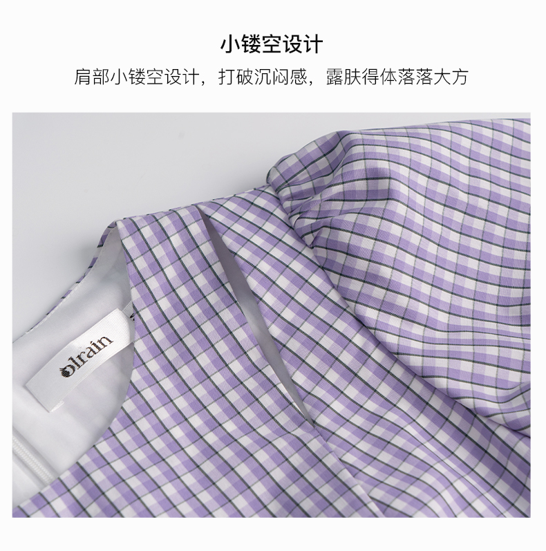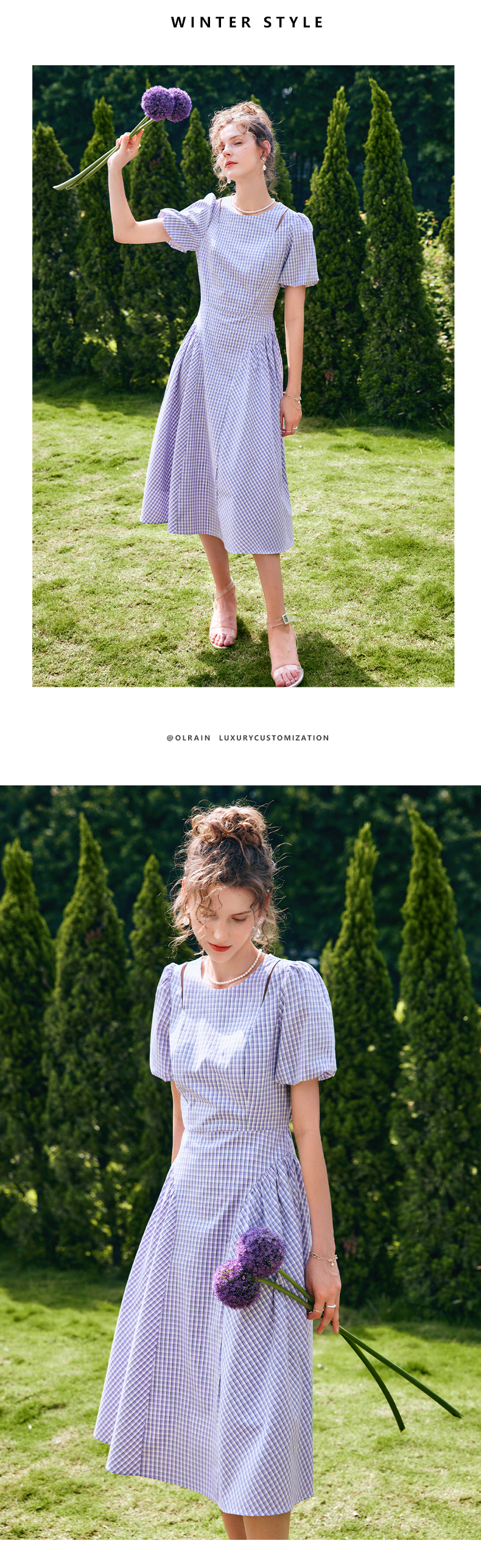 OLrain法式高级穿搭格子连衣裙女夏季2022年新款收腰镂空泡泡袖裙