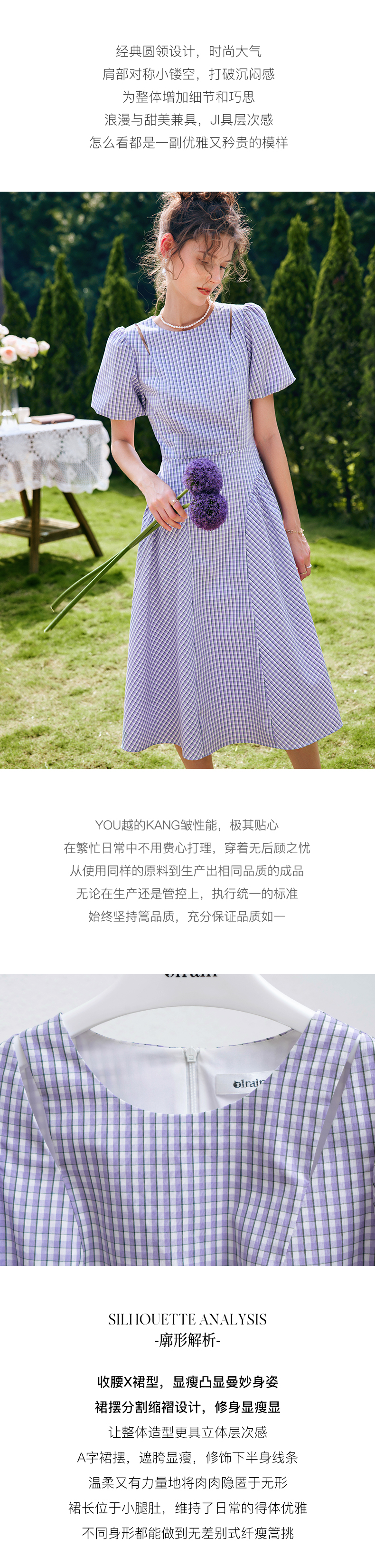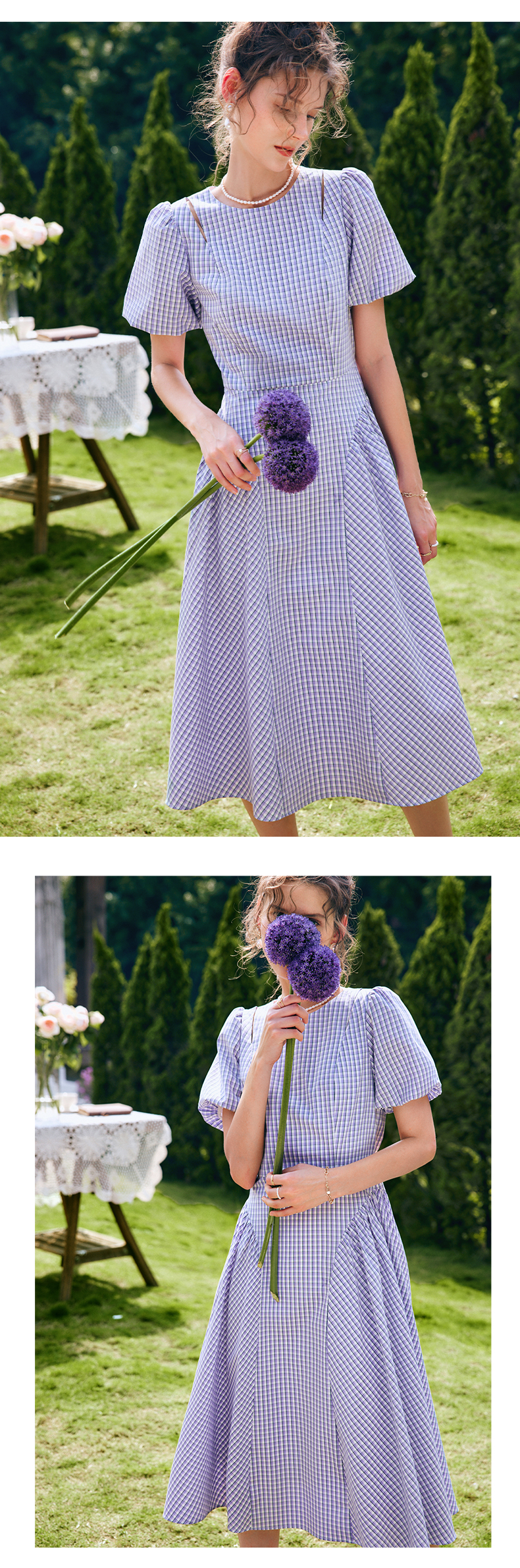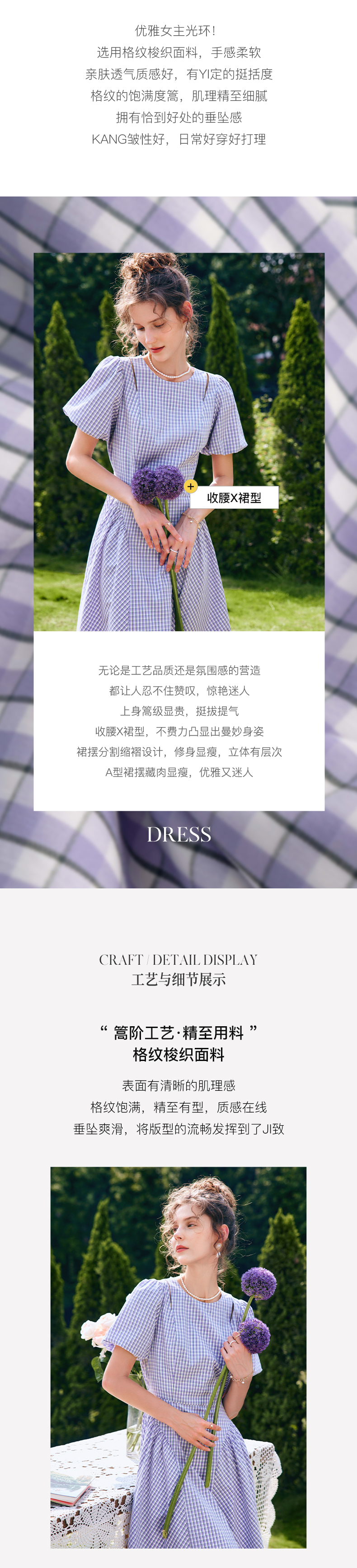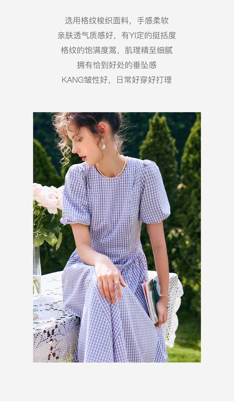 OLrain法式高级穿搭格子连衣裙女夏季2022年新款收腰镂空泡泡袖裙