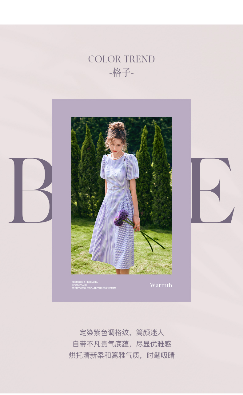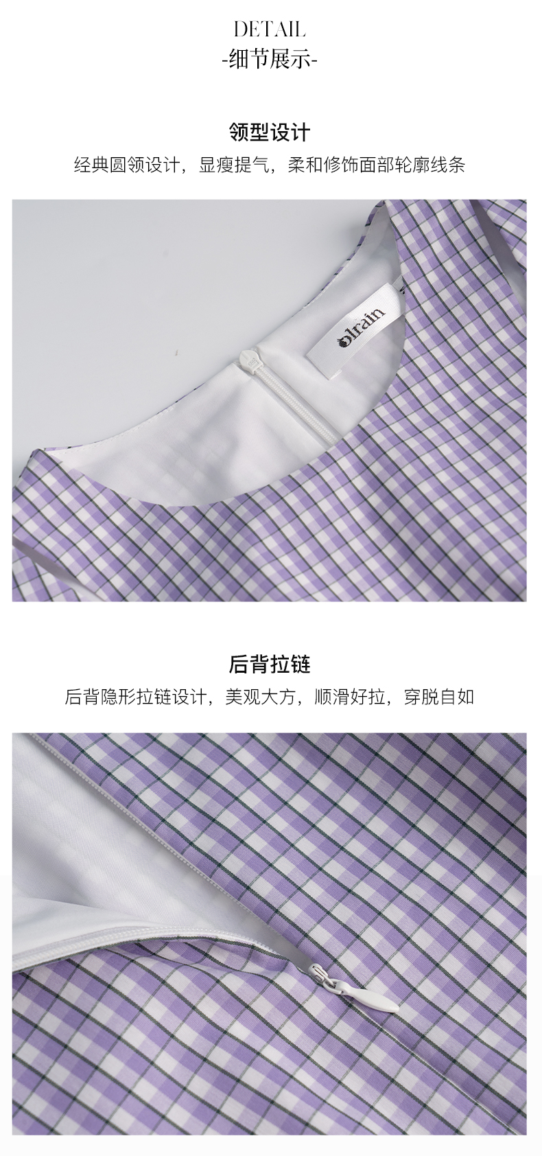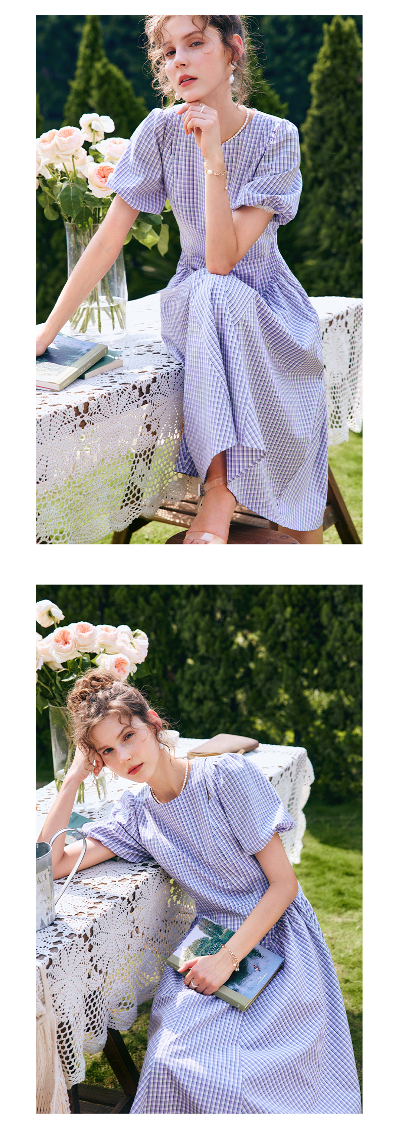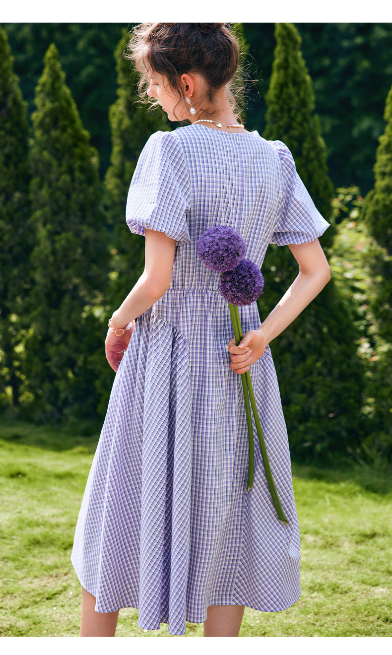 OLrain法式高级穿搭格子连衣裙女夏季2022年新款收腰镂空泡泡袖裙