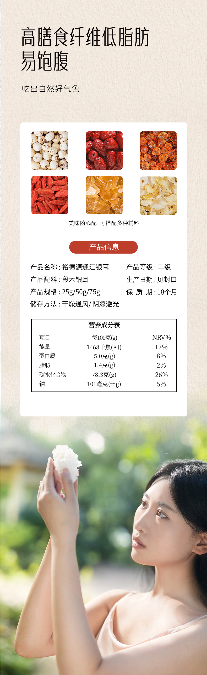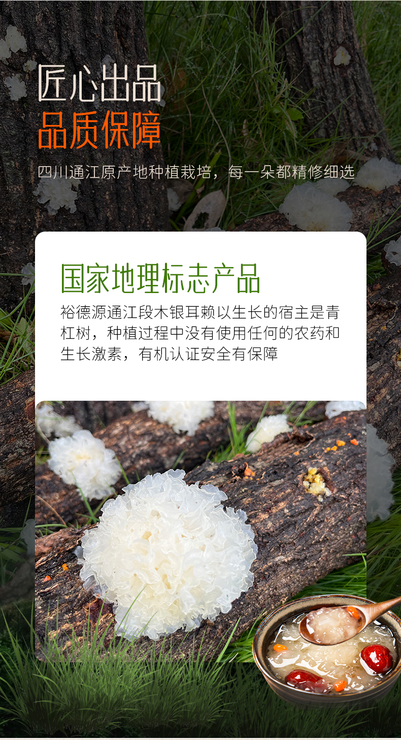 | 配料表: 段木通江银耳 | 储藏方法: 干燥通风、阴凉避光 |