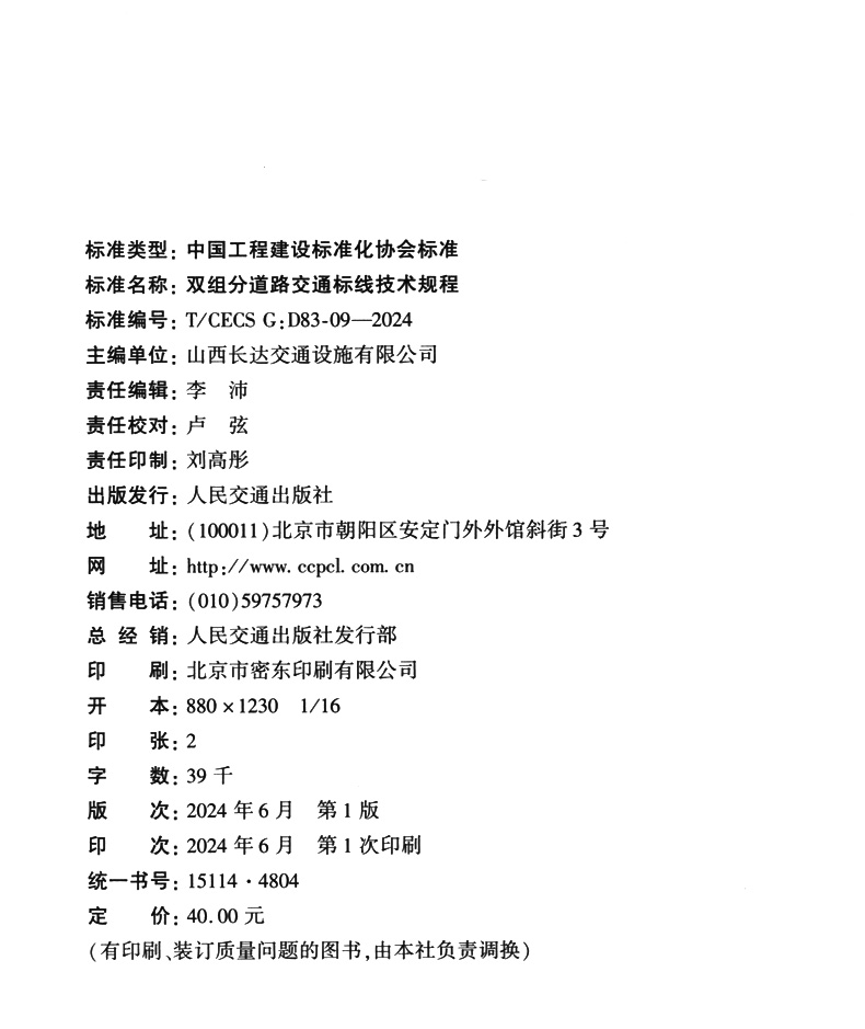 书名:双组分道路交通标线技术规程(T/CECS G:D83-09—2024)