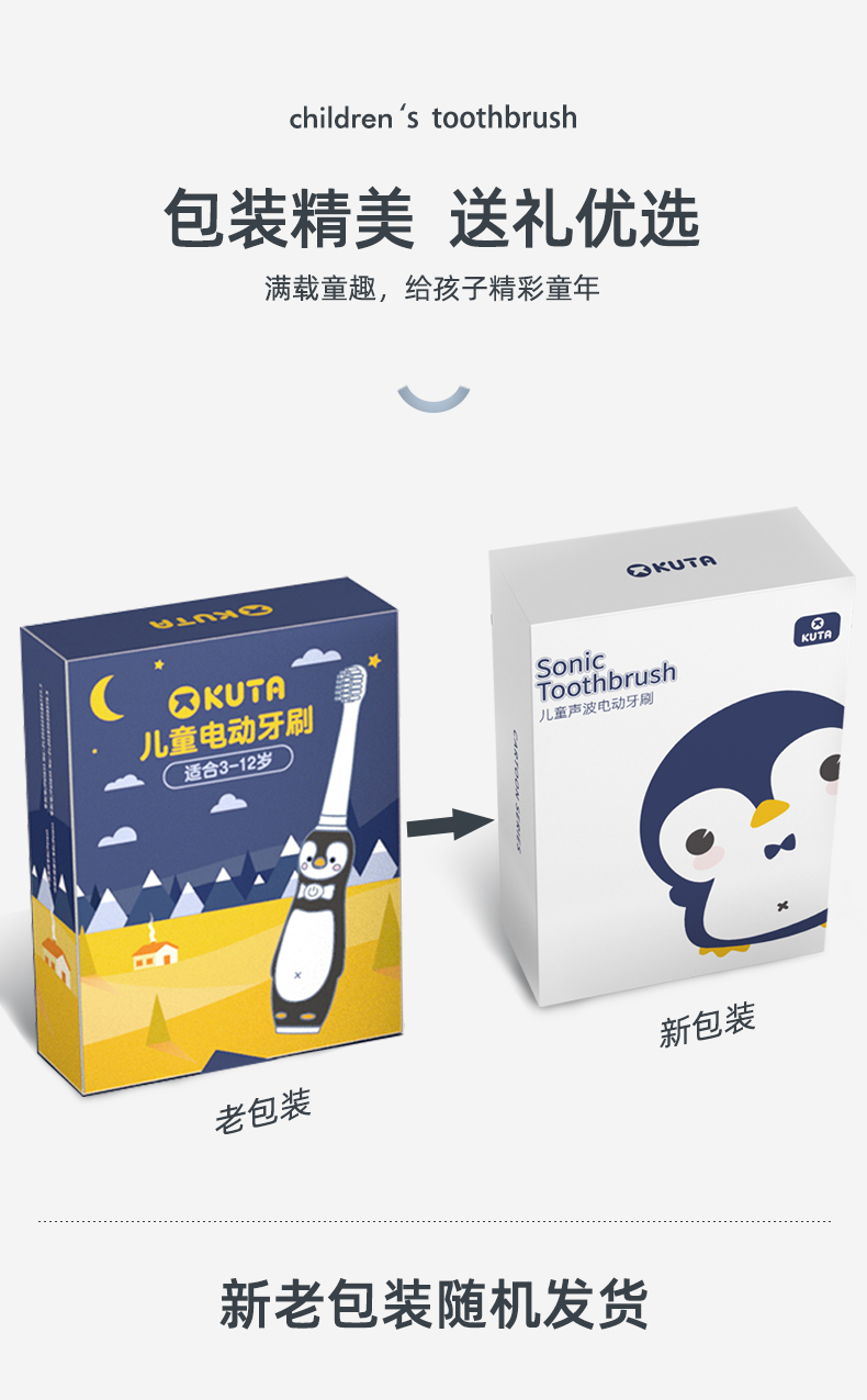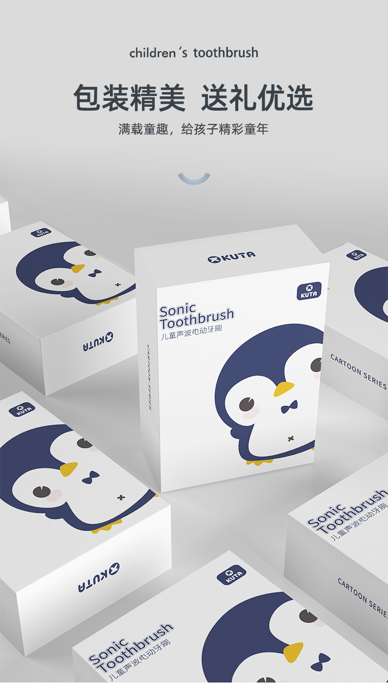 【kuta儿童电动牙刷企鹅卡通】充电式小孩3-6-12岁以上宝宝软刷毛声波自动(1机身+3刷头+送壁挂架)