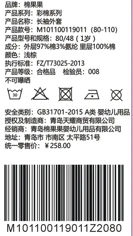 棉果果春秋款新疆彩棉男童女童 长袖外套M101100119011