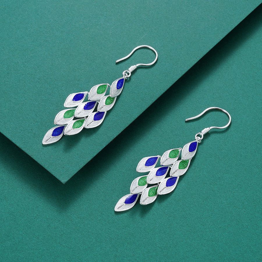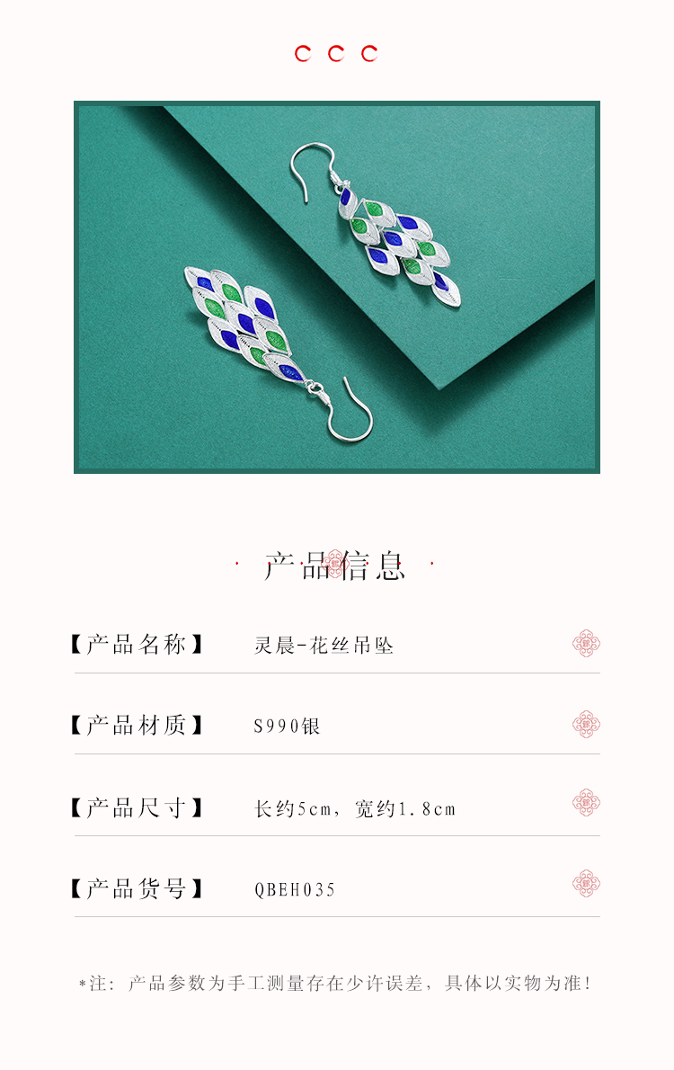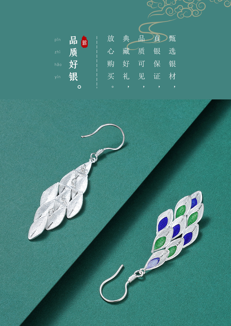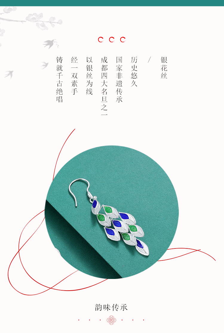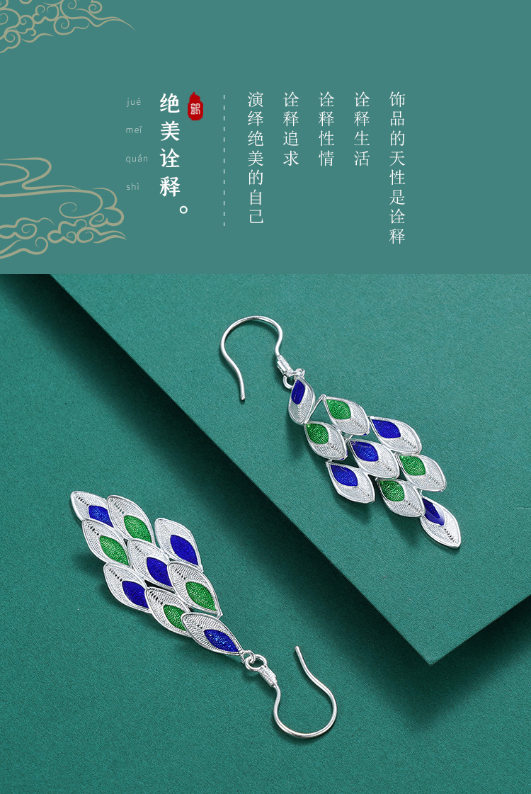 【寓意】:凤凰羽毛是吉祥尊贵,重生永恒的象征,耳饰灵感取源于此以,采用银花丝缠绕编织,完美还原凤凰羽毛层叠堆垒的形态。整体端庄大气,寓意吉祥美满