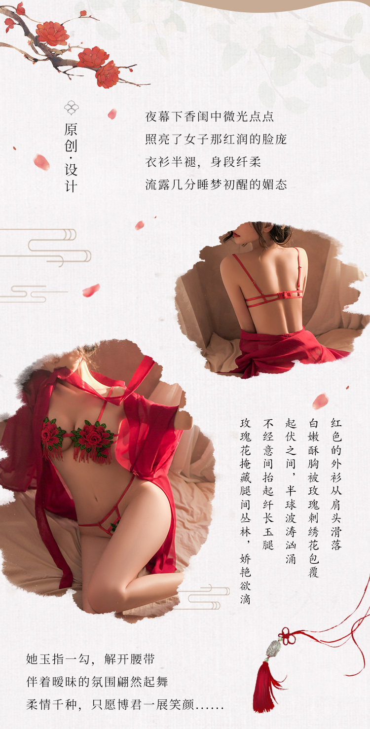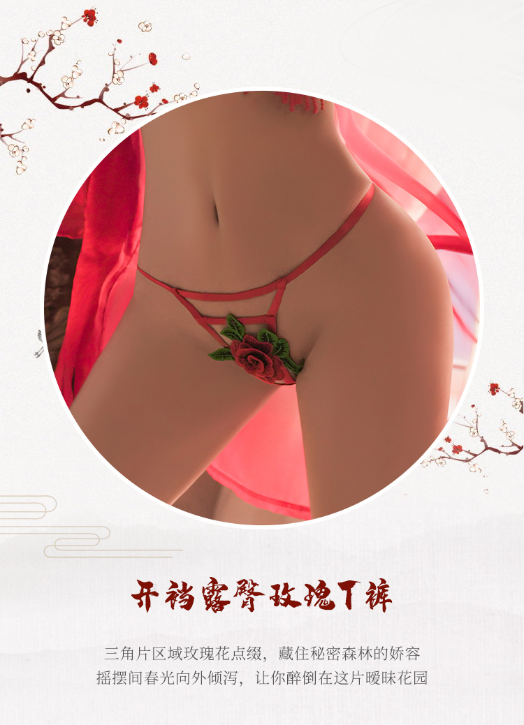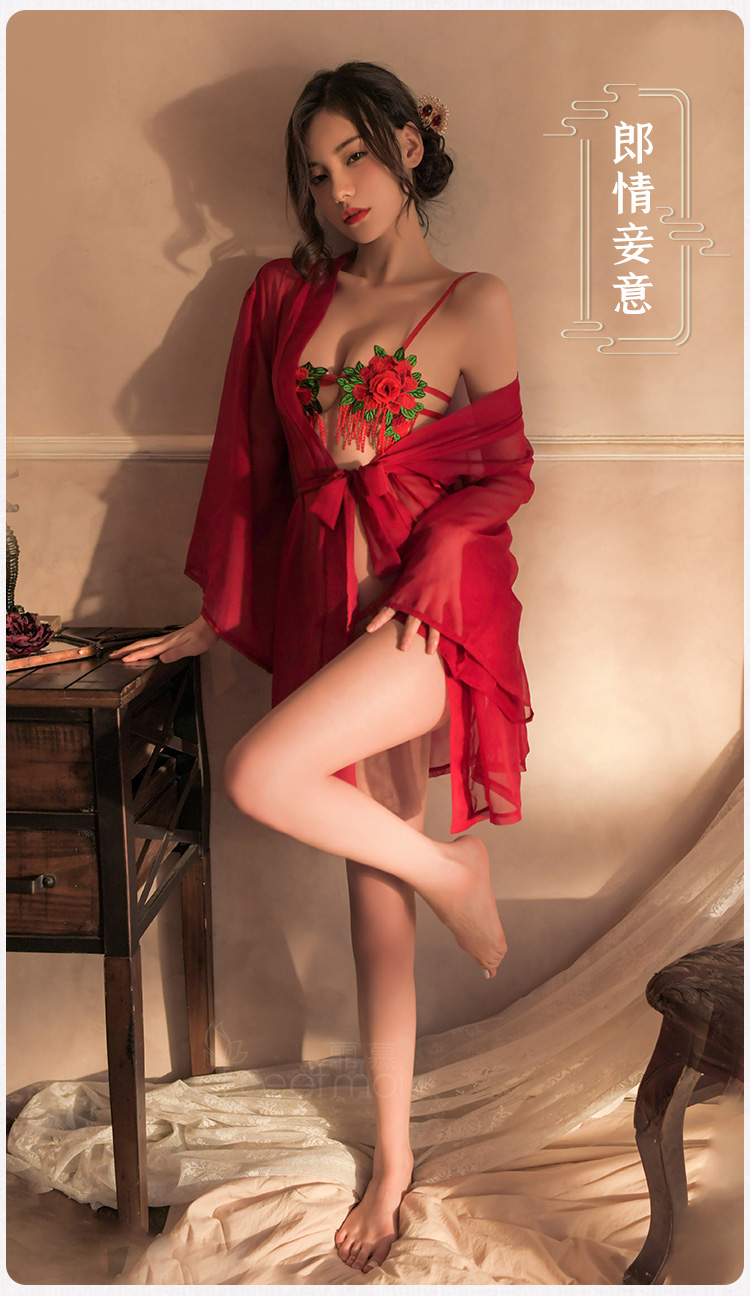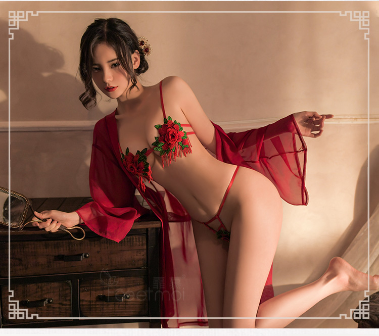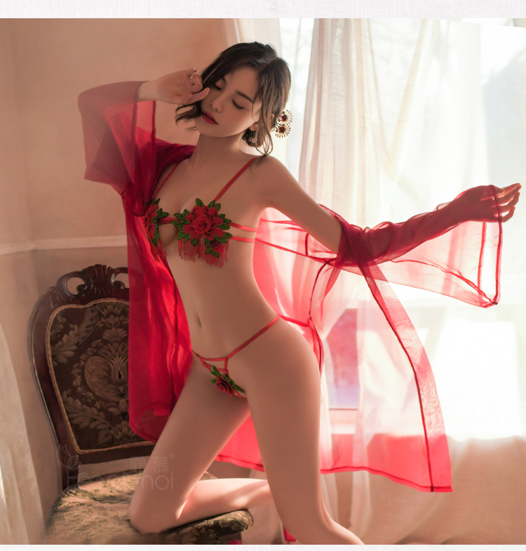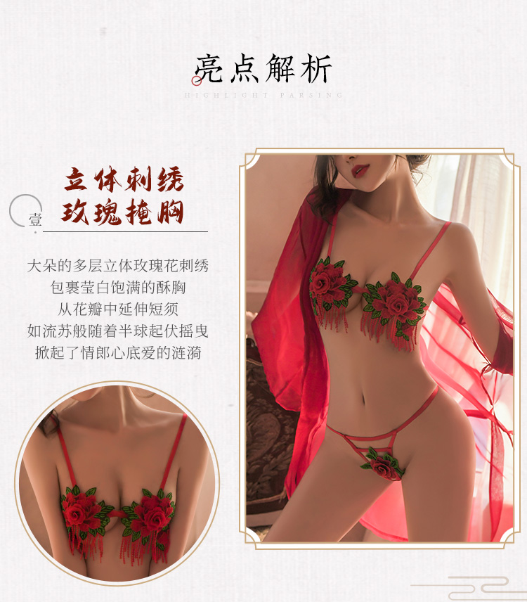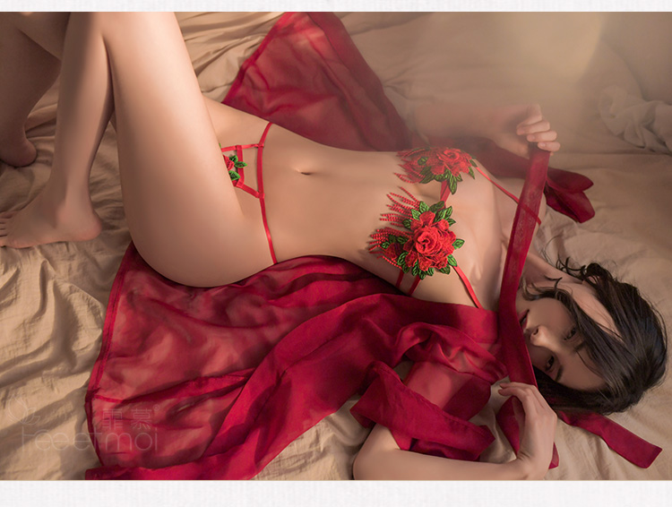 【玫•攻】情趣内衣 诱惑 制服 玫瑰 刺绣 三点式 睡袍 套装 衣服 7989