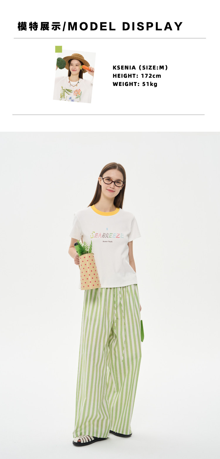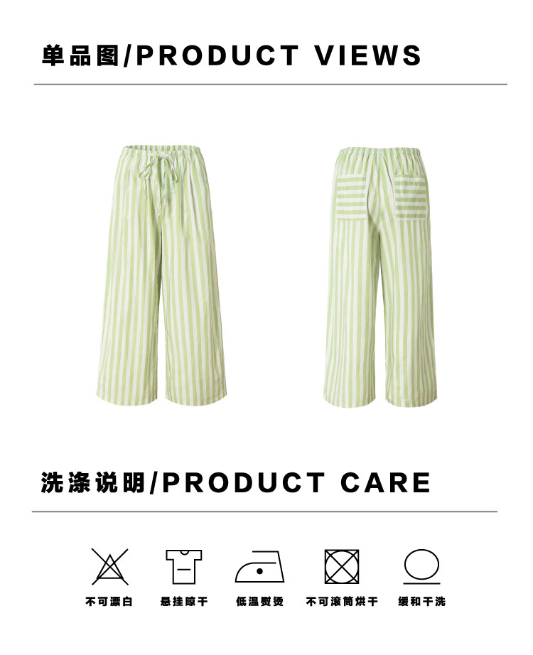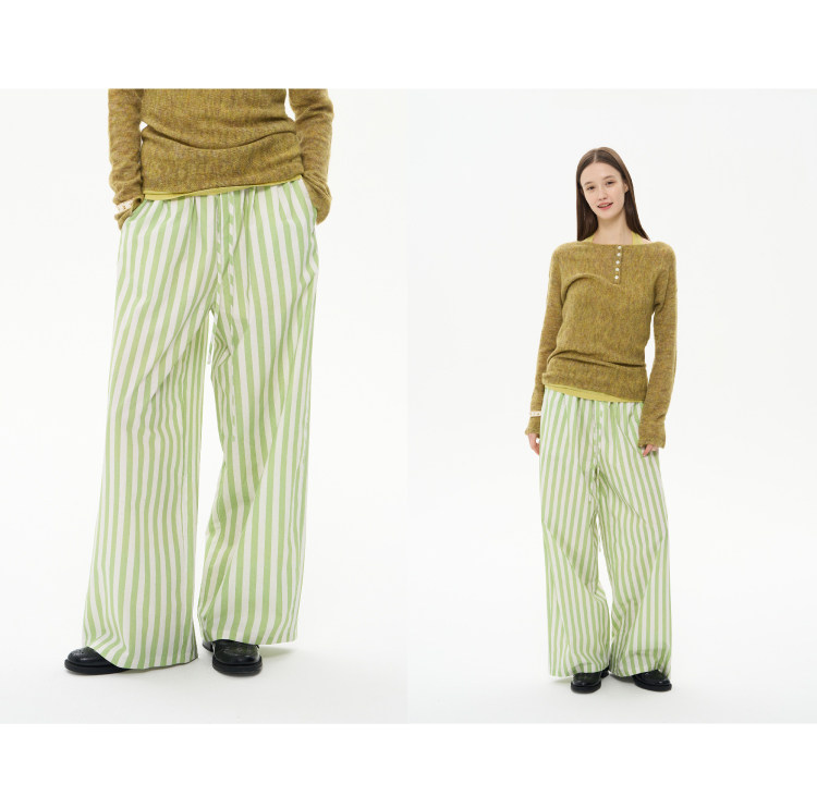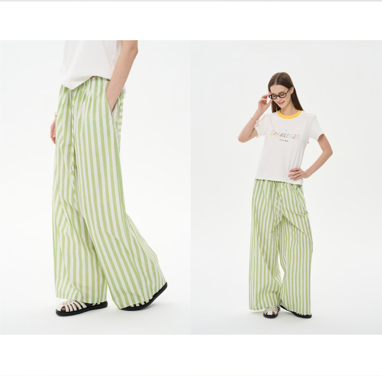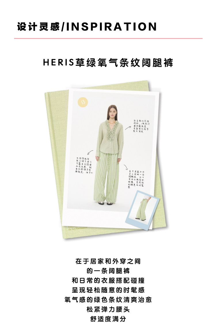 heris/H61131/“氧气”草绿条纹 抽绳松紧腰休闲 宽松直筒阔腿裤
