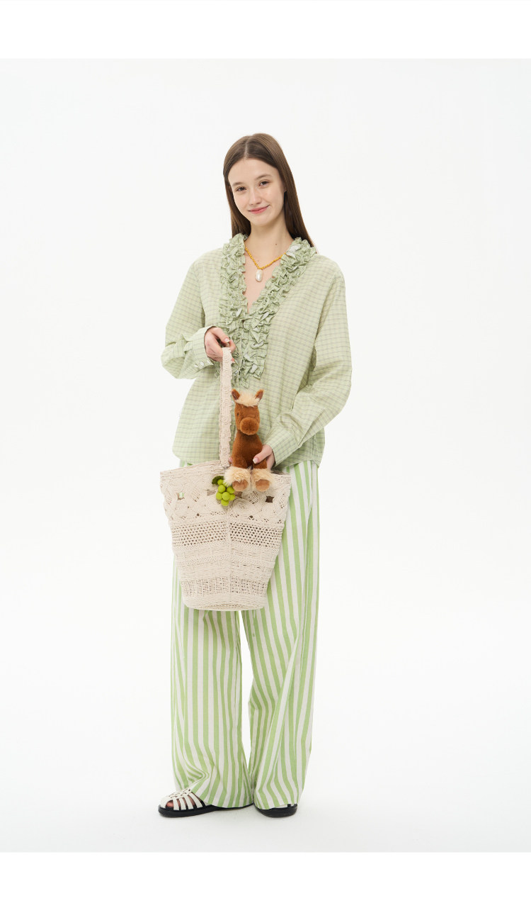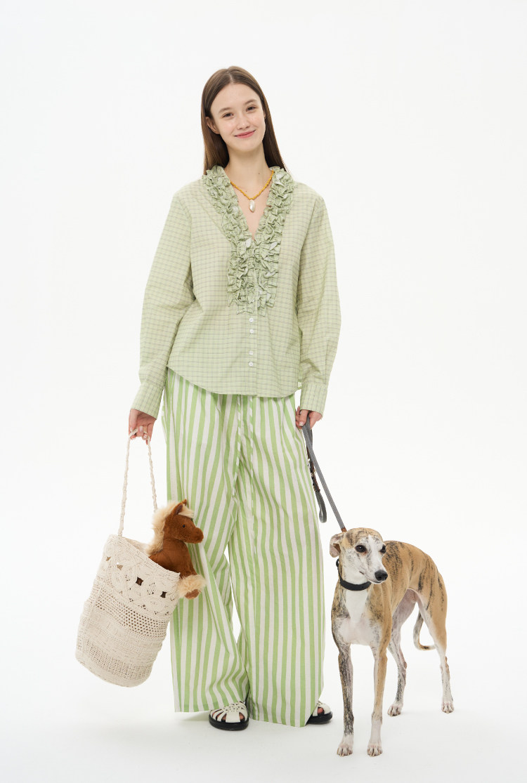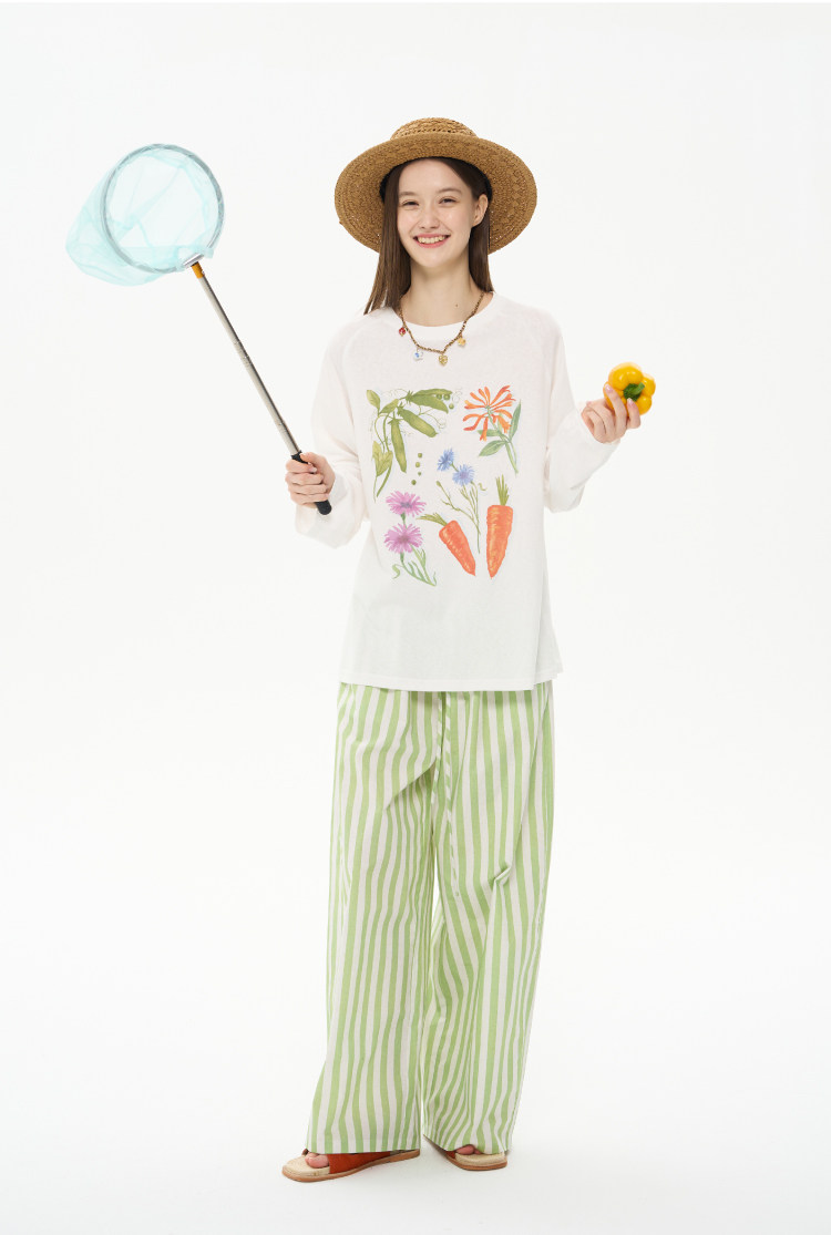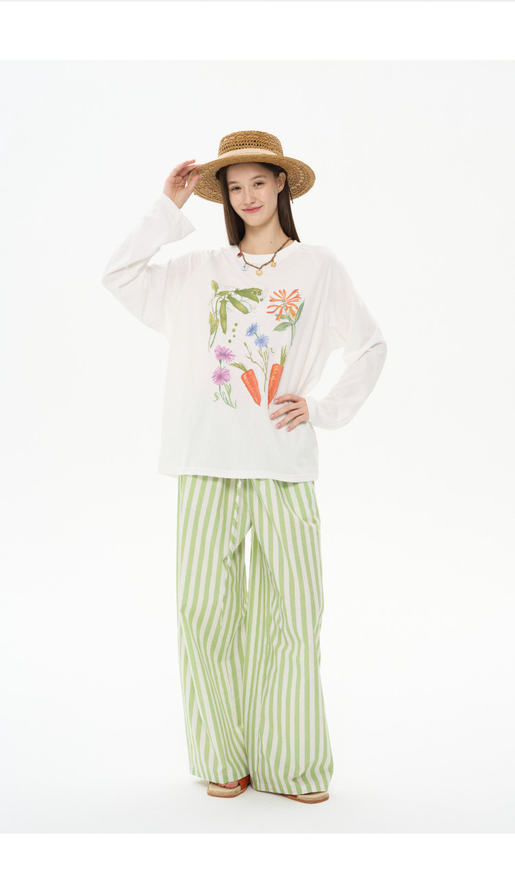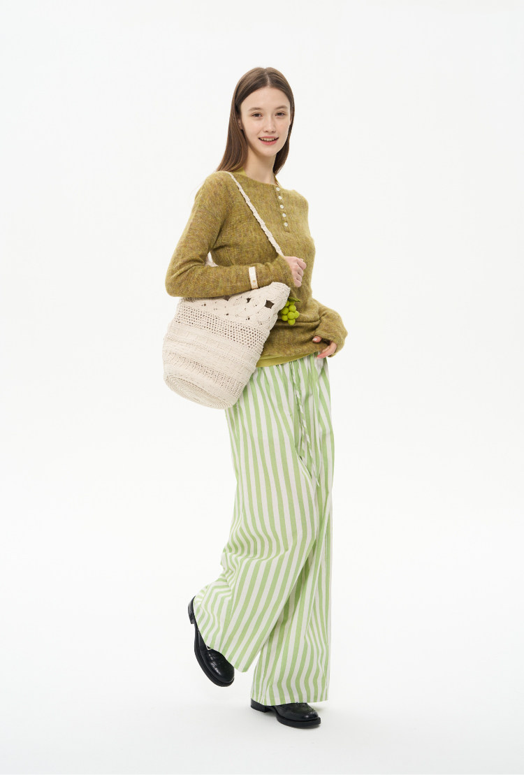 heris/H61131/“氧气”草绿条纹 抽绳松紧腰休闲 宽松直筒阔腿裤