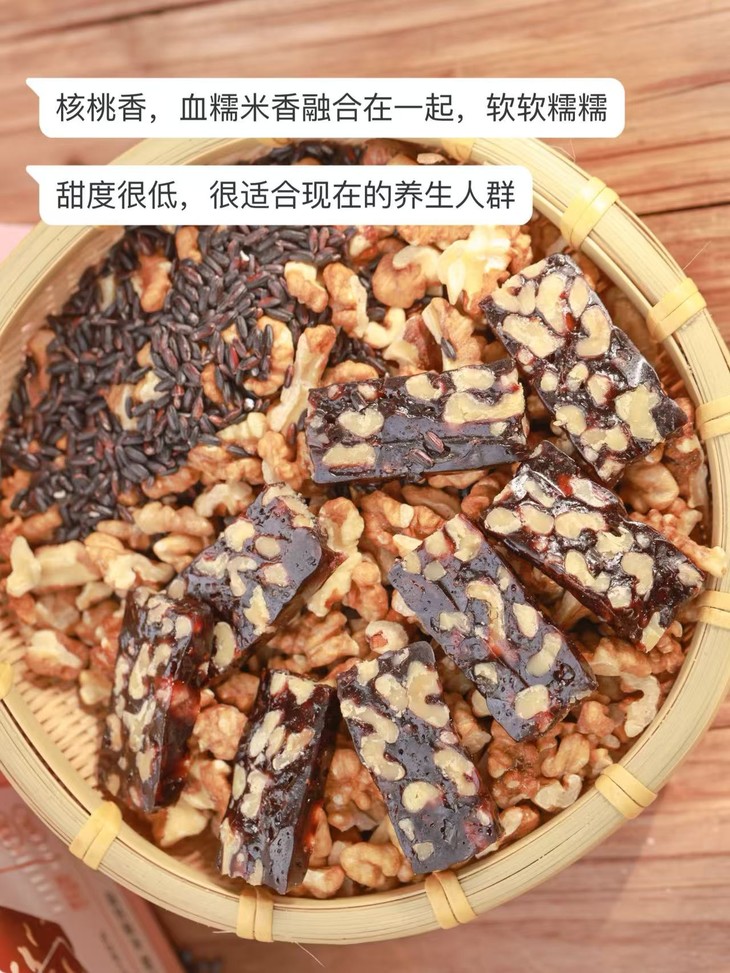 【血糯米核桃糕】满满都是血糯米和核桃仁,一口就能吃下所有营养,因而也被称为植物版“阿胶糕”。以血糯米为主料,以核桃仁为辅料,配料干净,放心吃。