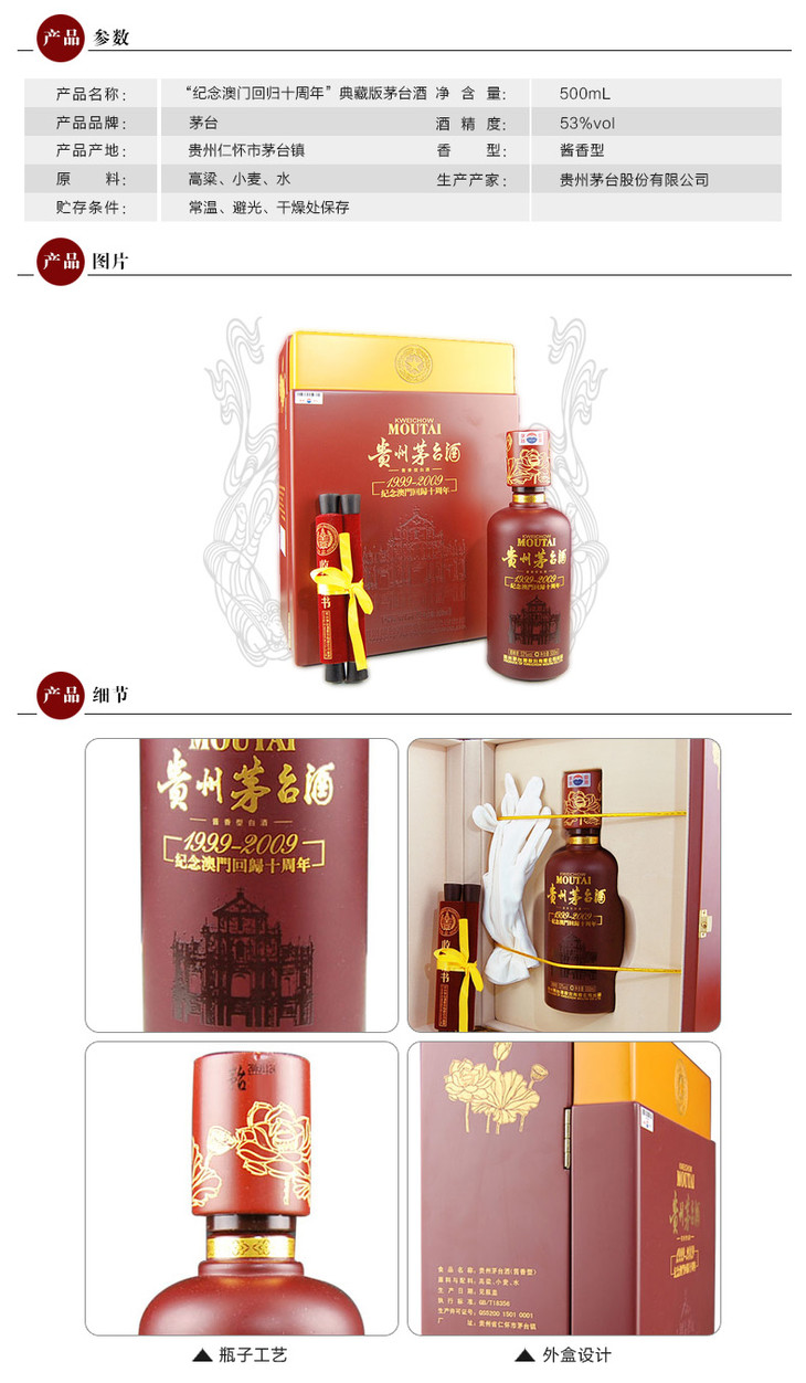 53度“纪念澳门回归十周年”典藏版茅台酒500ml