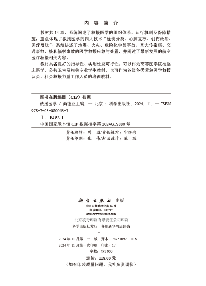 救援医学 商德亚主编 救援医学的四大技术 救援应急与处置 可作为各级各类紧急医学救援队员 社会救援力量工作人员的培训教材