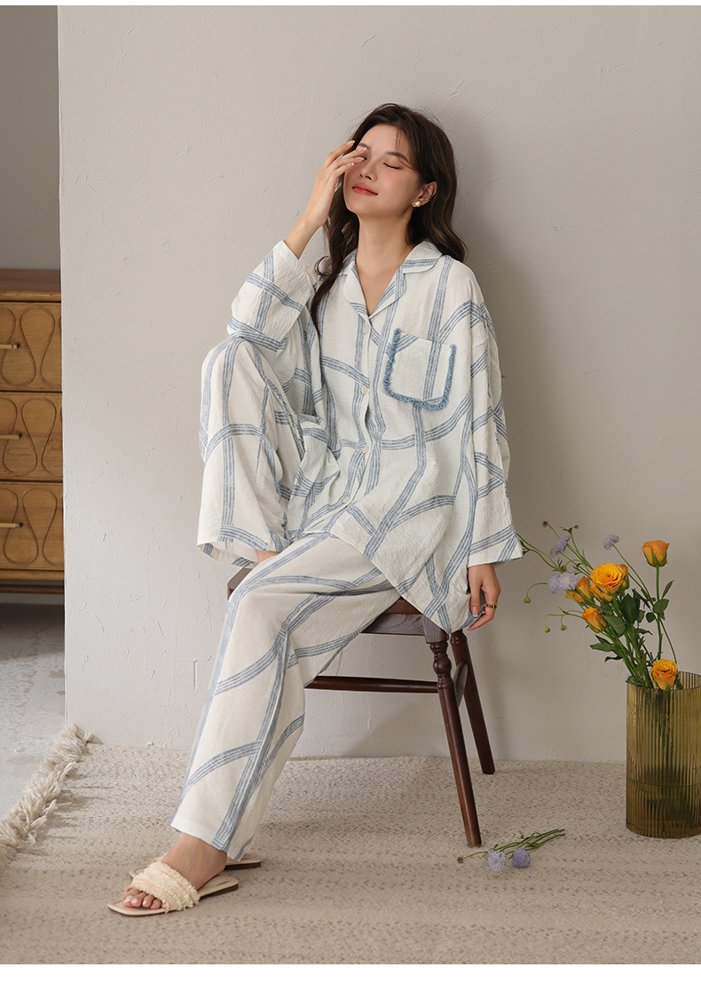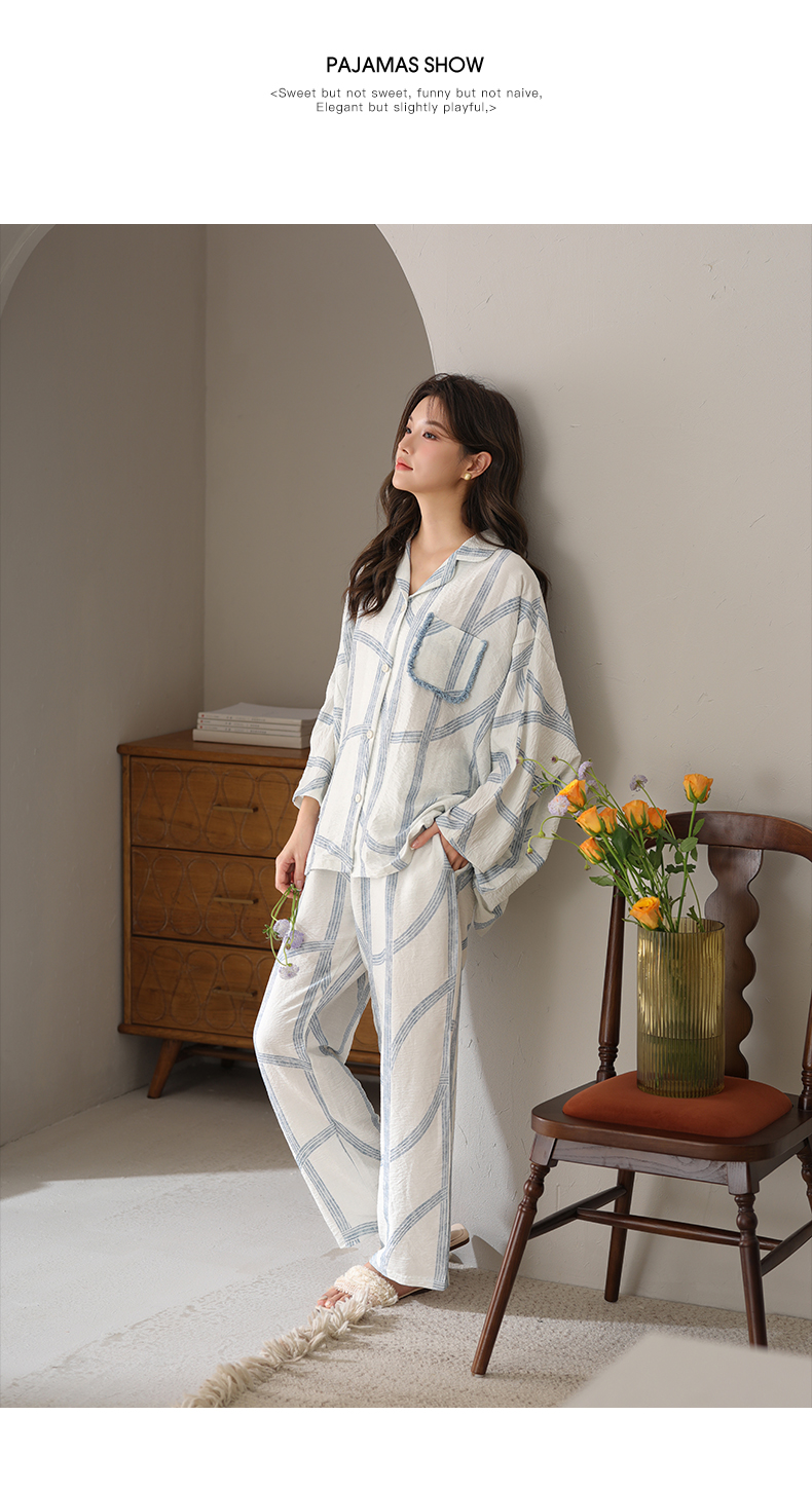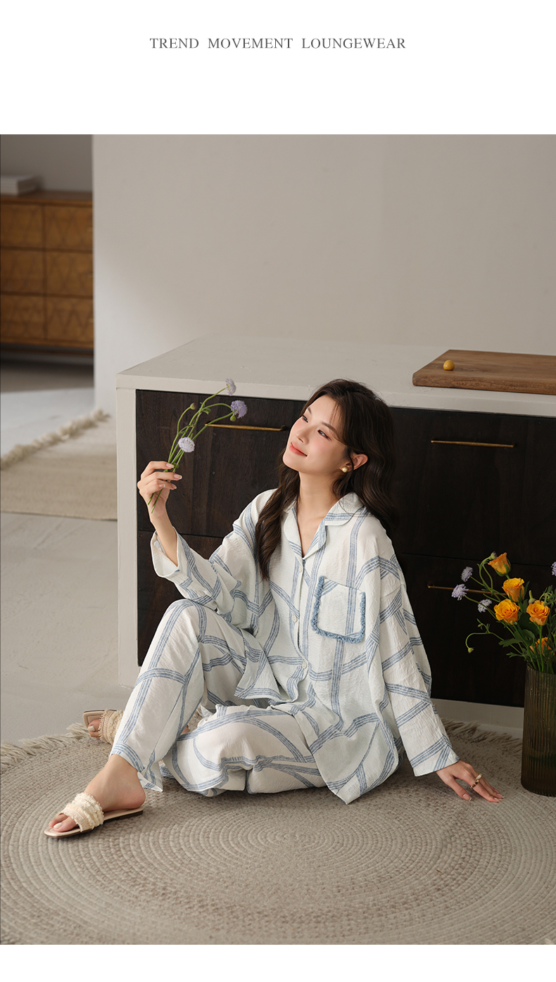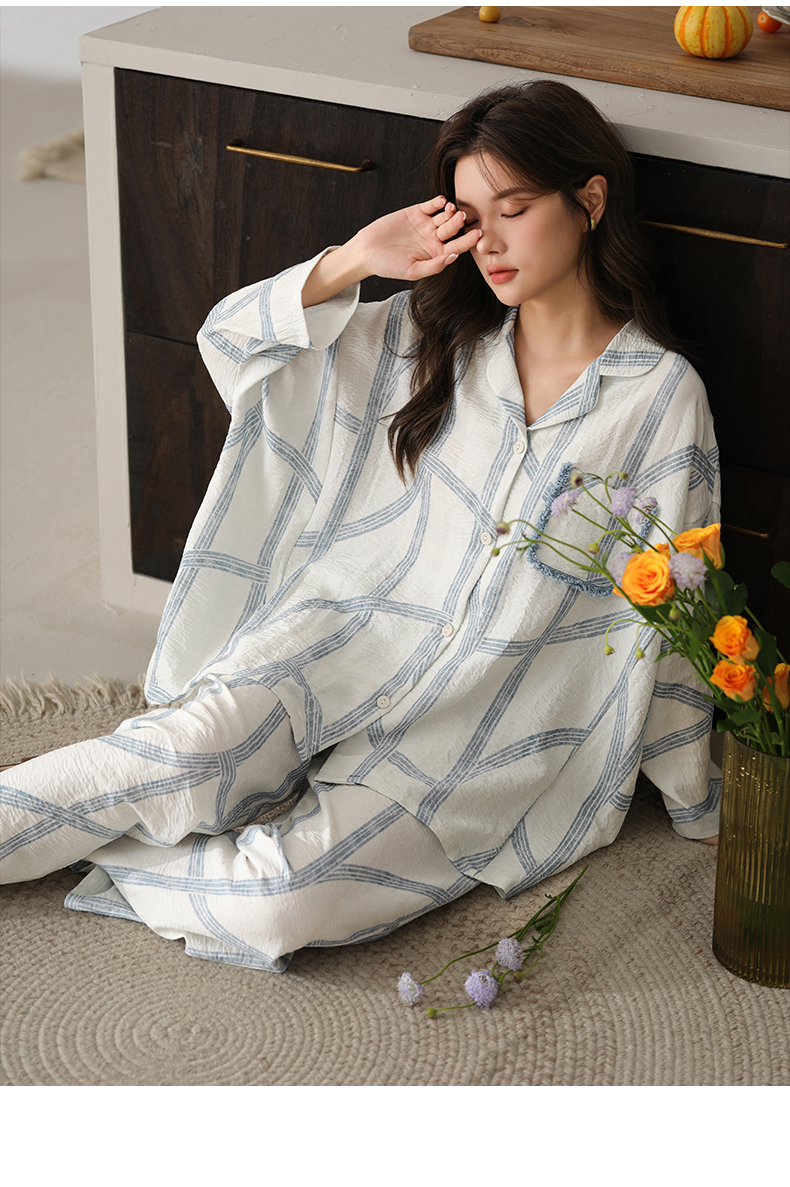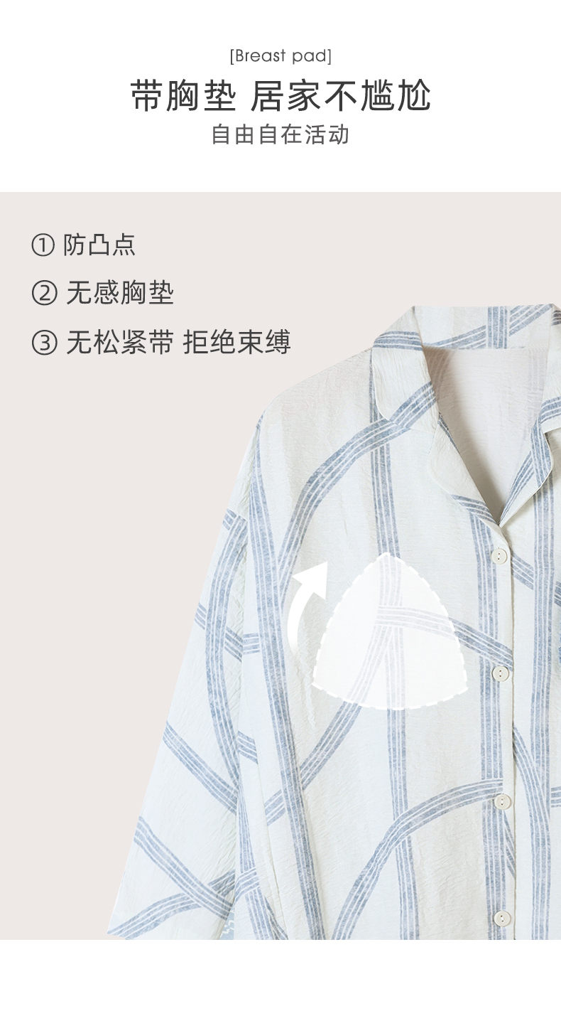 可人儿春秋季带胸垫泡泡绵女士长袖长裤睡衣可外出小众家居服套装