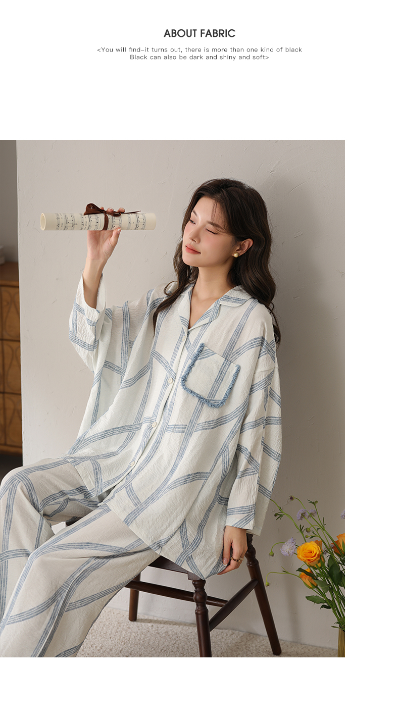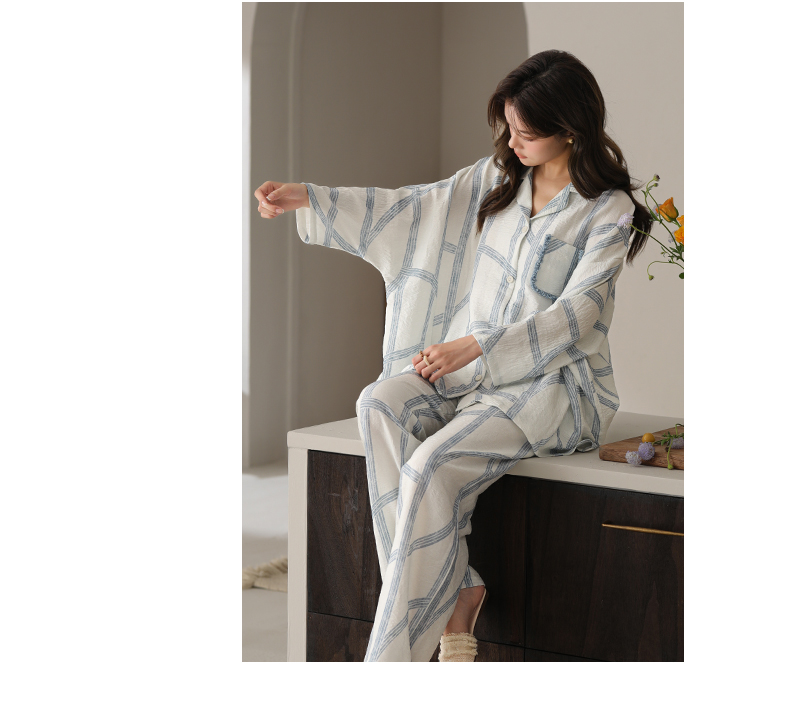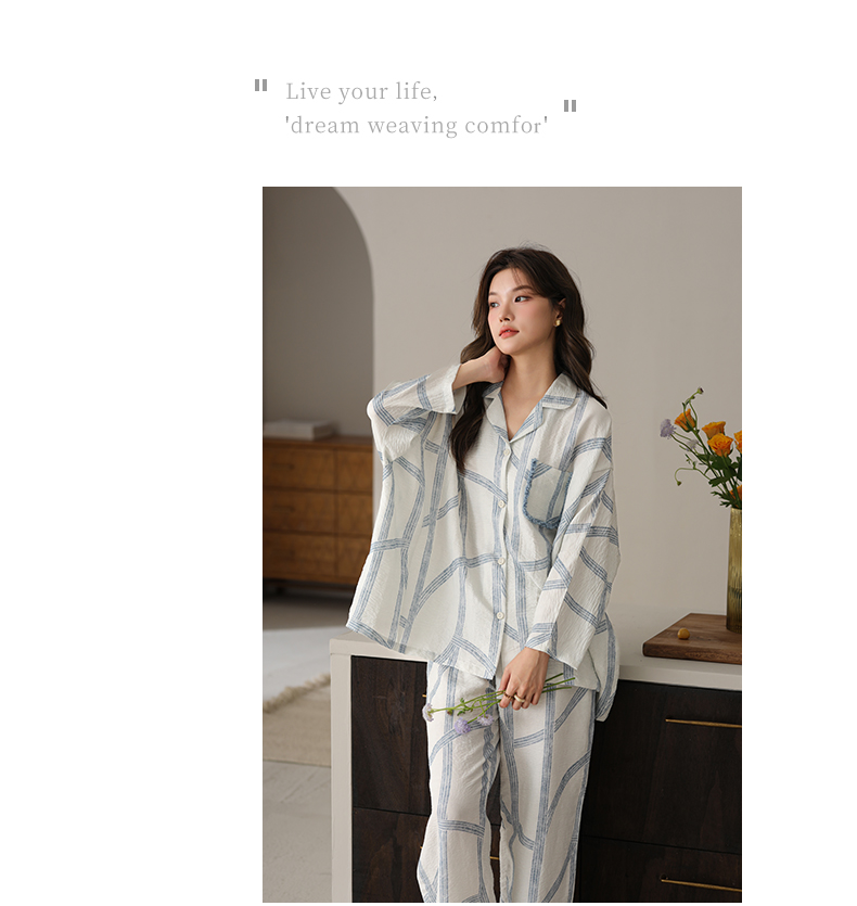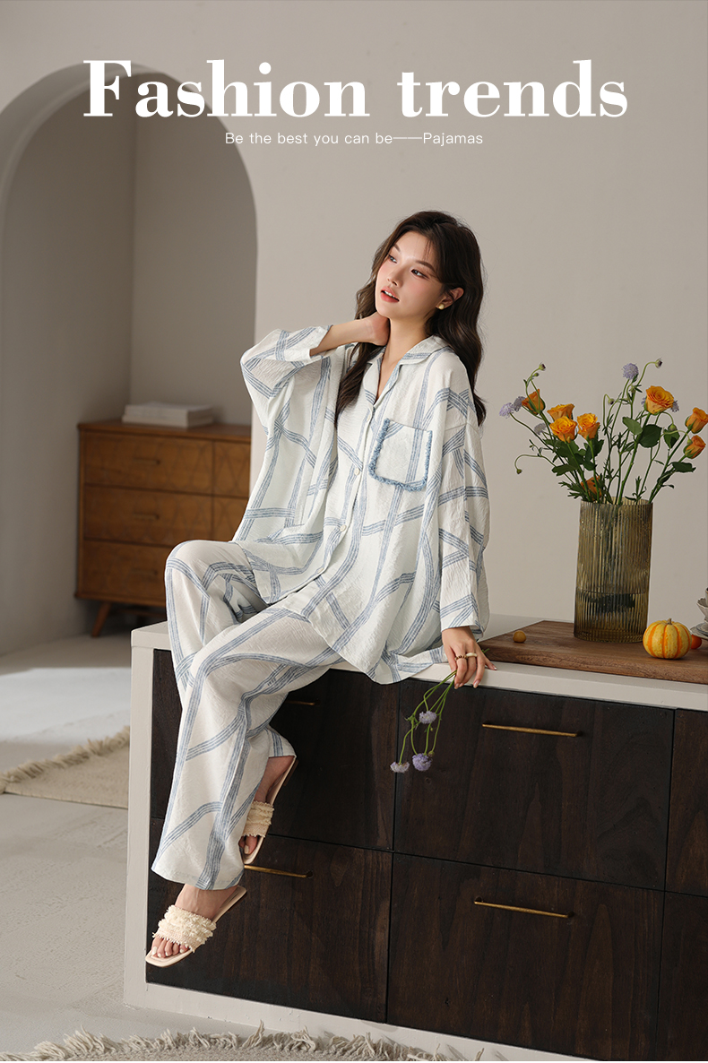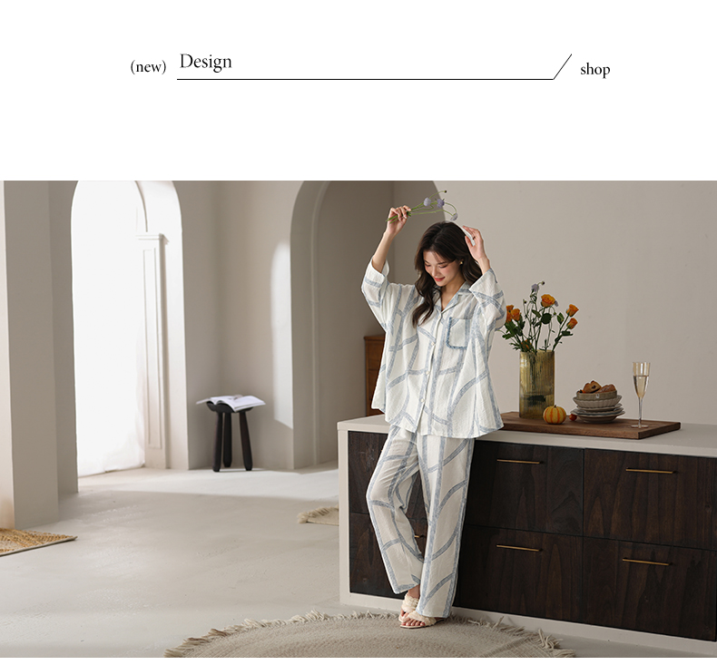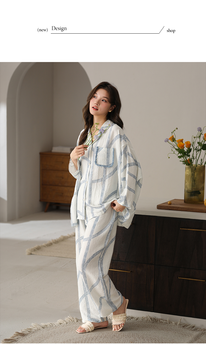 可人儿春秋季带胸垫泡泡绵女士长袖长裤睡衣可外出小众家居服套装