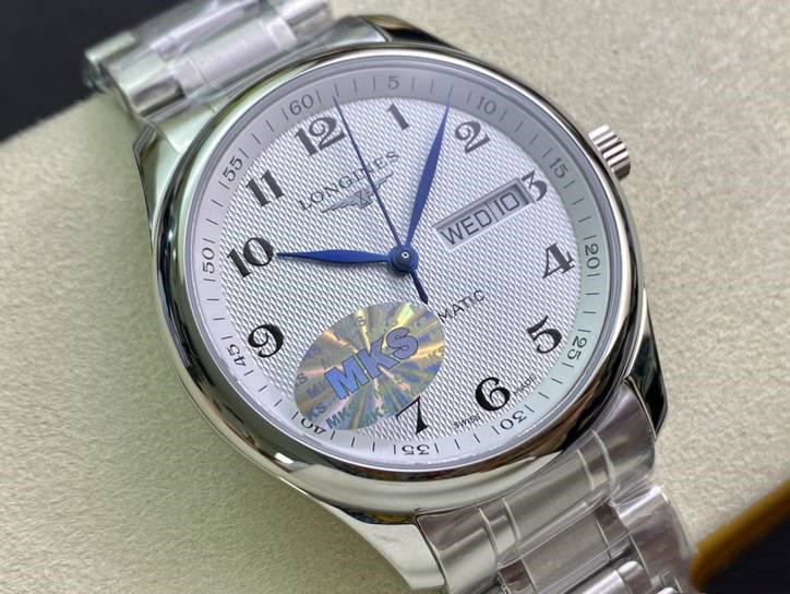 从整体上来看,MKS厂浪琴名匠双历还原度做得非常不错,外壳抛光工艺处理和正品几乎无差异,搭配的防刮蓝宝石水晶镜面,十分通透明亮。经典的银色"麦粒"饰纹表盘、蓝钢指针细节处理工艺精湛。