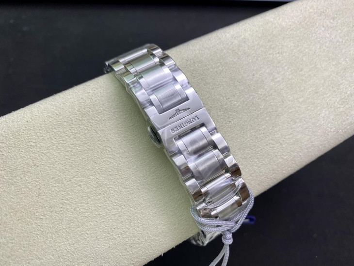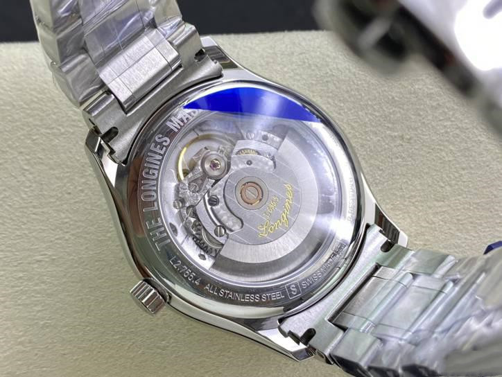 表侧的抛光工艺处理非常细腻、线条清晰流畅,弧度感十足。表冠上的浪琴LOGO非常立体清晰,还原度极高,表壳纤薄的厚度也完美符合正品。