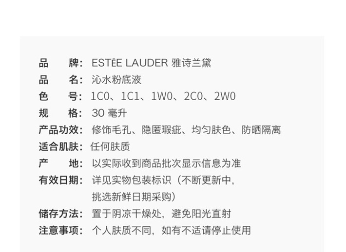 【保税仓】ESTĒE LAUDER 雅诗兰黛 全新沁水粉底液30ml 保湿防晒遮瑕 #1C0 #1W0 2C0(新版三代)效期到28年随机发货