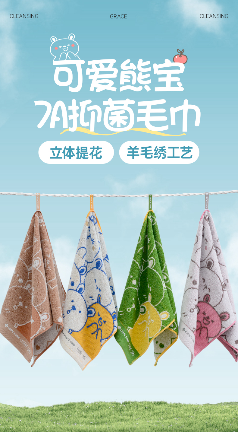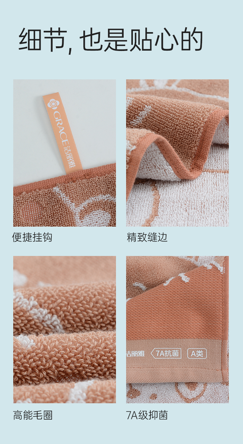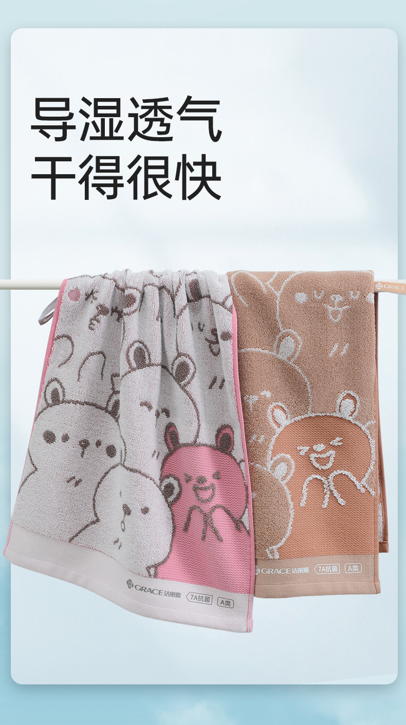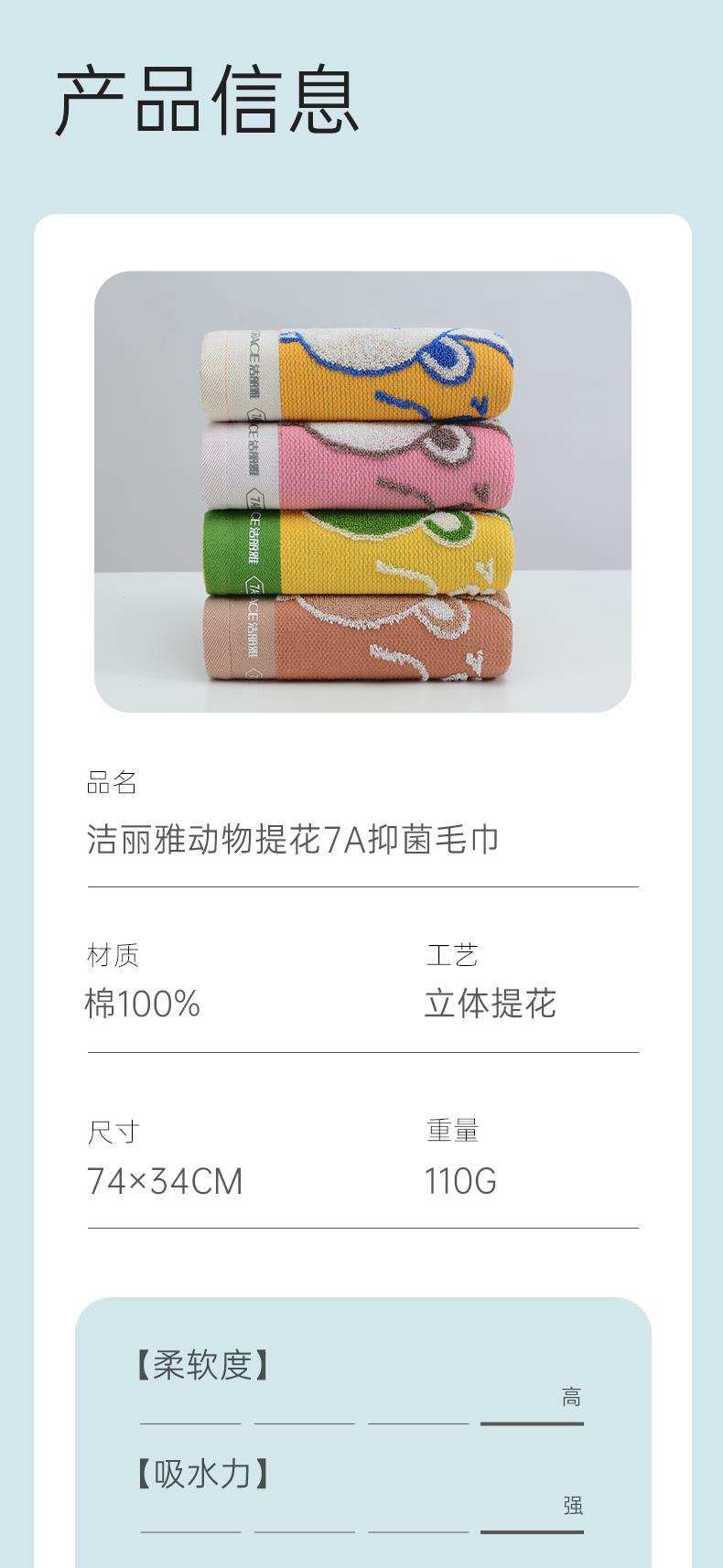 洁丽雅7A抑菌毛巾INS精梳提花新疆棉2024新款动物卡通家用洗脸