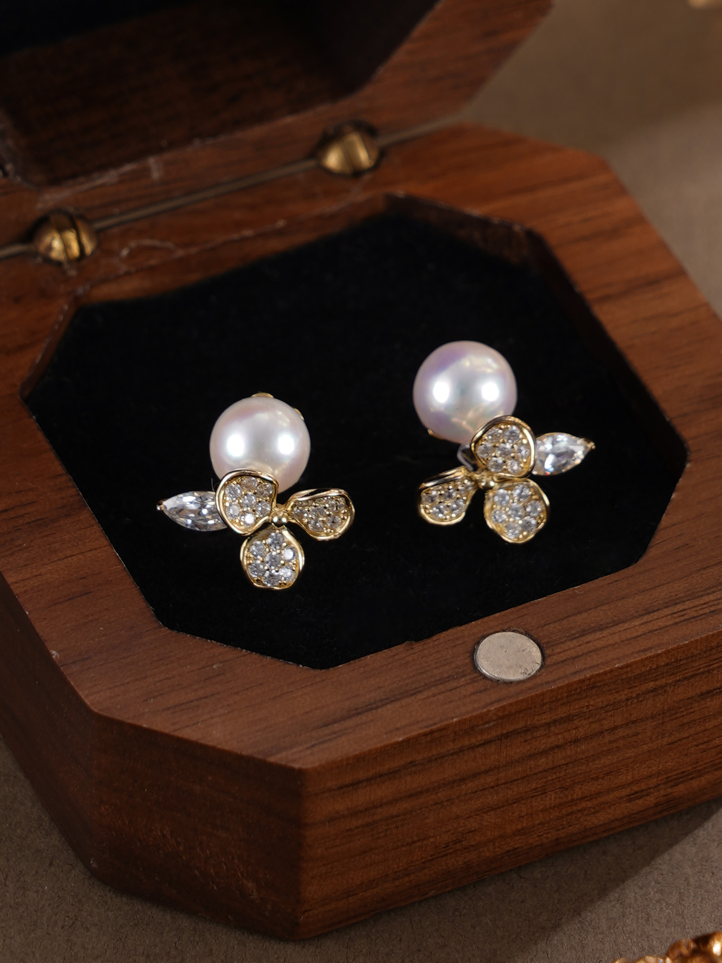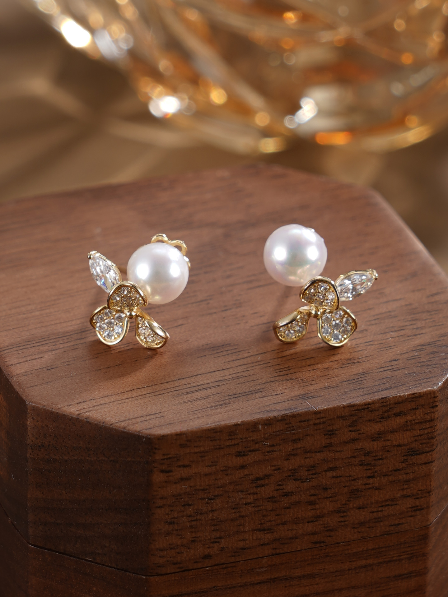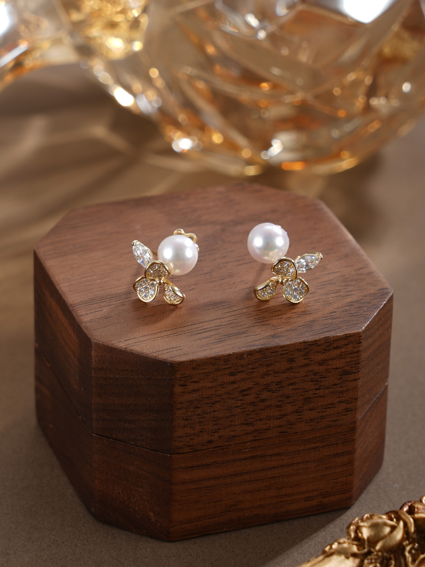 子佩集【三叶曦光】银S925珍珠惜王妃耳钉【XXED013】6mm珠镀金三叶草2601