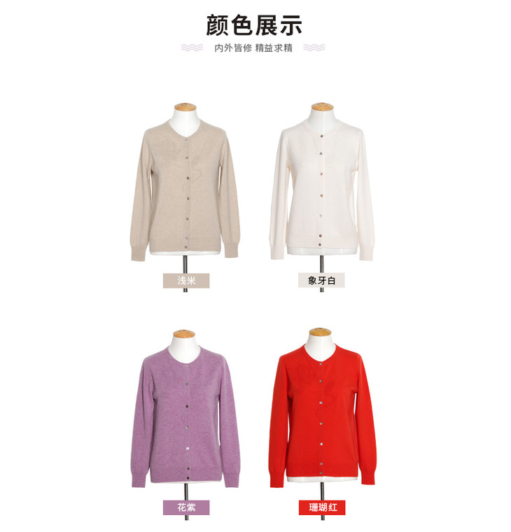 羊绒世家冬新品100%山羊绒圆领开衫女纯色立体提花保暖外搭毛衣