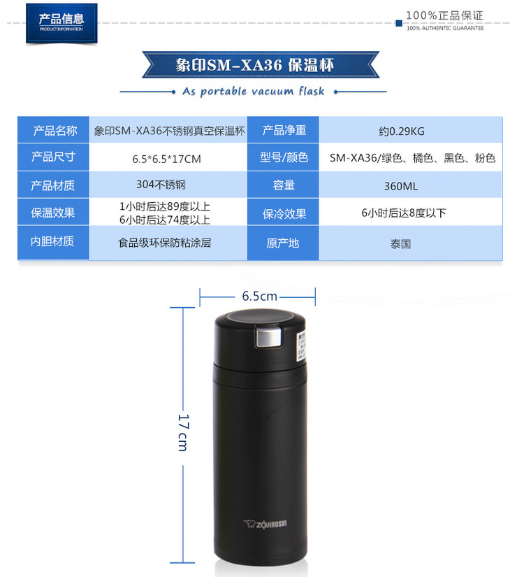 象印不锈钢真空保温杯SM-XA36