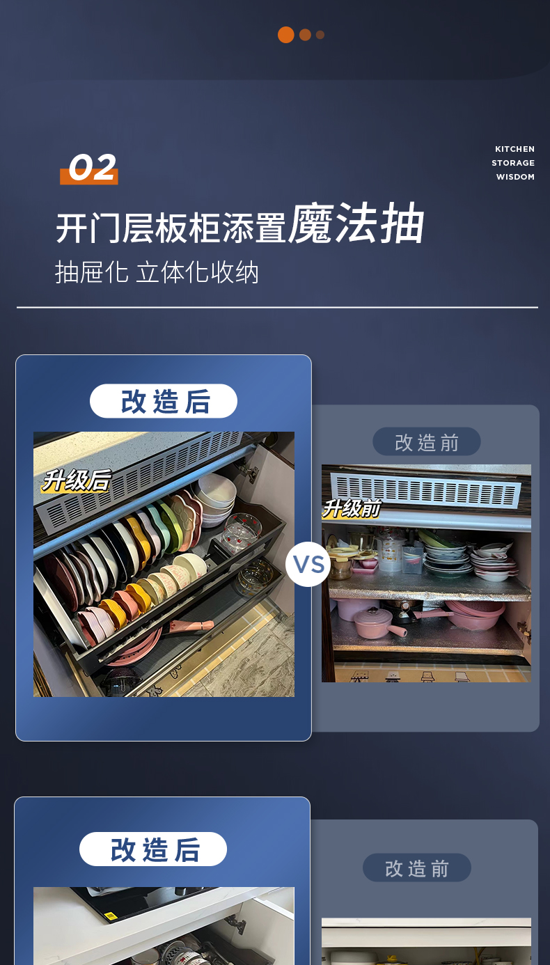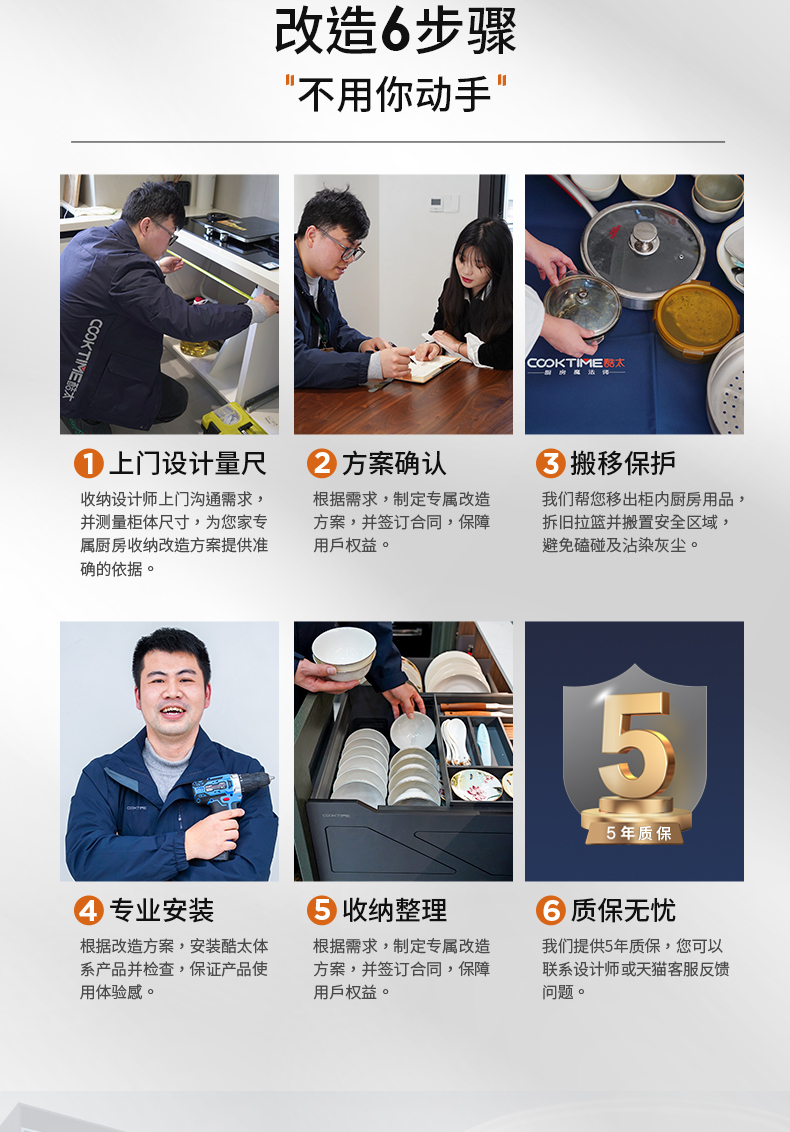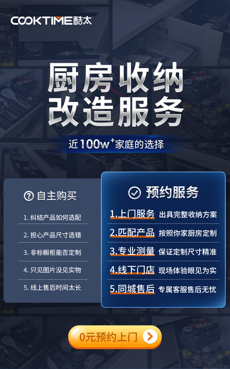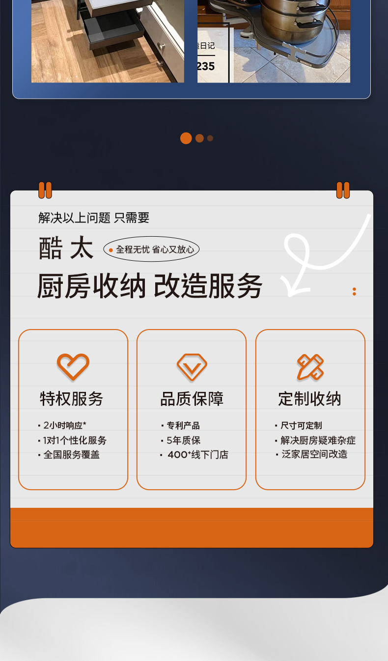 - 酷太坚持8年自主研发,已获得专利证书130项,拥有一套领先市场的厨房收纳系统,为千万中国家庭解决厨房脏乱差,缔造厨房新生活。