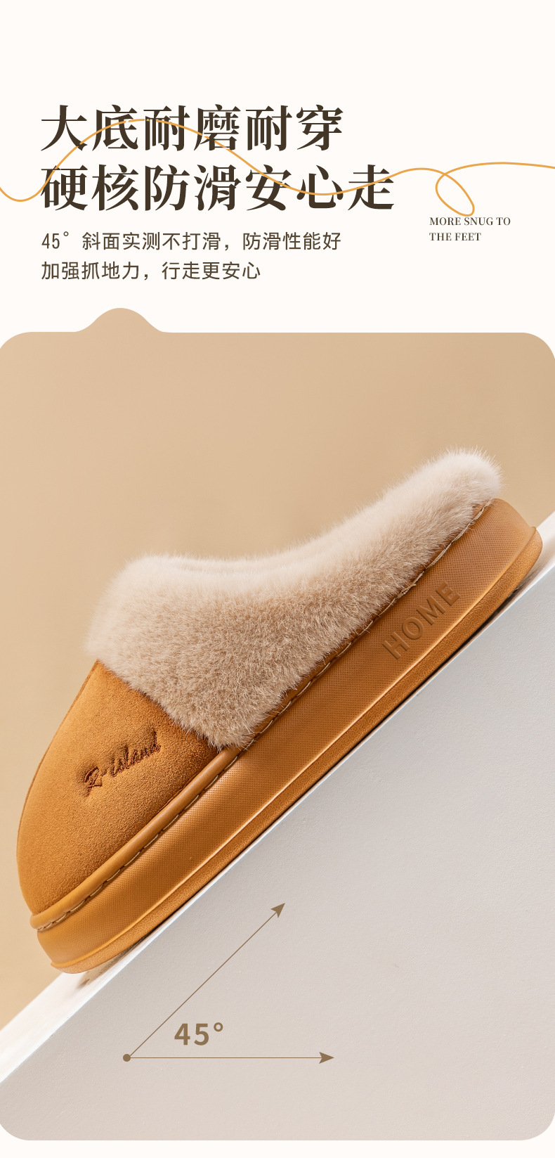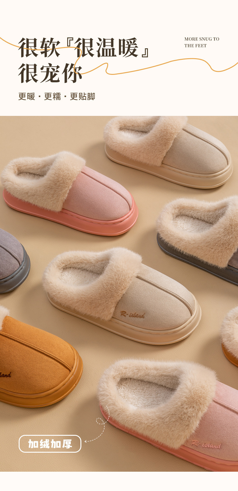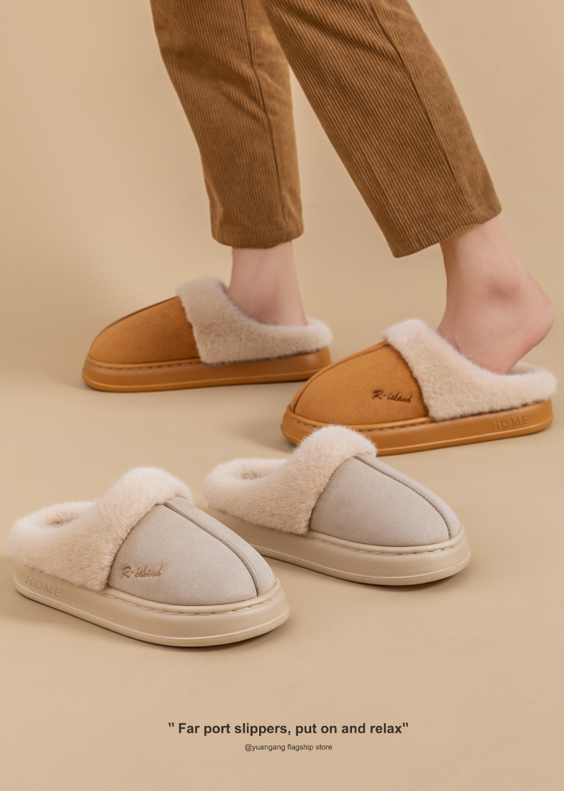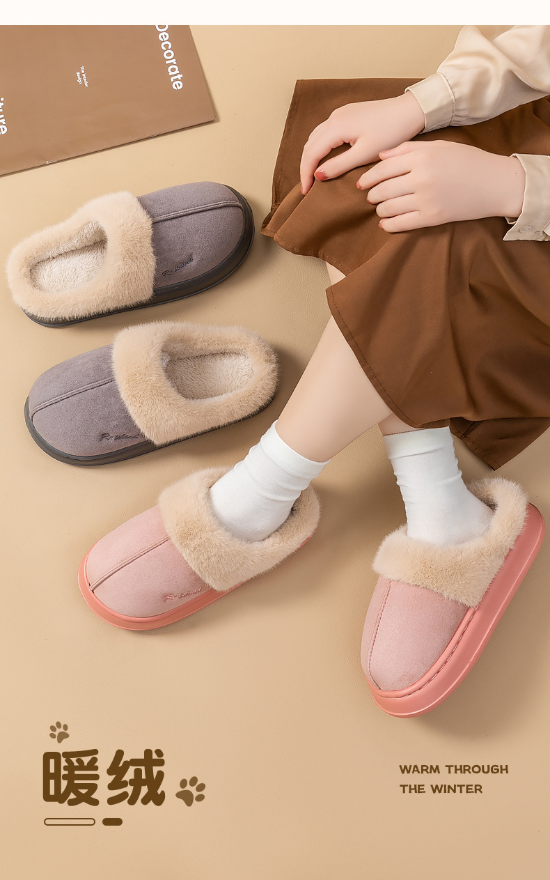 「四色可选!麂皮绒棉拖鞋」女士秋冬季室内厚底防滑拖鞋 办公室居家日用时尚毛毛棉拖鞋