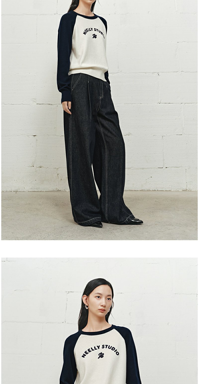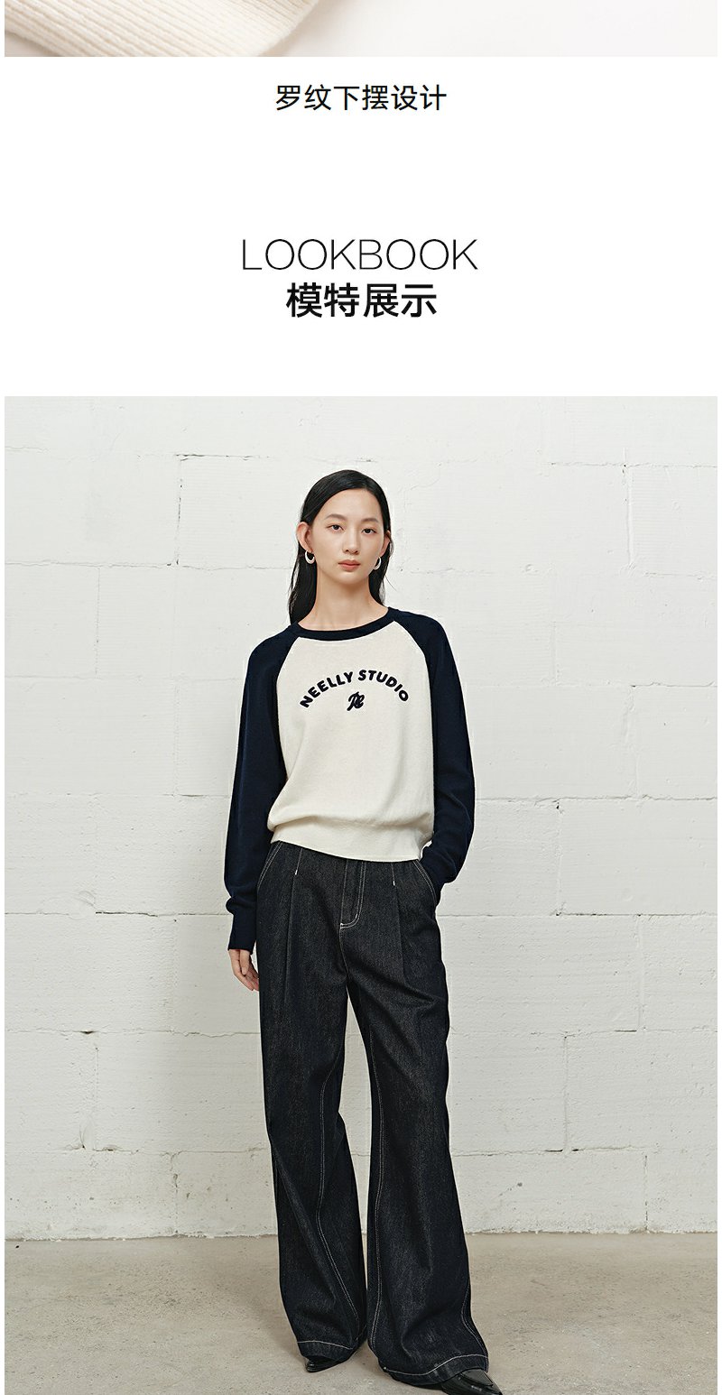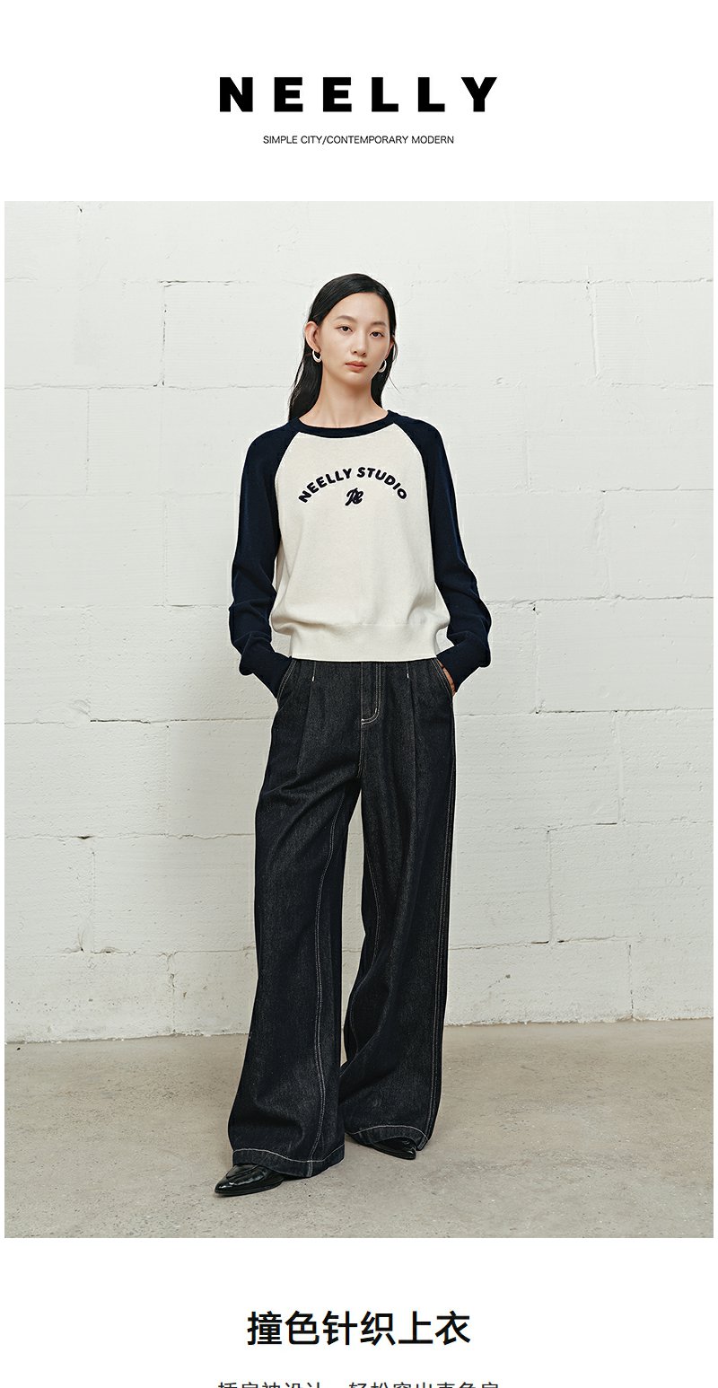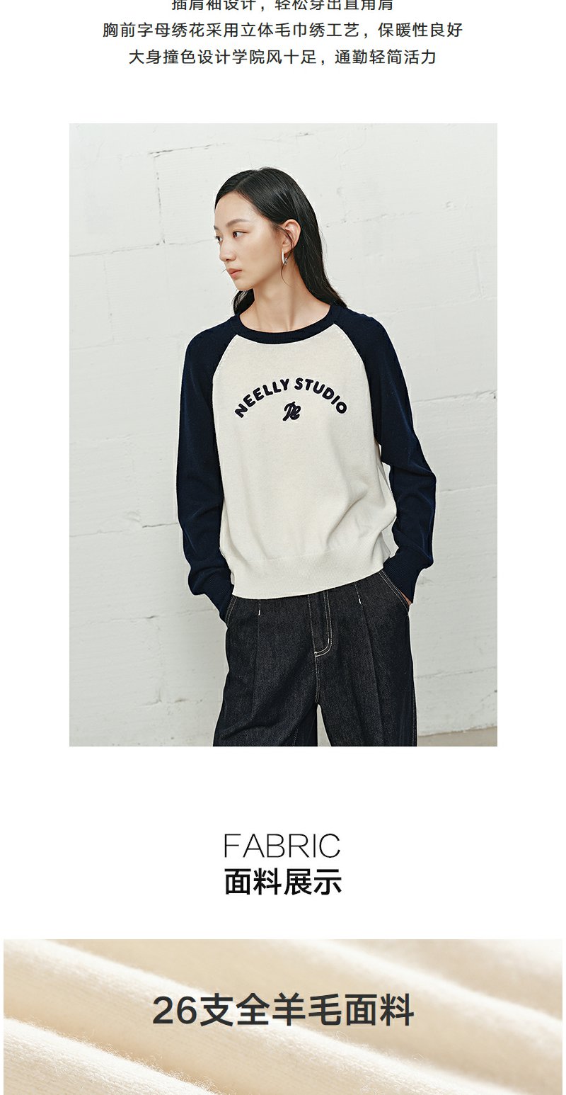 NEELLY纳俪商场同款冬季新款时尚字母插肩袖针织衫女撞色复古上衣N25101A01003