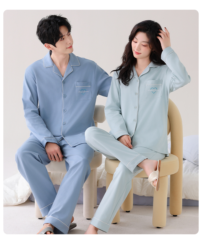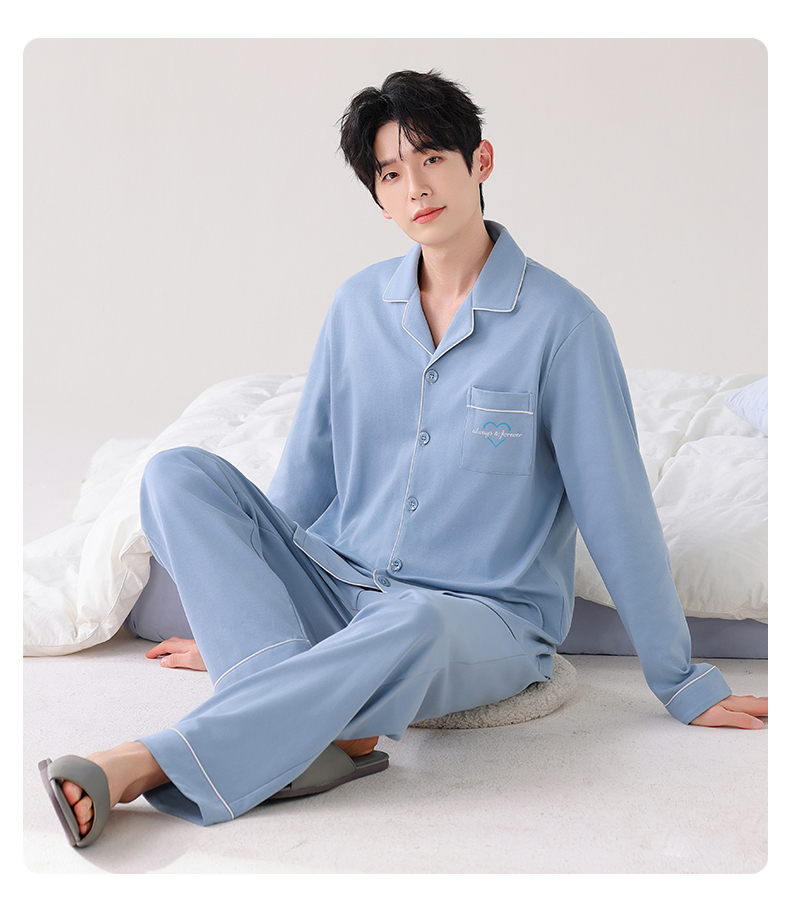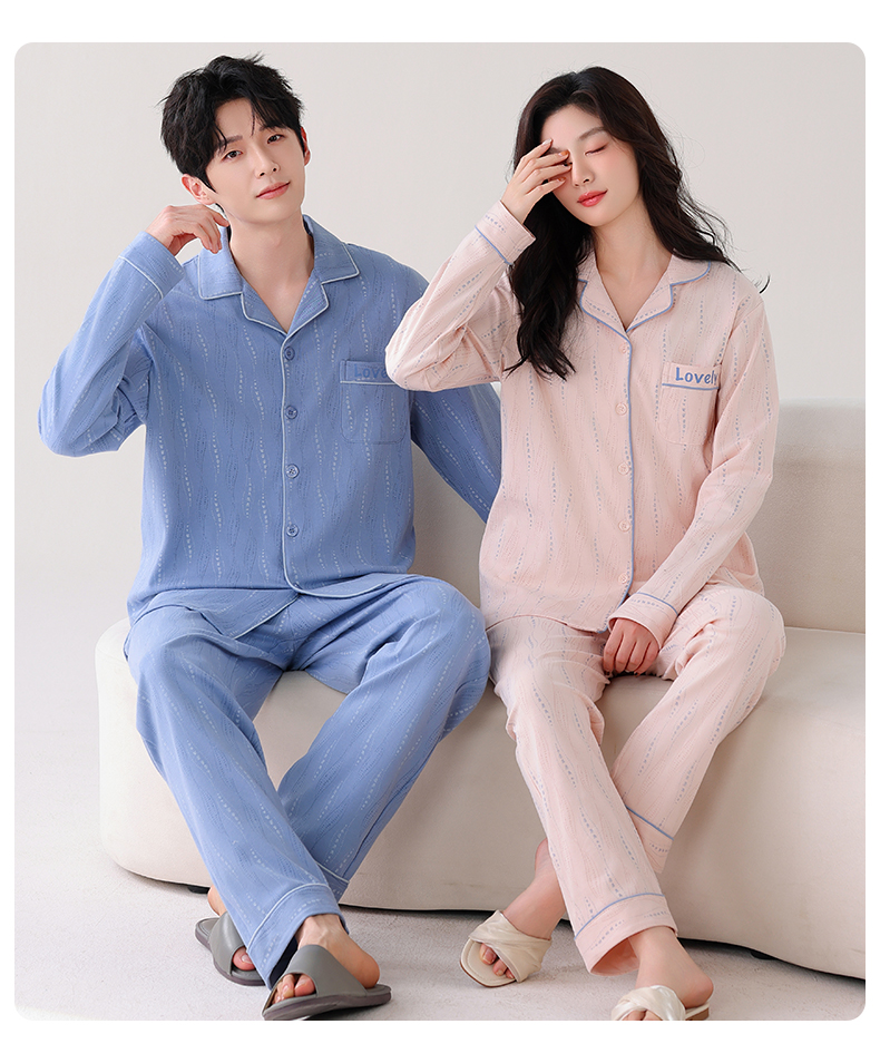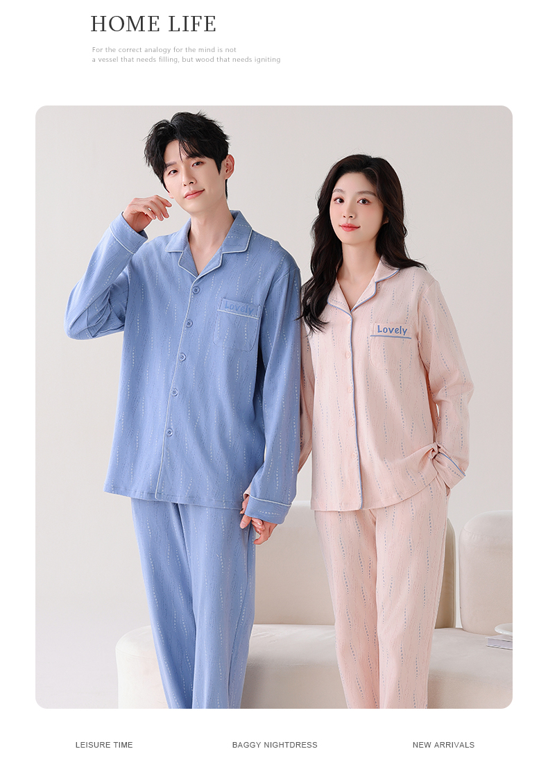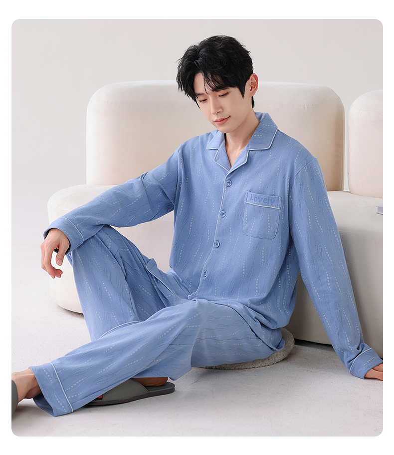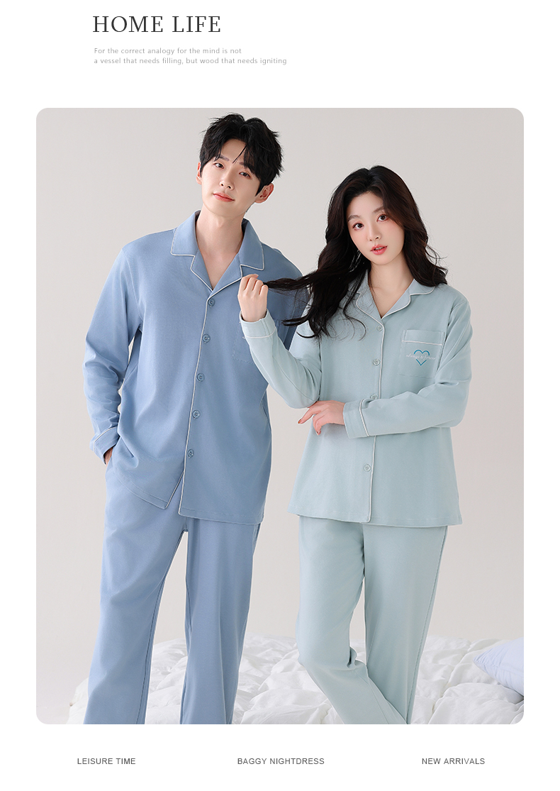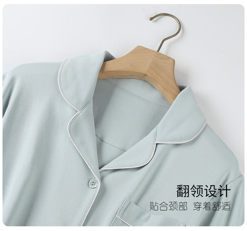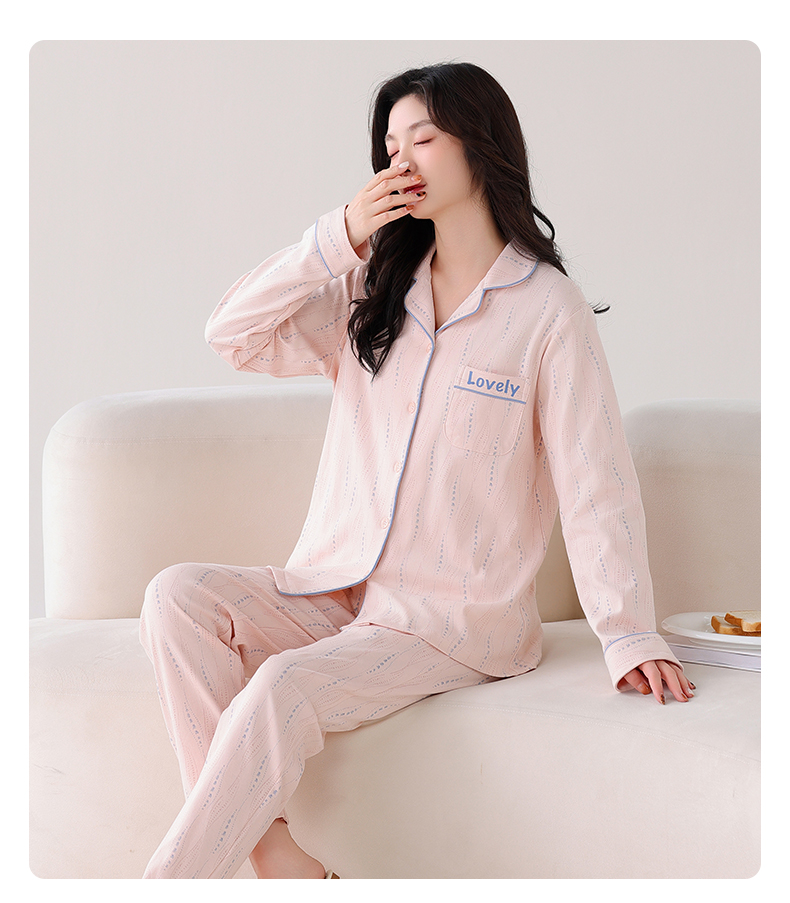 爱帝针织纯棉睡衣长袖长裤翻领开襟家居套