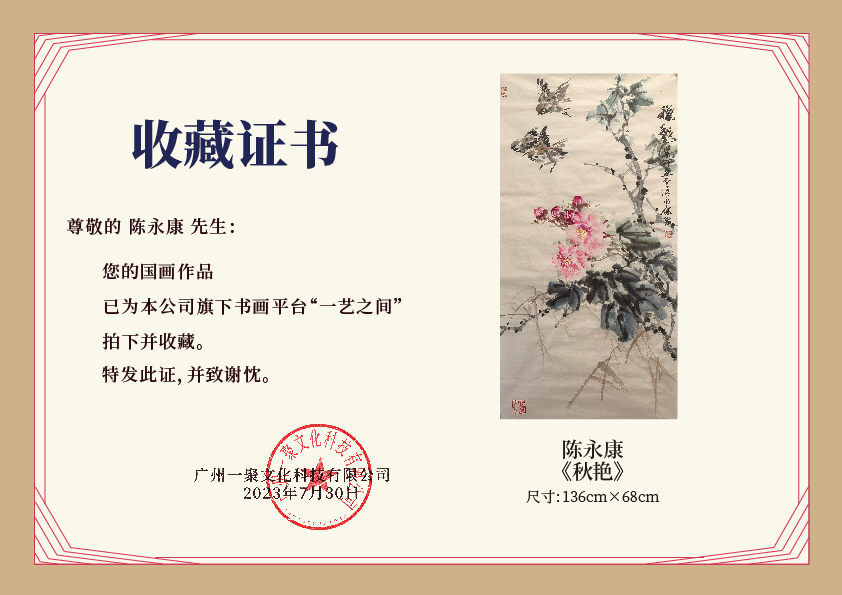 注意:下方收藏证书仅为微信视频号官方要求示意在“一艺之间”下单销售产品均为老师本人授权正版,并非随单赠送,敬请理解。