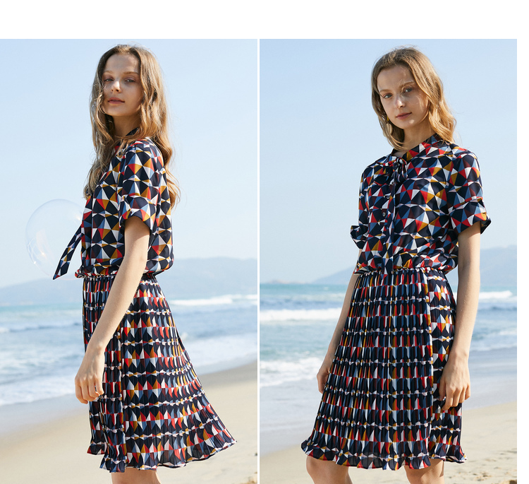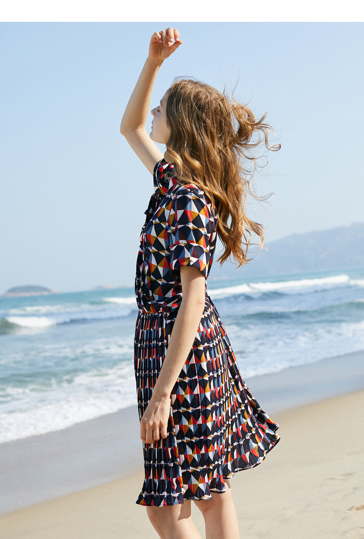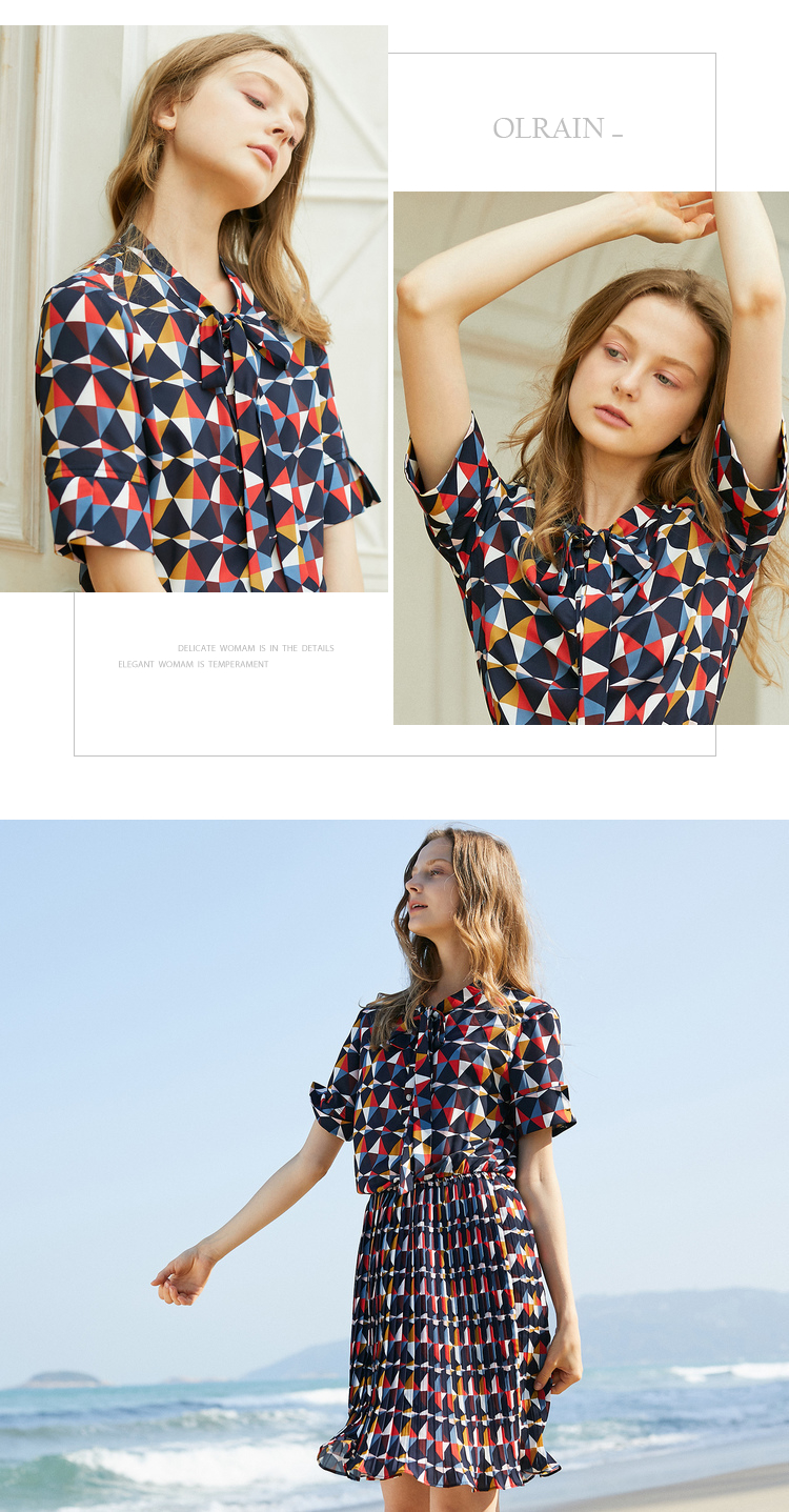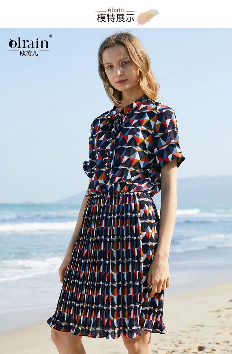 欧芮儿2018夏装收腰系带短袖图案印花连衣裙女中长款