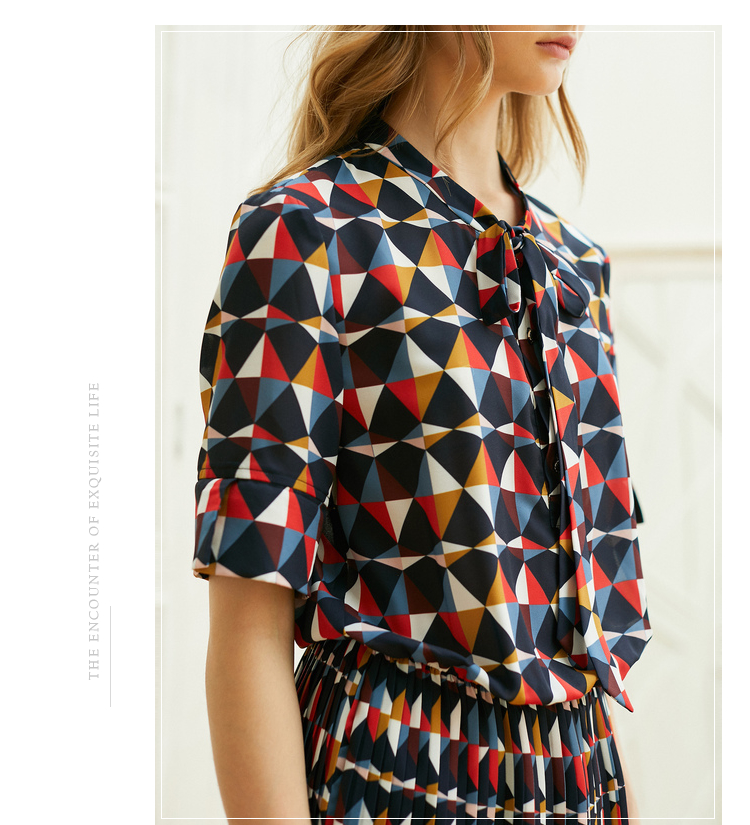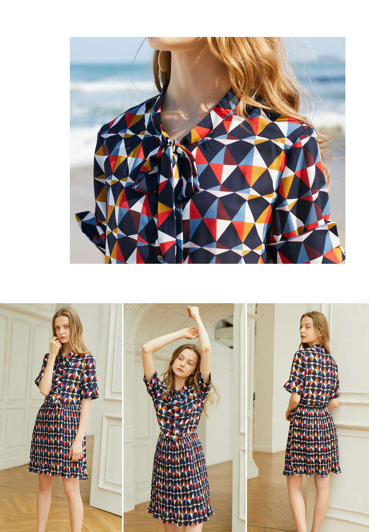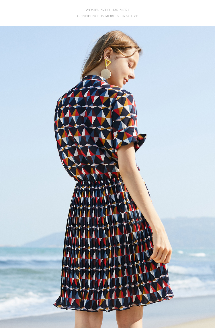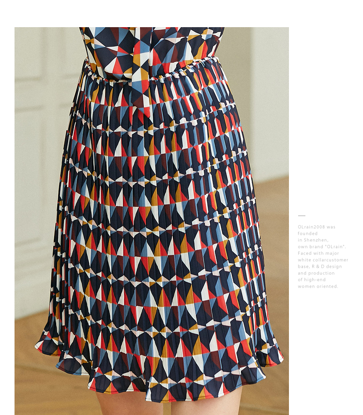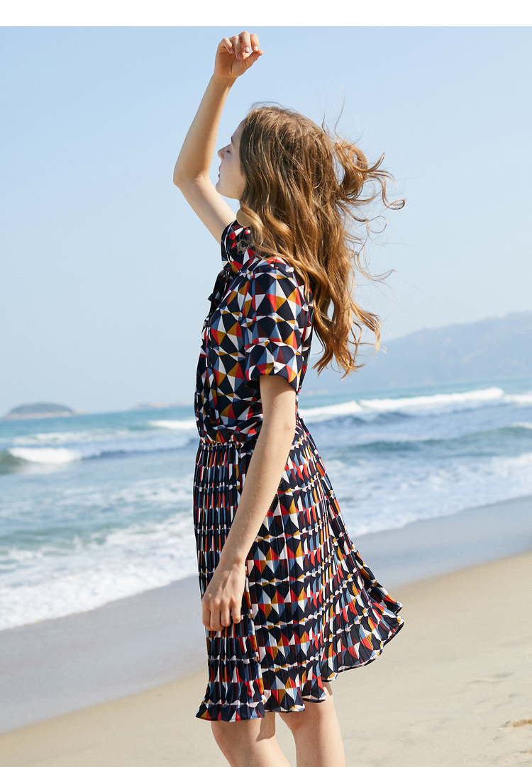 欧芮儿2018夏装收腰系带短袖图案印花连衣裙女中长款
