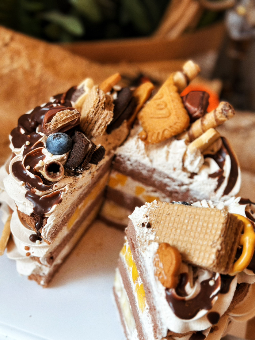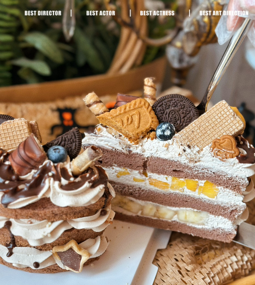 新派阿华田蛋糕,法芙娜巧克力蛋糕体,芒果香蕉夹心,满满巧克力装饰, 超幸福超满足