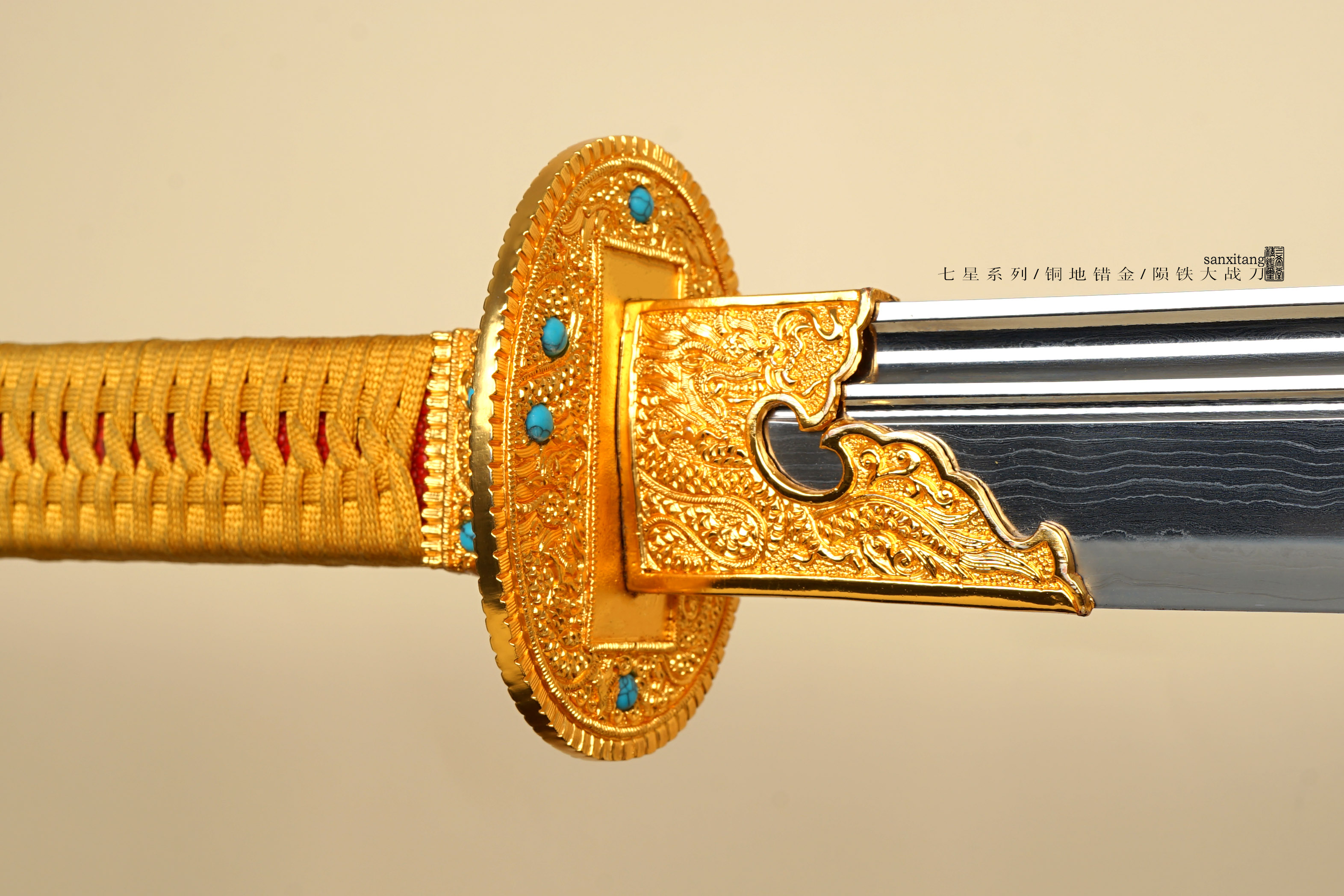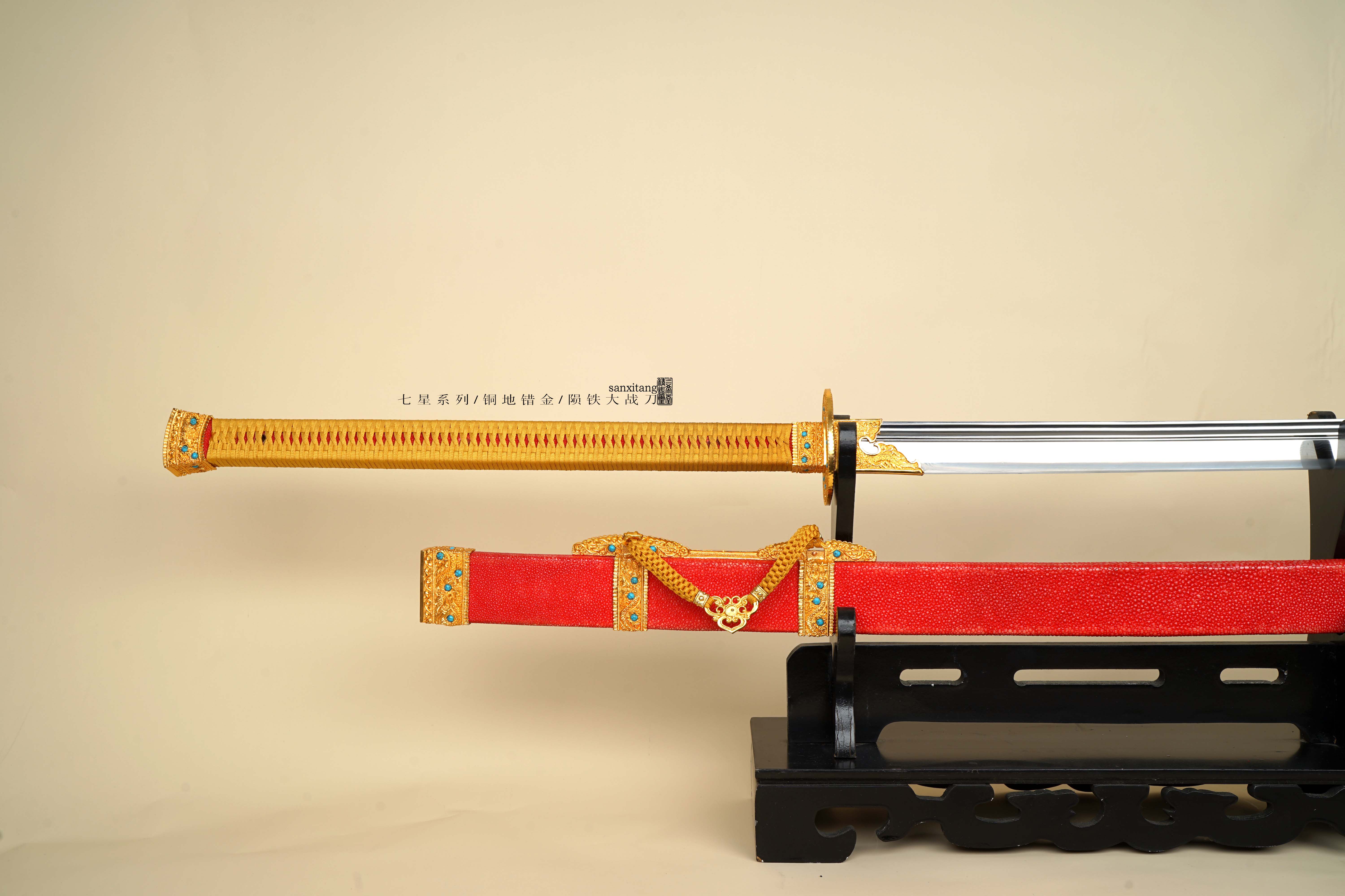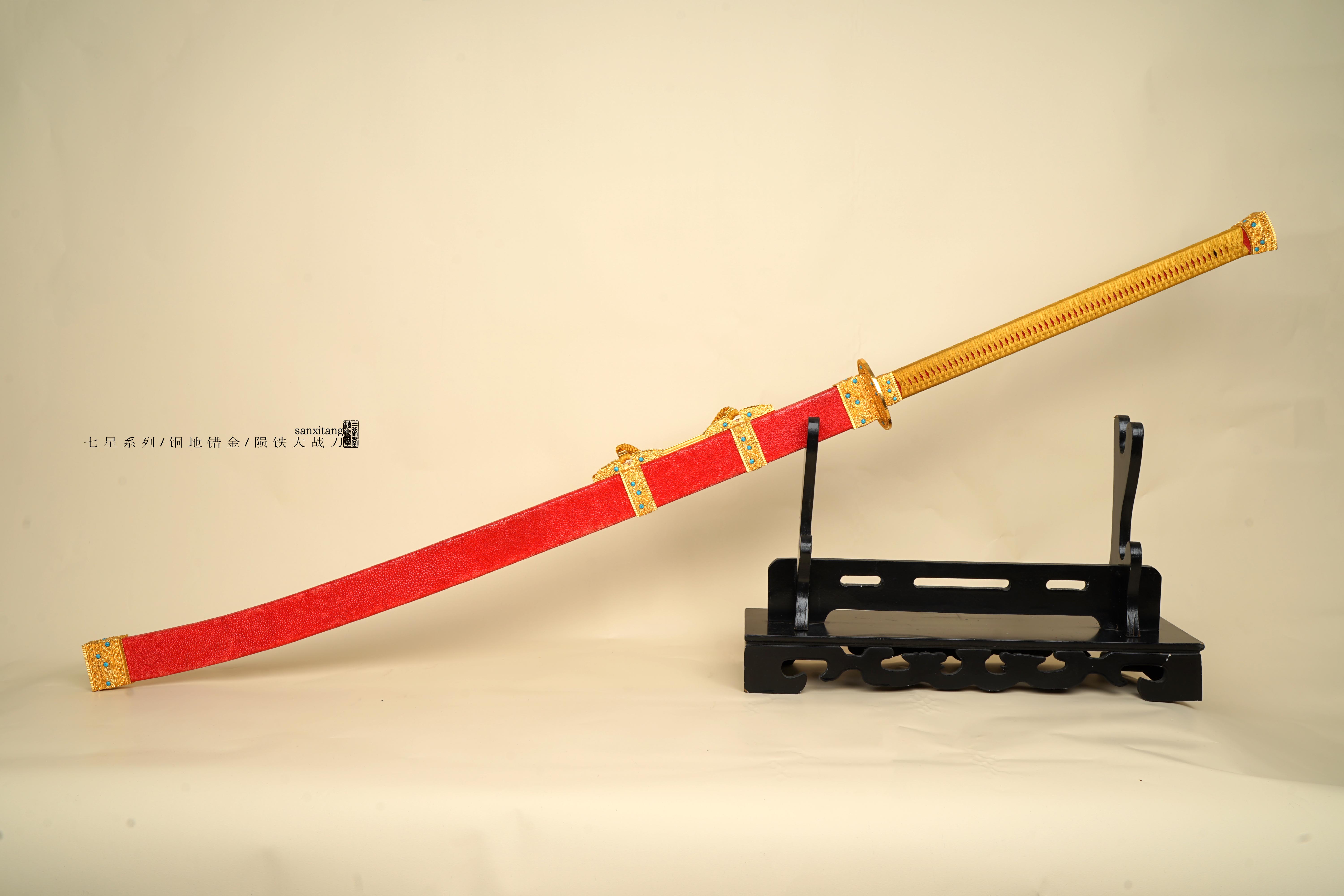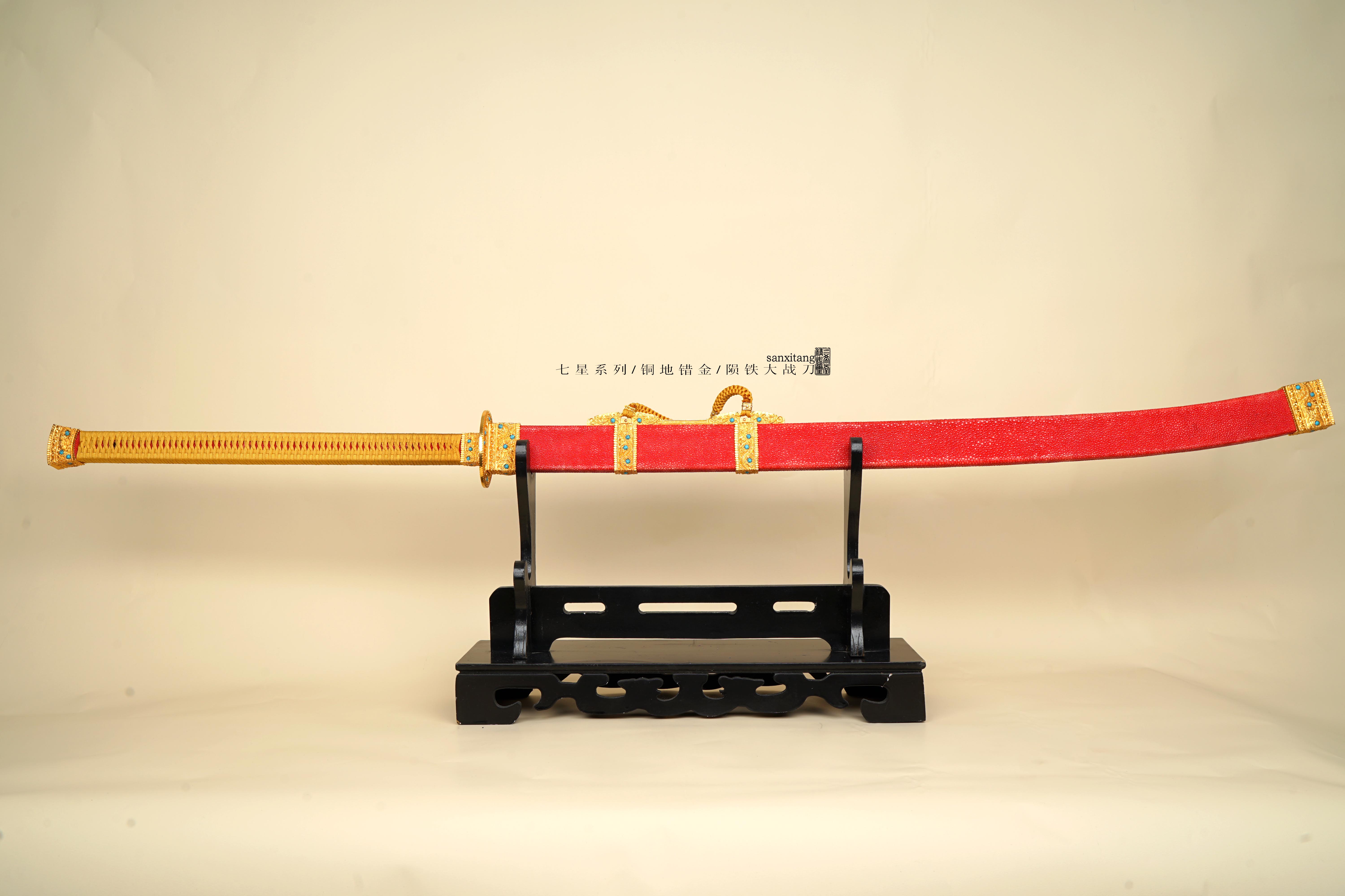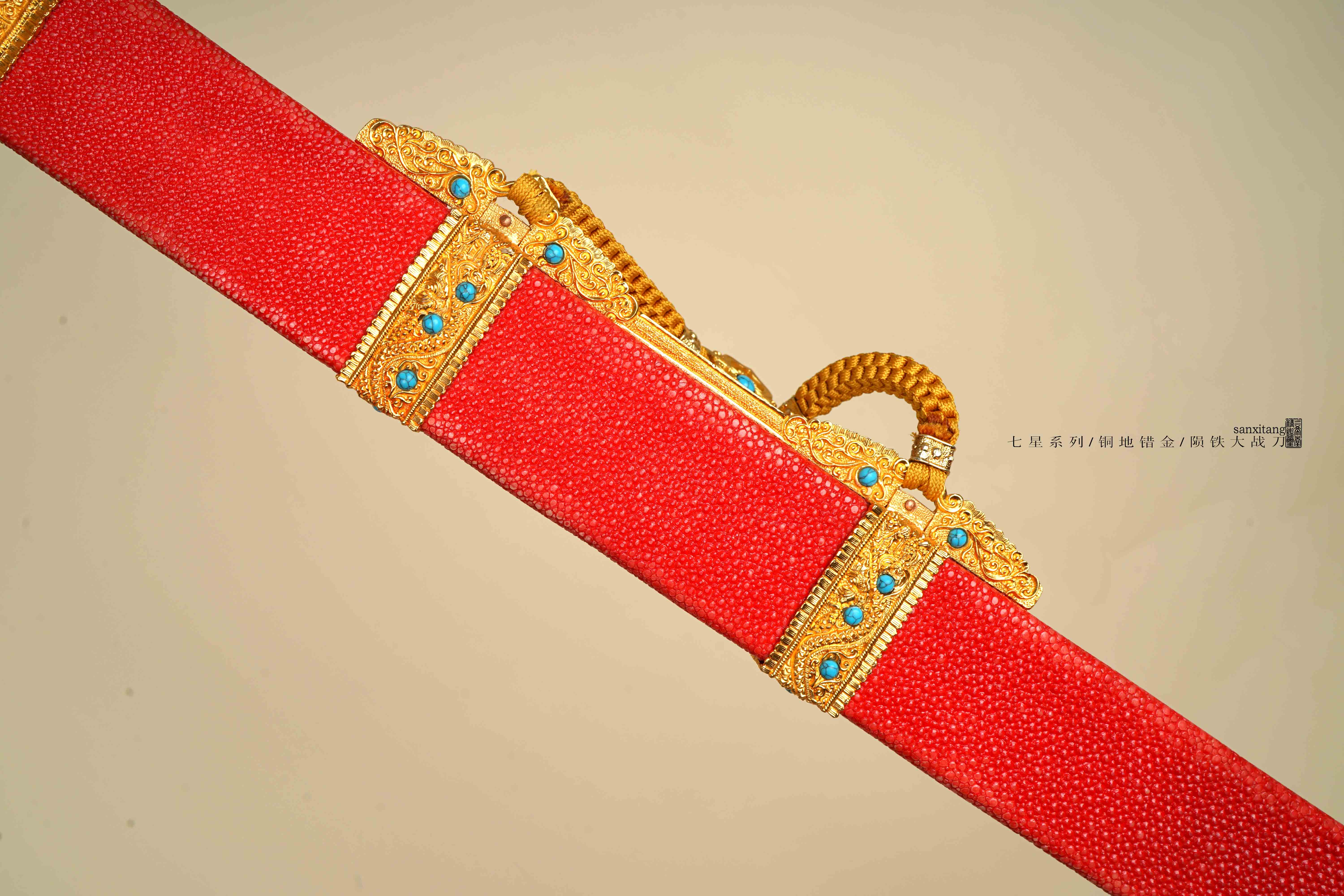 然后就是装具和柄鞘,我们保持云龙经典纹路不变,去掉了镂空,改用了乾隆大阅刀上那种宝石镶嵌,一是因为镂空的后期容易进灰尘不太好看,清理起来费劲,二是根据以往经验都不太喜欢镂空的,所有装具的形制都和古物差不多,包括鞘上也是四节,整套铜地云龙纹金具鎏金,做的比较厚的24K真金,还是非常实在的。古物是纯绿色柄和鞘,我们先做了一发金色柄,红珍珠鱼皮的配色,感觉比较富贵明丽吧,如果有想订原物配色或者其他配色的兄弟也可以滴滴我们小哥。