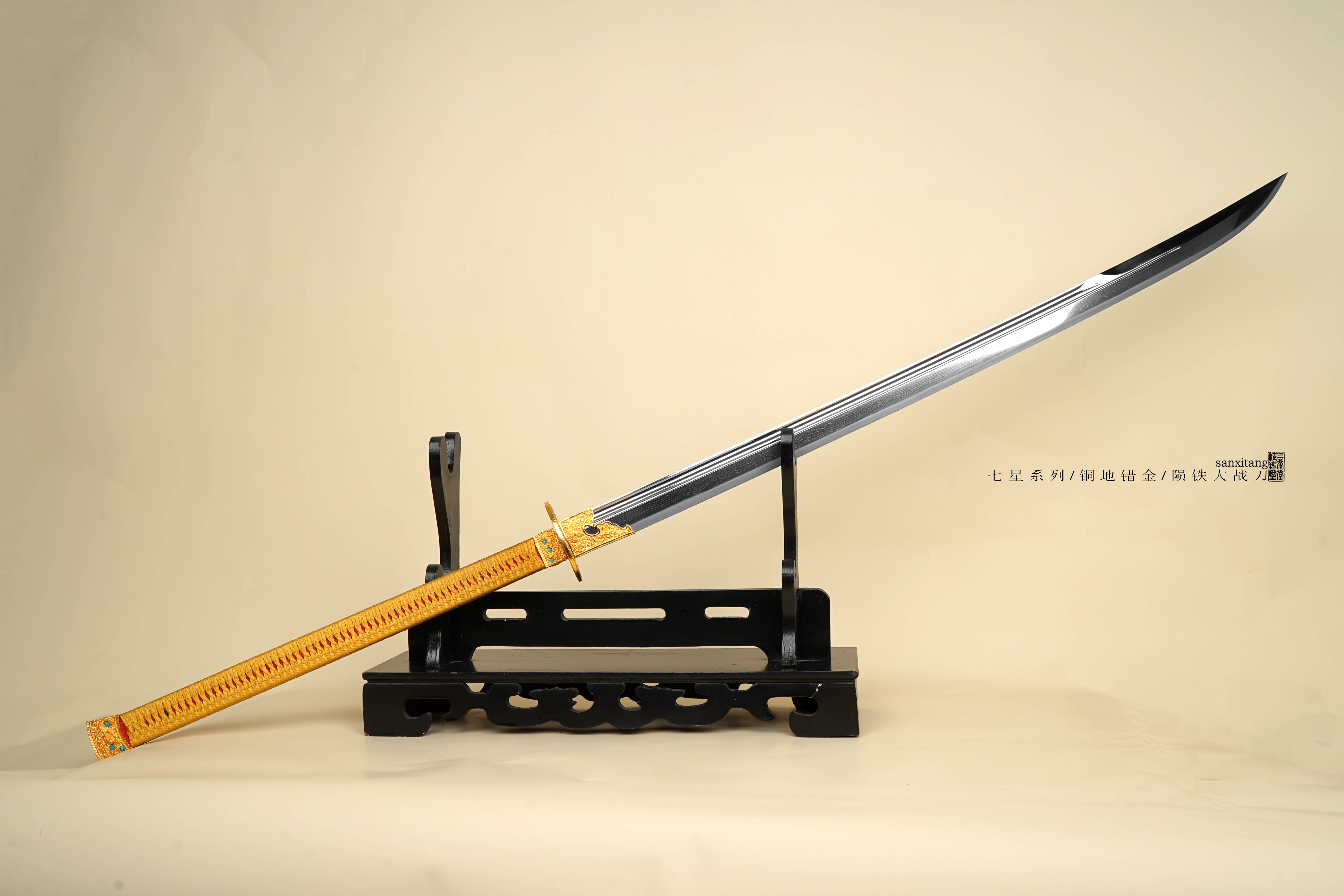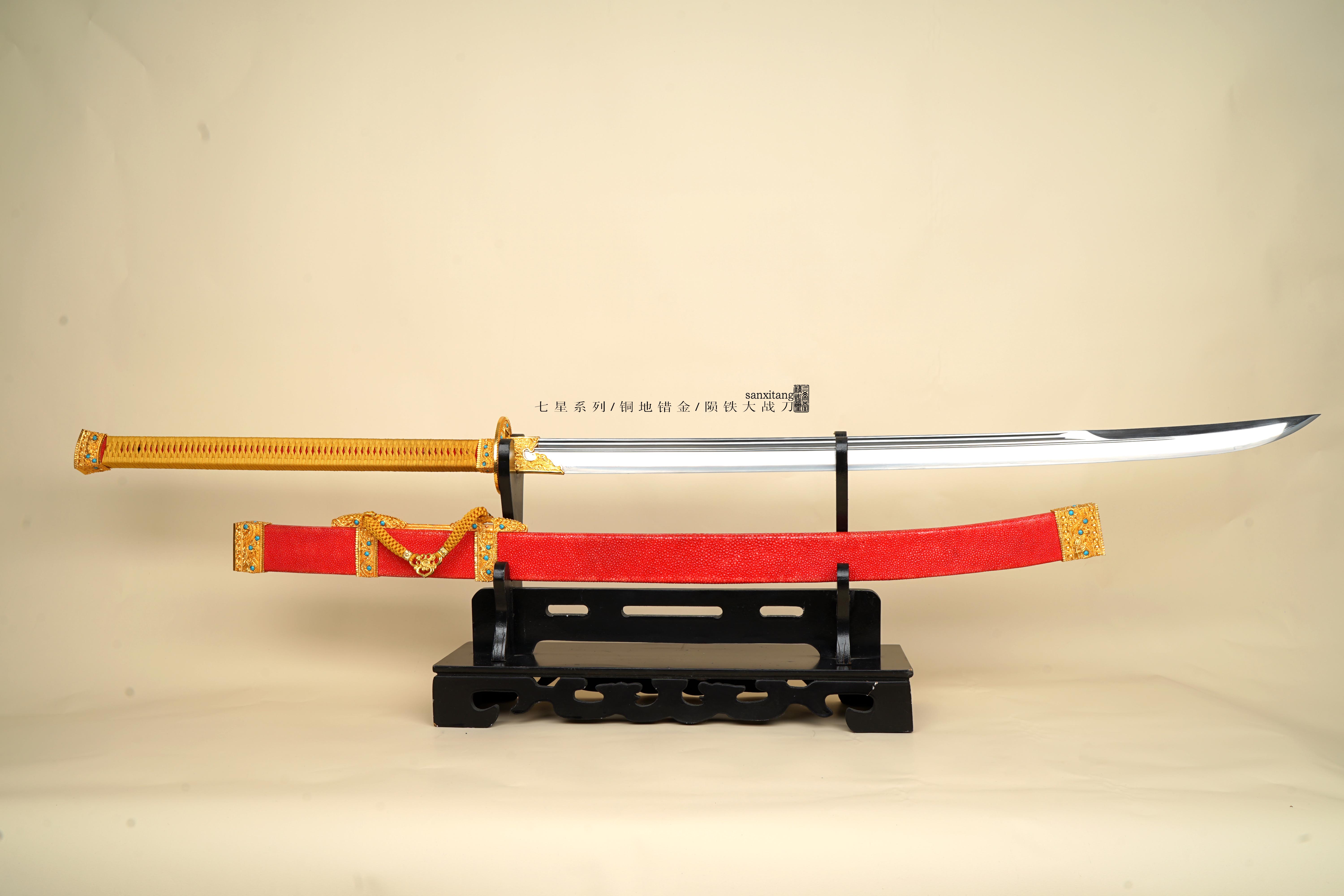 根据沈阳故宫博物院藏的仪刀改进制作的,先说形制,这只古物有点雁翎的感觉,在近刀尖处开始上翘,但是有点突然翘的太厉害了,我们改了一下线条让它显得更连续顺畅了一些,尺寸比例上也有所改变,整体都加长了,显得更威武一些。
