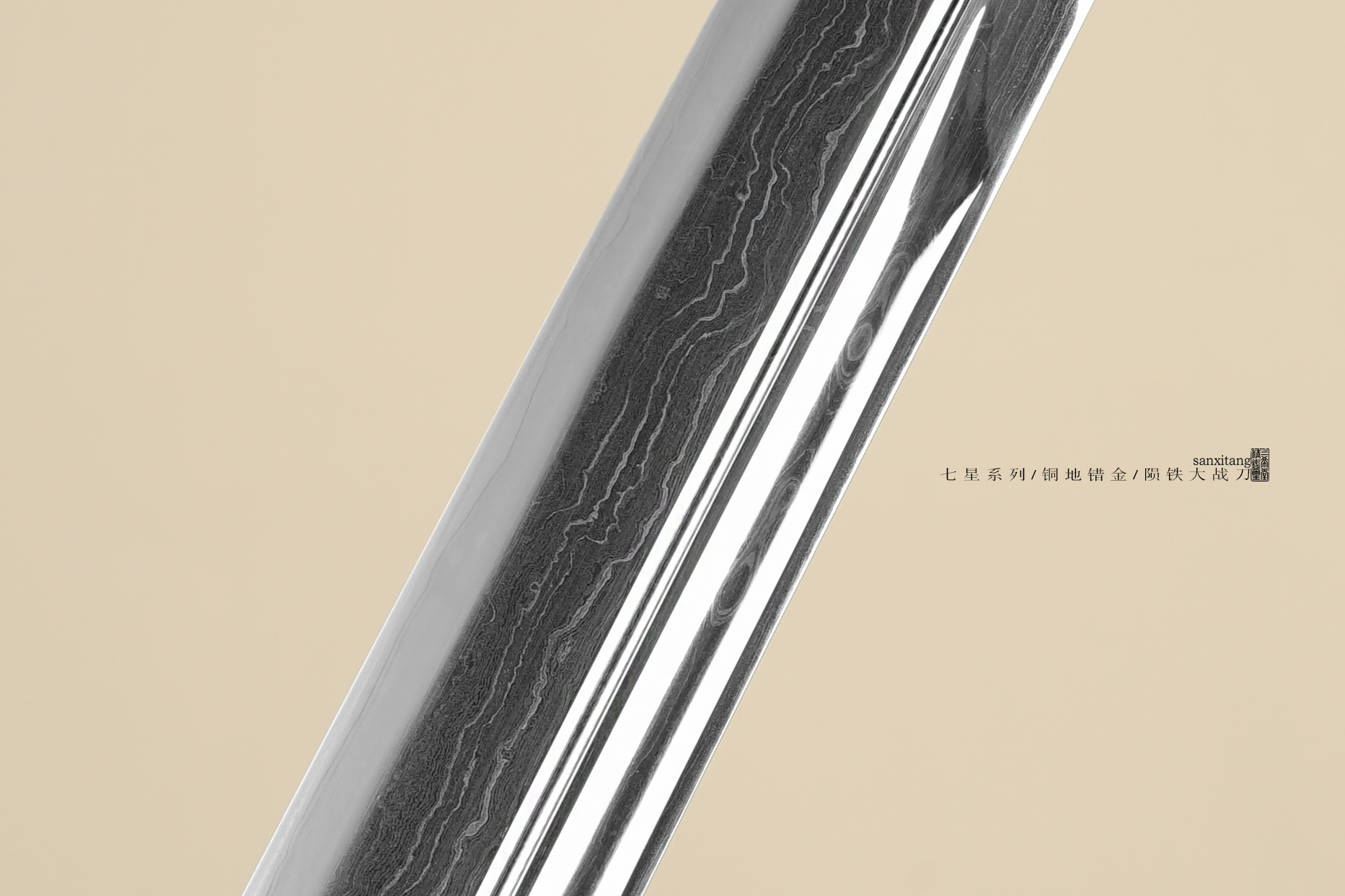 最后就是刀条了,也是整把刀的重中之重。我们买的瑞典的陨铁,这玩意有点贵的,一万多就一块,顶多就能做两把刀,特别是这只加长了,买回来的基本都用上了。我们折叠锻打了16000余层,让结构更加紧密,尽量把应力祛除掉了,从而让性能得到提升,外观和性能兼备是我们所有作品都具备的品质。这只的研磨比较好,从图片能清楚看到每一丝陨铁,它们这种天然的交织杂糅就像一幅画一样,有序有无序,非常好看。而且通过高端的研磨之后,这只作品拿到实物以后,可以感觉出来刃表面相当清澈,就像一汪泉水一样,温润绵长,沁人心脾。