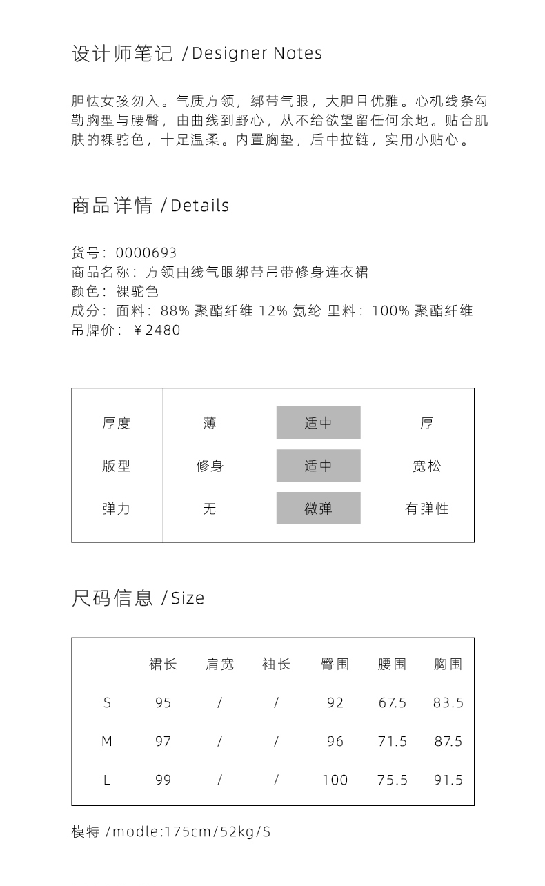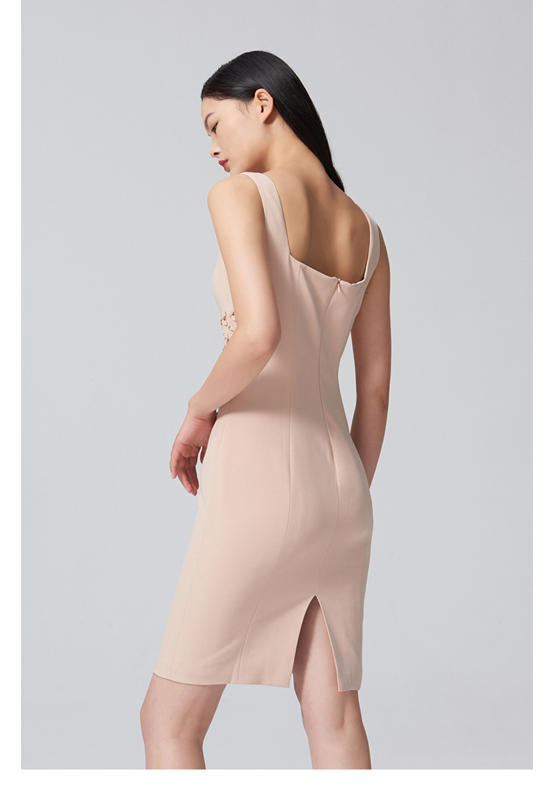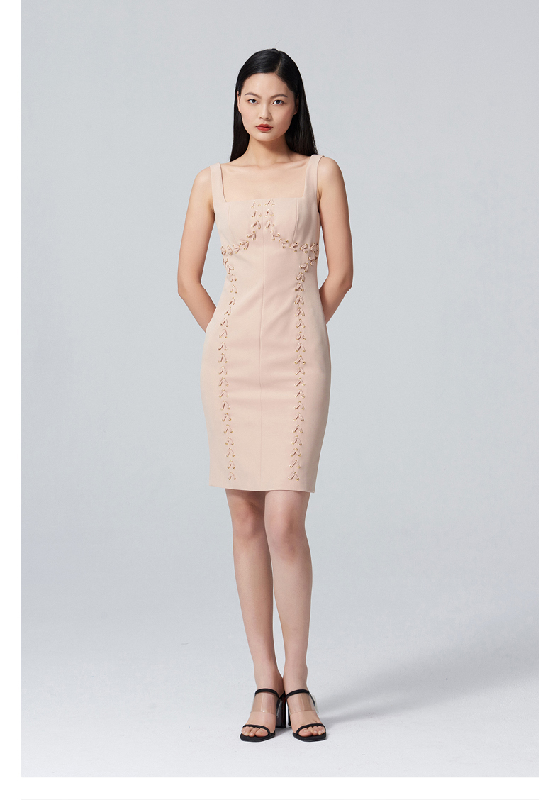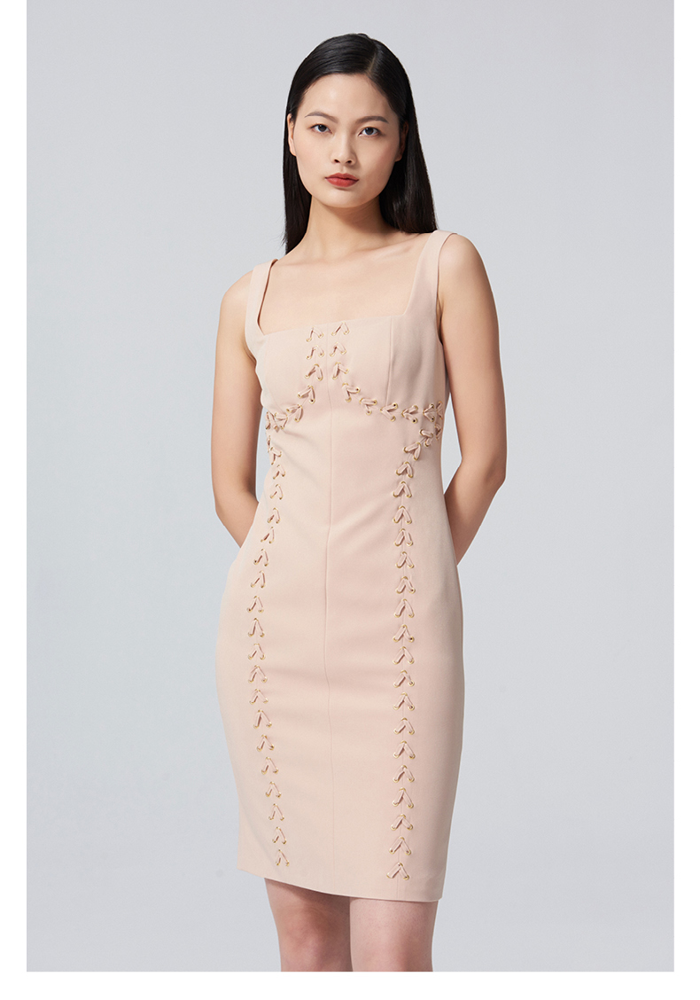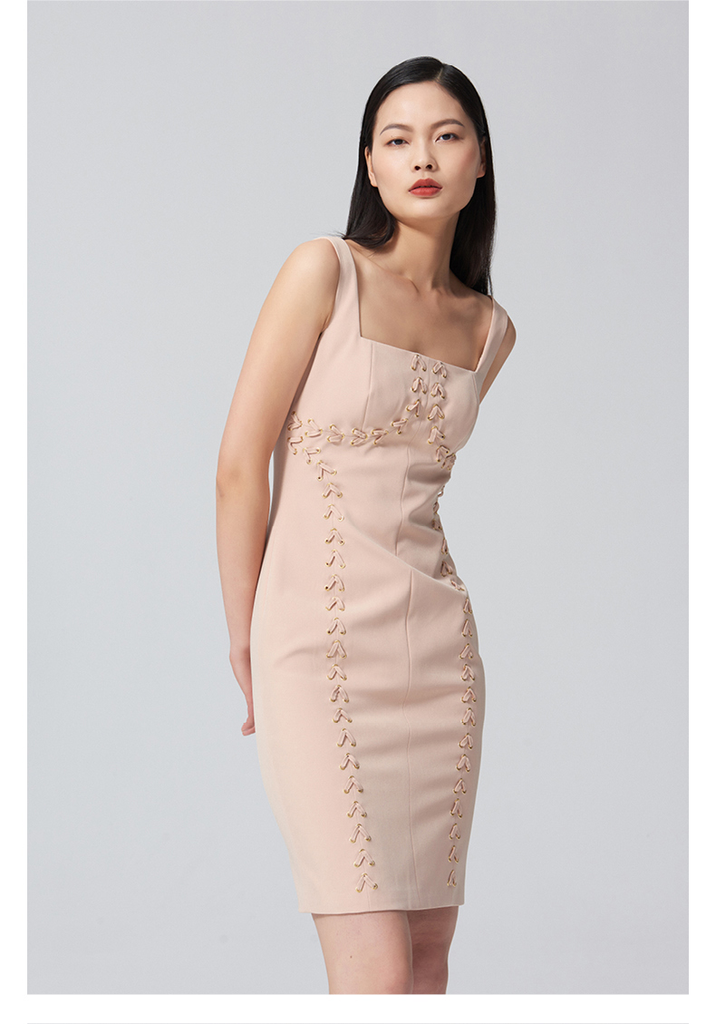 【丽比戴安娜】方领气眼绑带曲线设计吊带裸驼色修身连衣裙/0000693