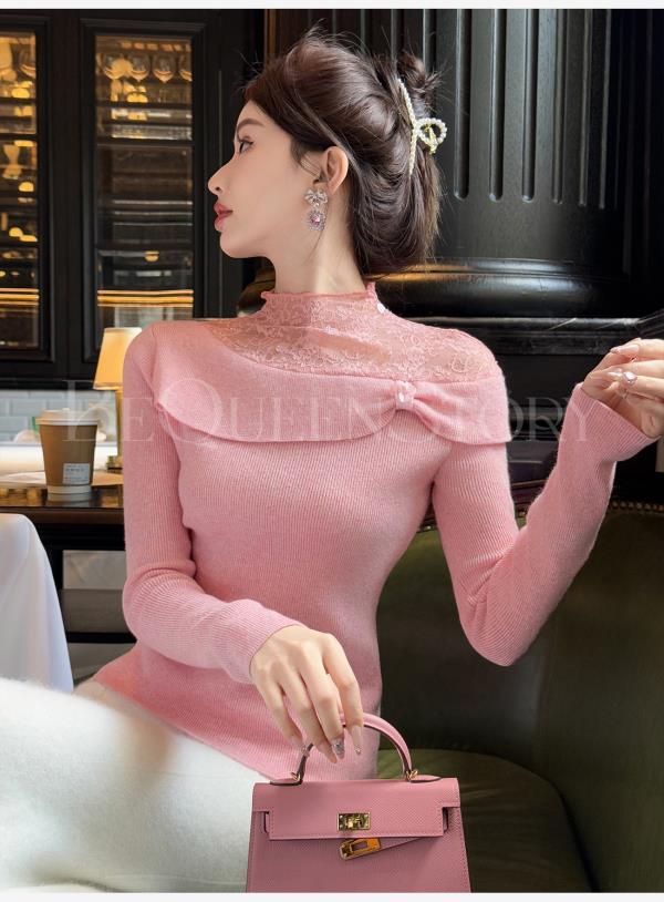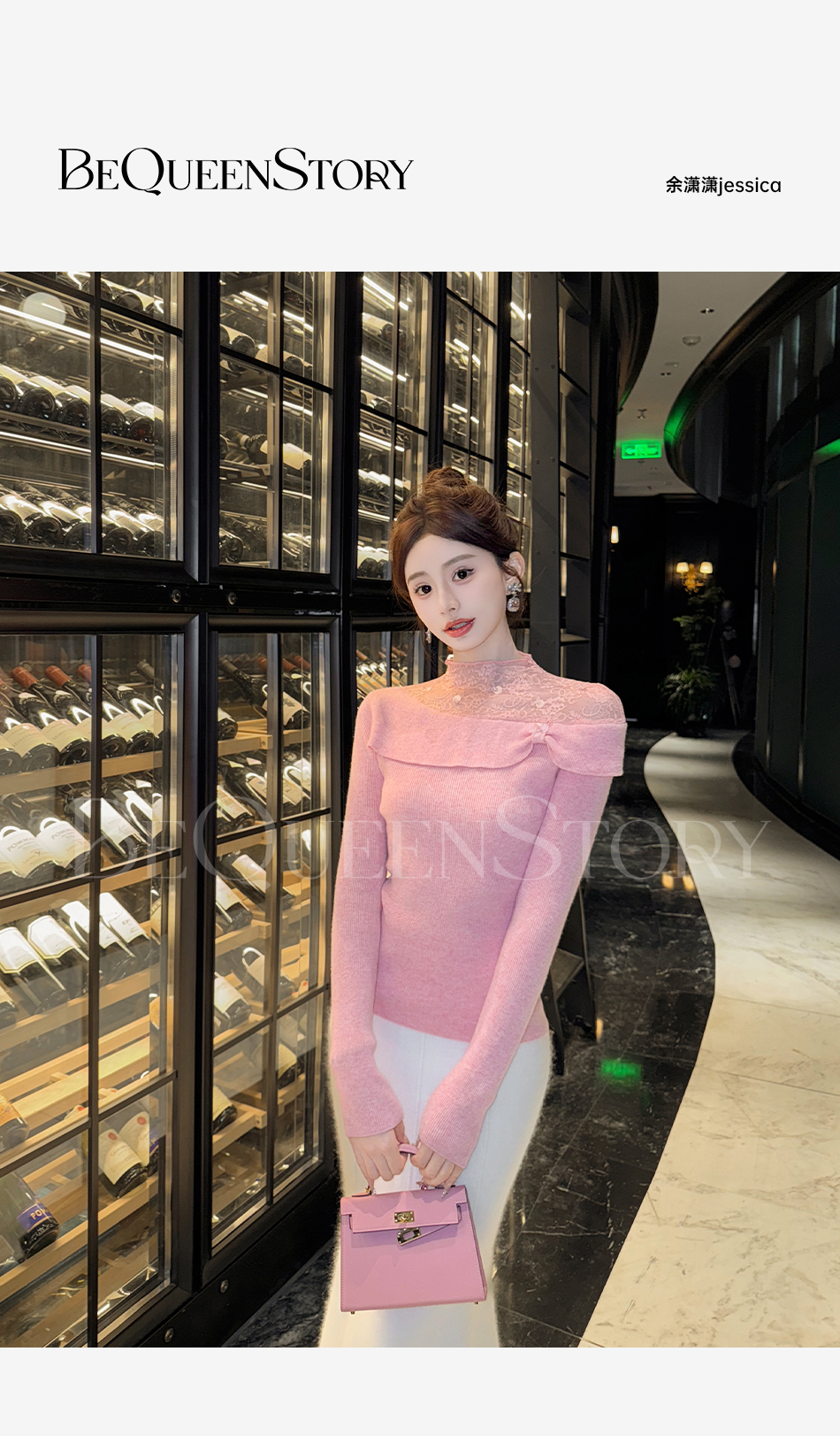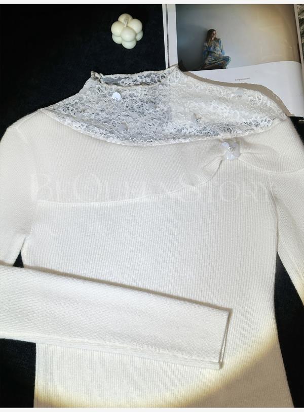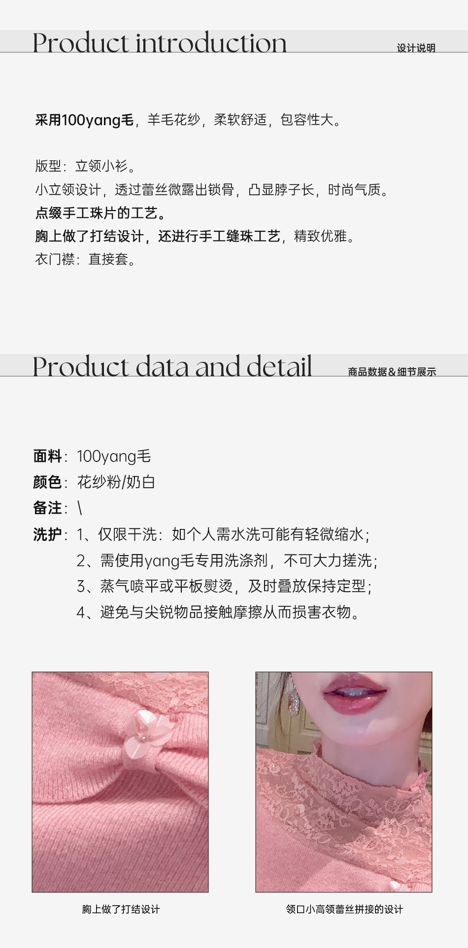 【孤品样衣,不退不换】 【桃香蜜语】时尚百搭设计感100羊毛蕾丝拼接修身针织衫