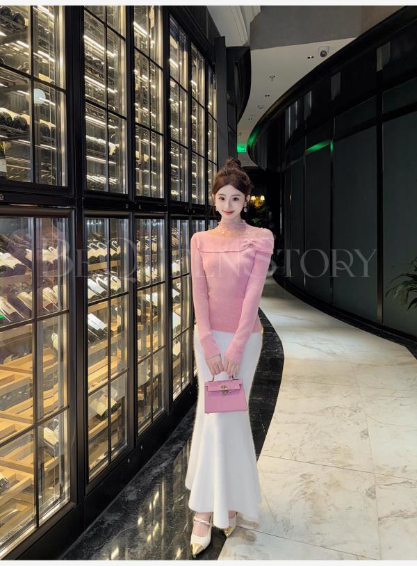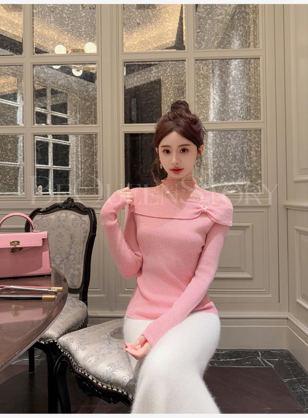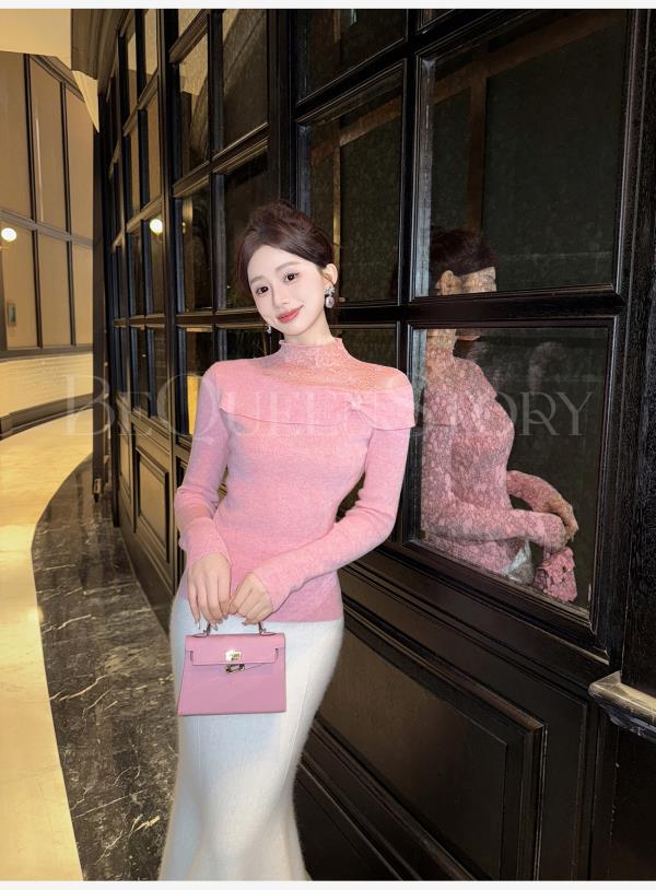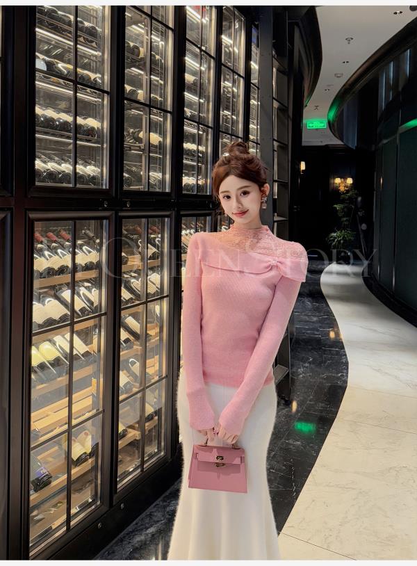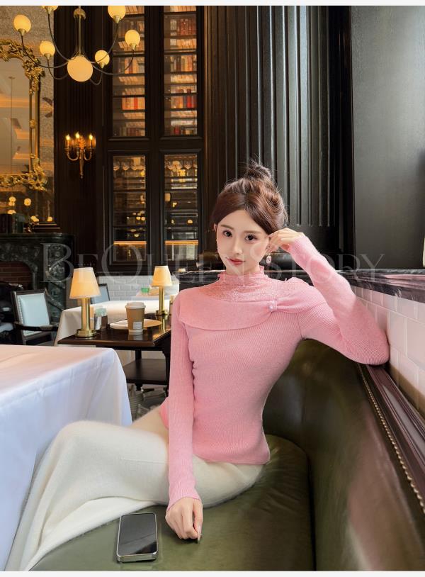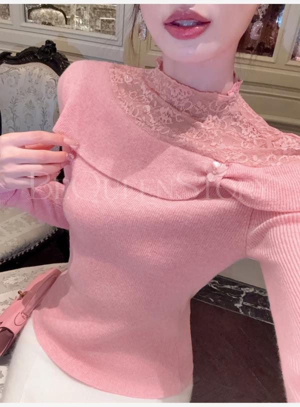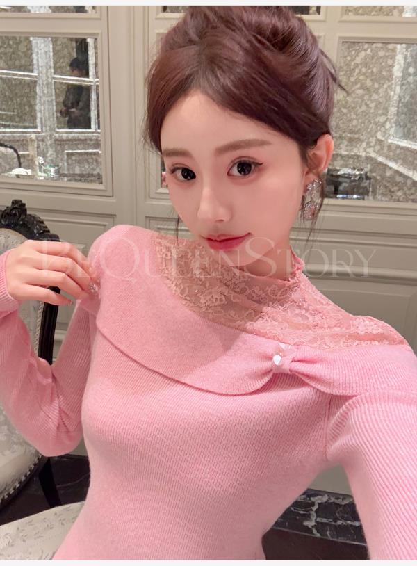 【孤品样衣,不退不换】 【桃香蜜语】时尚百搭设计感100羊毛蕾丝拼接修身针织衫