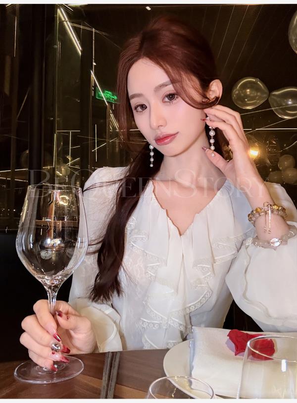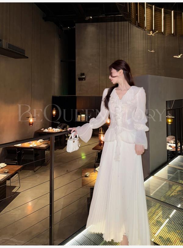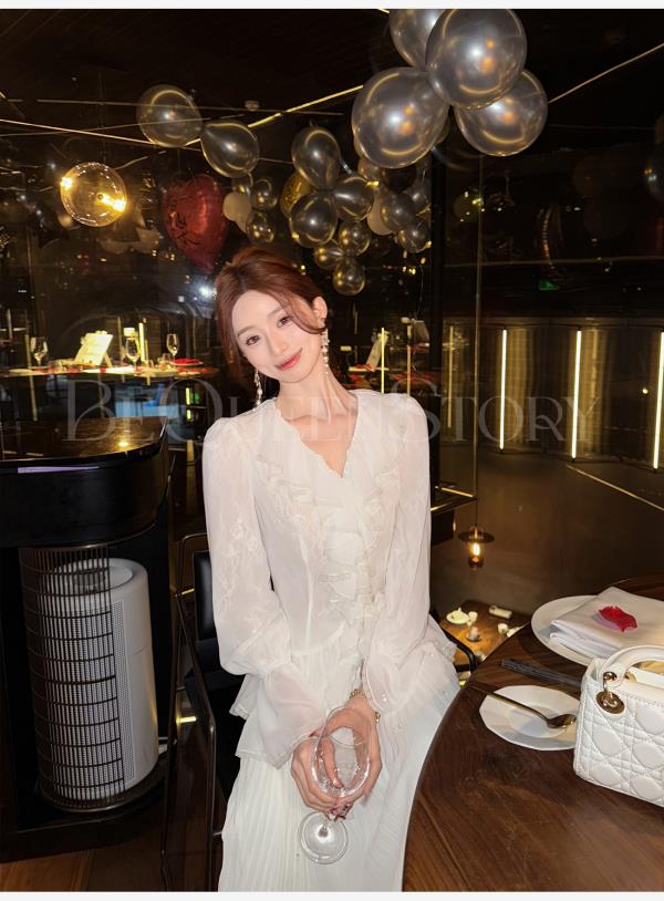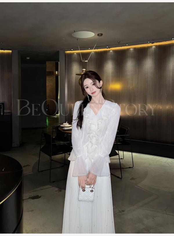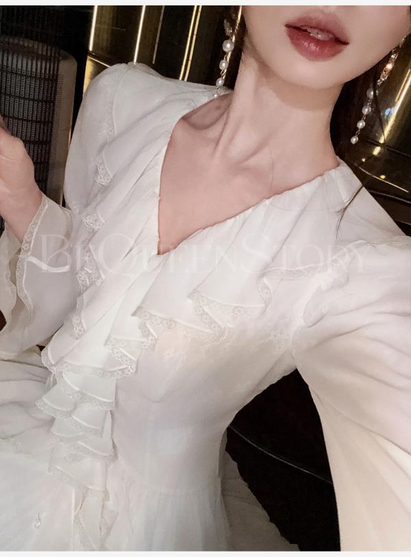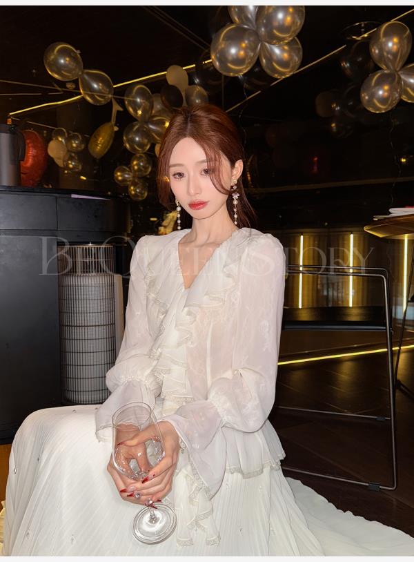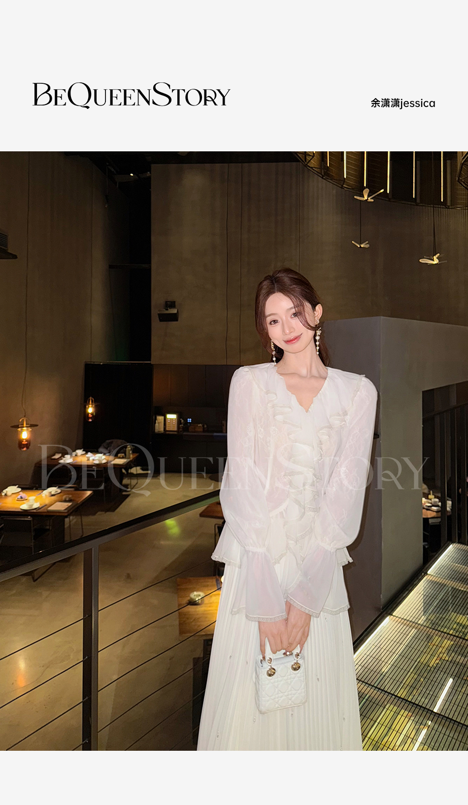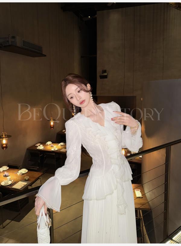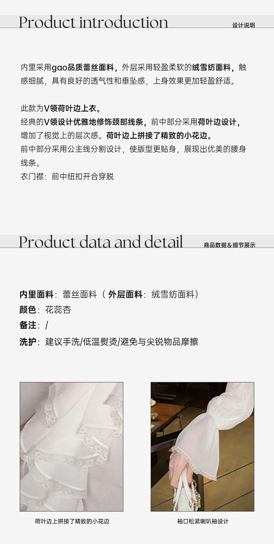 【大货捡漏,不退不换】 【浮光浅梦】早春时髦设计层次感收腰V领荷叶边喇叭袖上衣