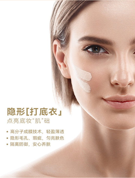 「隐形打底衣」点亮底妆“肌”础‼ •高分子成膜技术,轻盈薄透 带来清爽顺骨体验,快速成膜后,皮肤轻盈好可以呼吸同时防止水分流失 •隐形毛孔、瑕疵,匀亮肤色 纳米级弹性粉粒,吸附油光、平滑毛孔、提亮肤色,皮肤自然提亮,打好底子 •隔离防御,安心养肤 二氧化钛入妆,减少肌肤氧化损伤;燕麦β-葡聚糖于皮肤建立防护膜,隔离脏空气、隔离彩妆,阻断外界刺激
