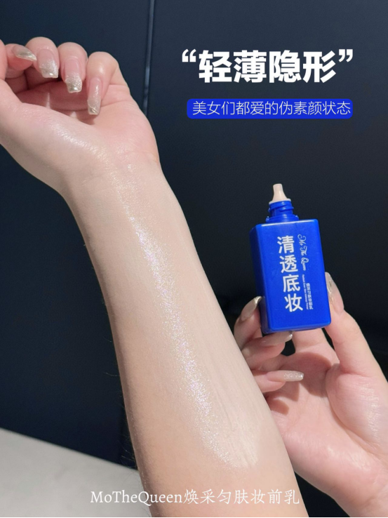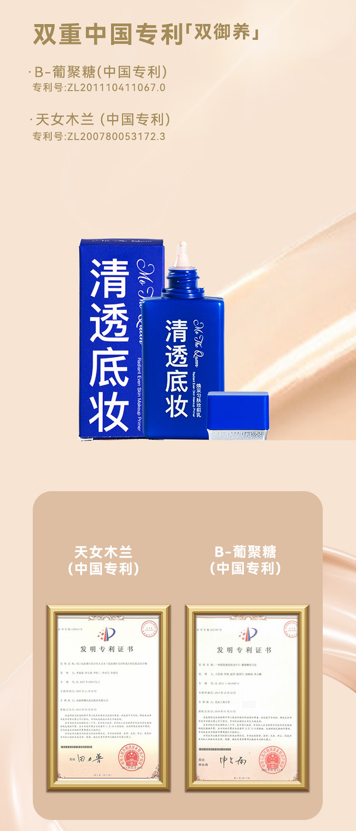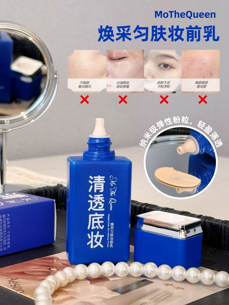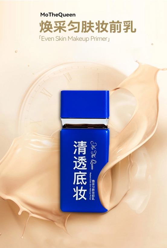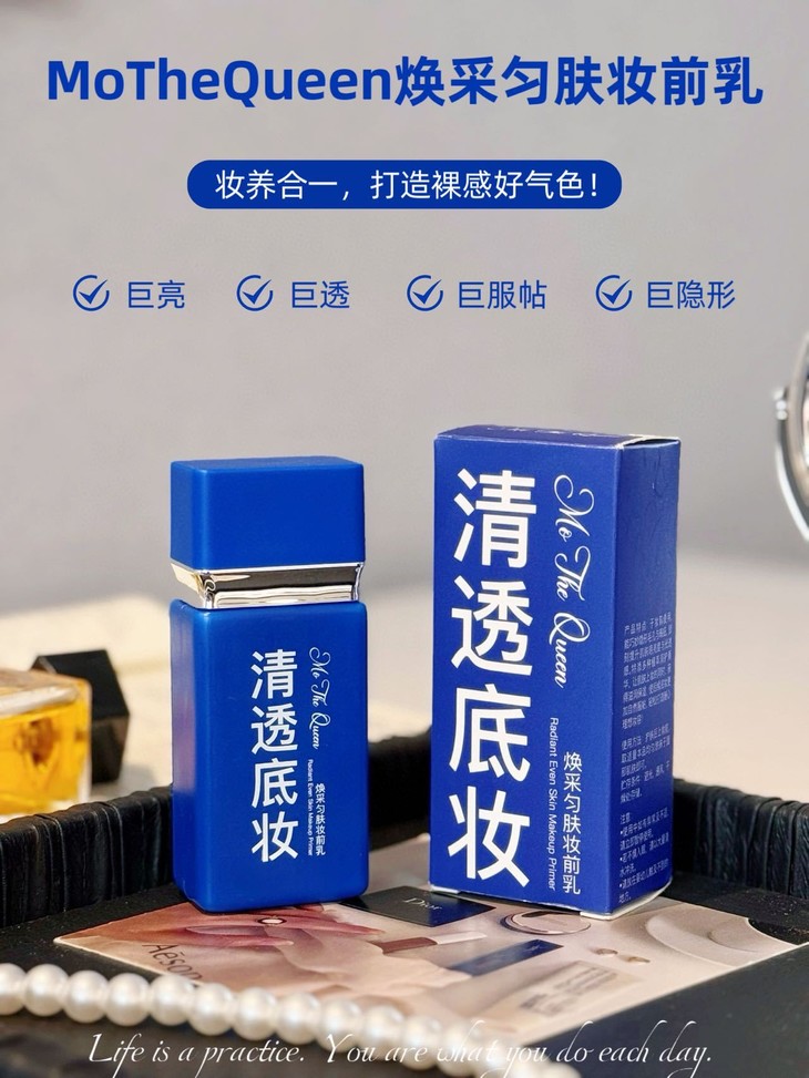 MoTheQueen焕采匀肤妆前乳 •妆养合一,一抹匀净遮瑕,打造裸感好气色 •冬虫夏草、紫芝、雪莲、人参、牡丹五重珍萃润泽细嫩,让妆容更服贴 •南非复活草与专利β-葡聚糖,提升内部水合力,让妆面持妆不拔干 •维生素E+天女木兰,提亮匀净,改善暗沉不均,打造晶莹透亮肌 • 二氧化钛修正气色,即刻提升肌肤明亮度与光透感 •一瓶多用,懒人素颜出门好气色,妆前打底更服贴持妆