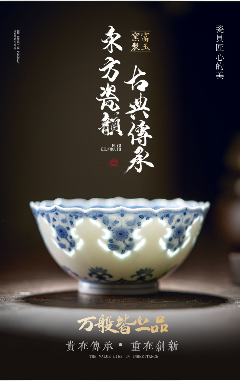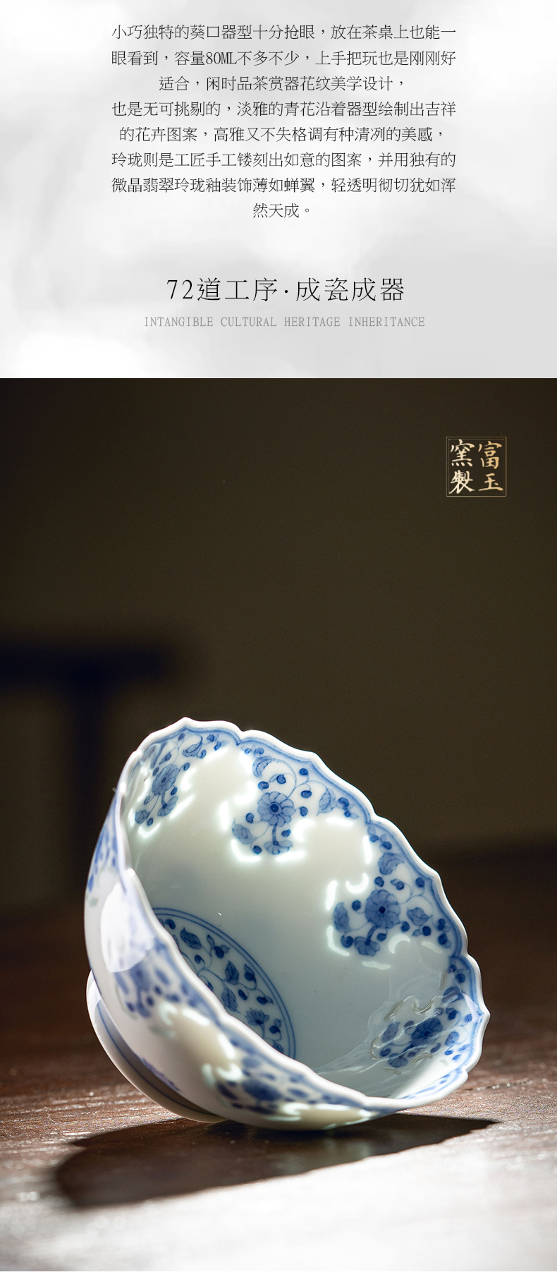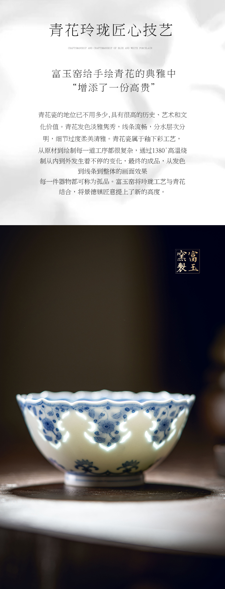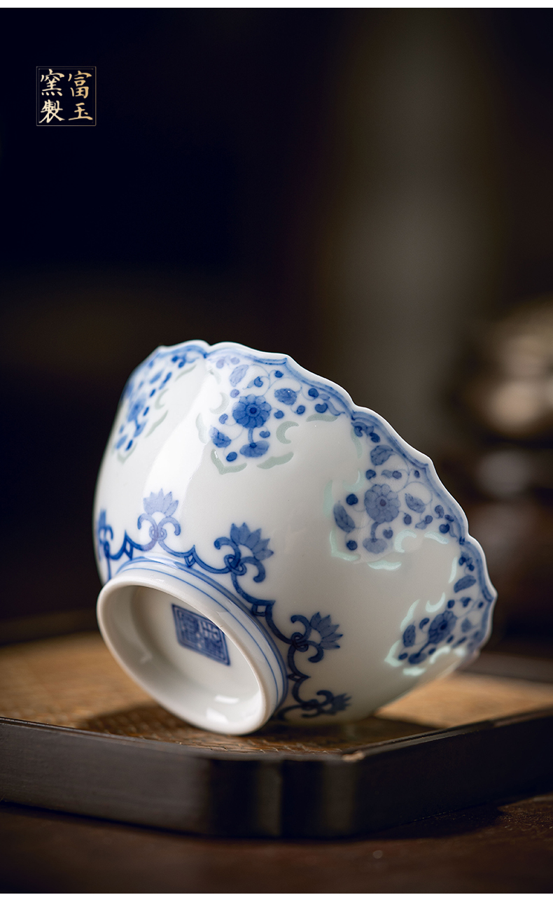 富玉窑 景德镇手工仿古韵味青花玲珑葵口主人品茗杯