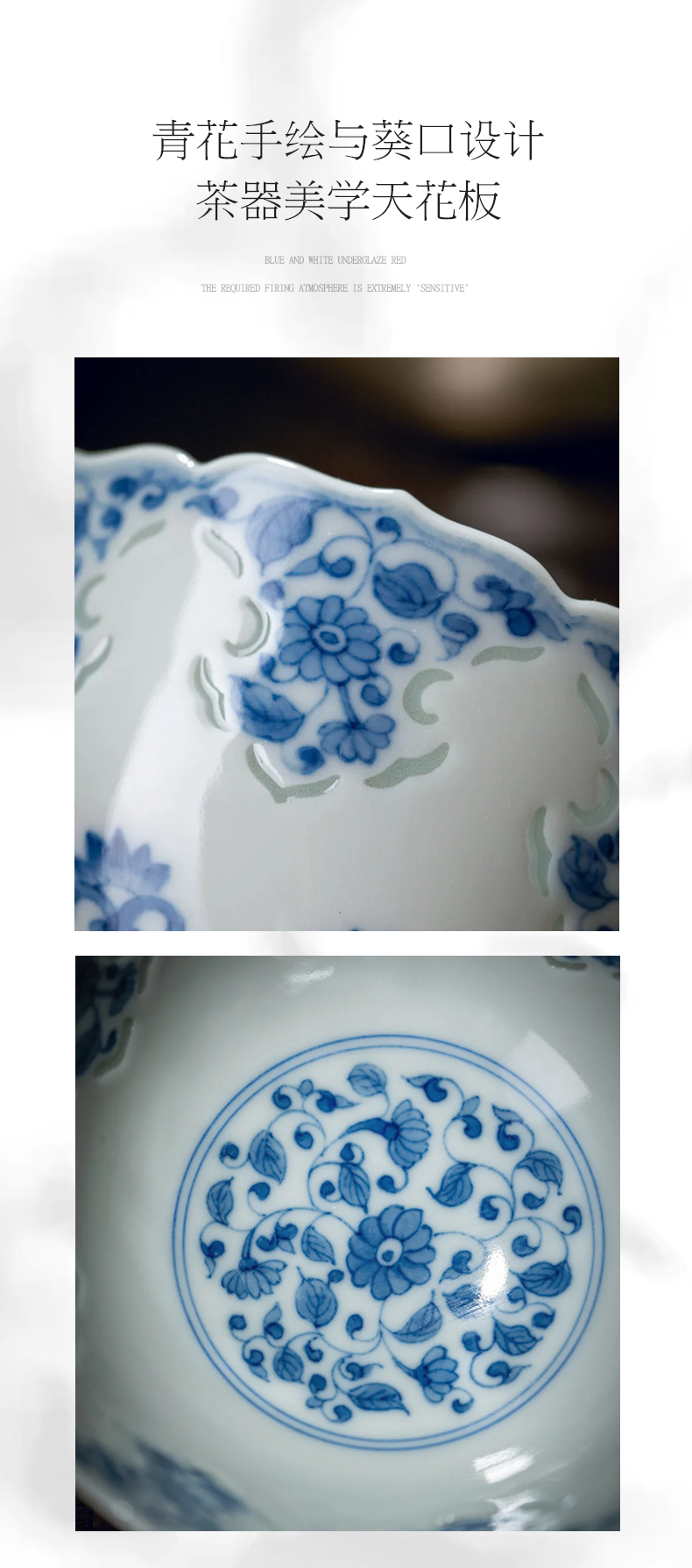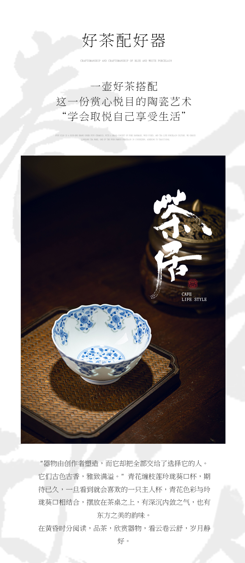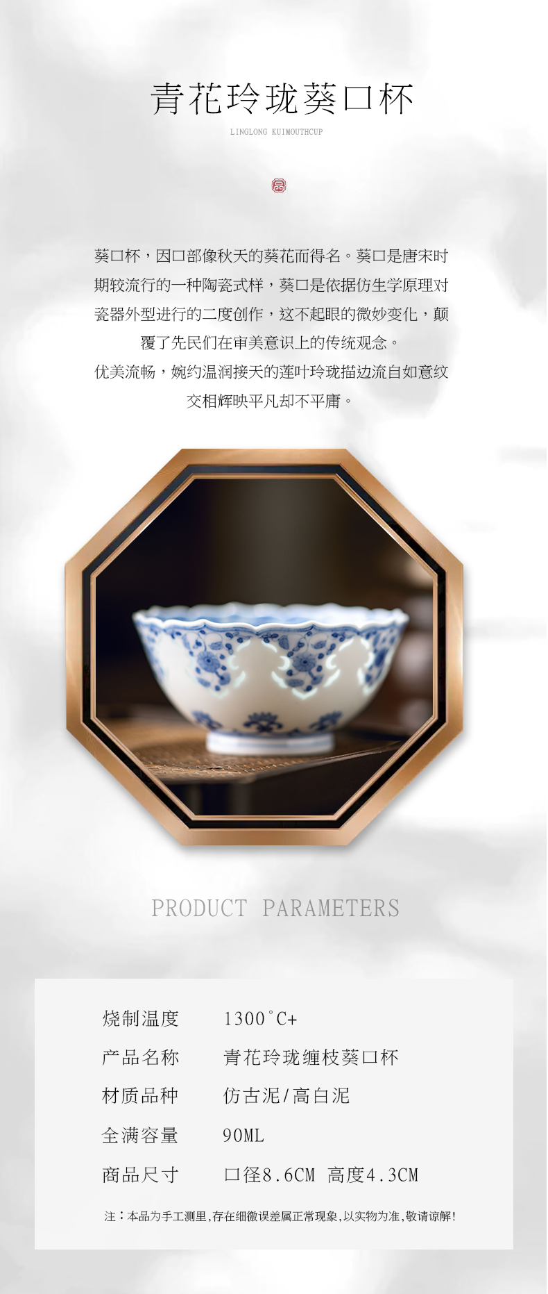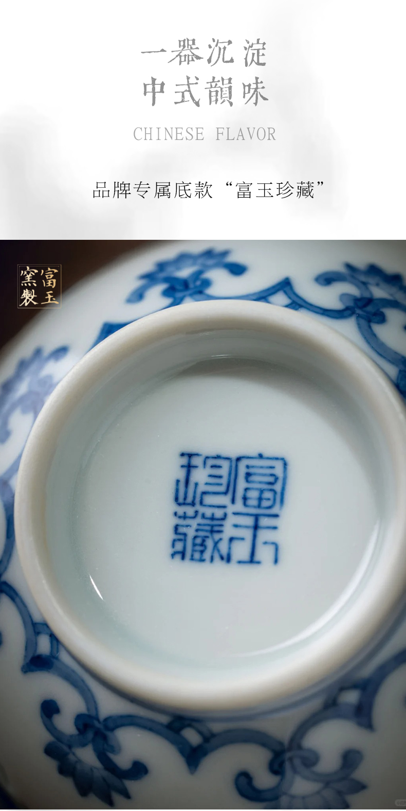 富玉窑 景德镇手工仿古韵味青花玲珑葵口主人品茗杯
