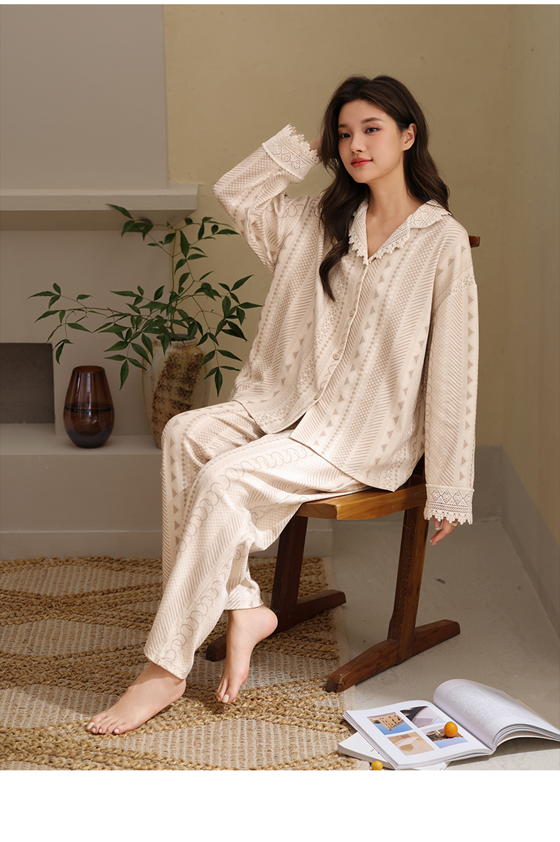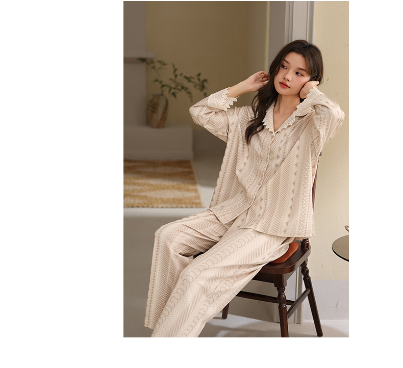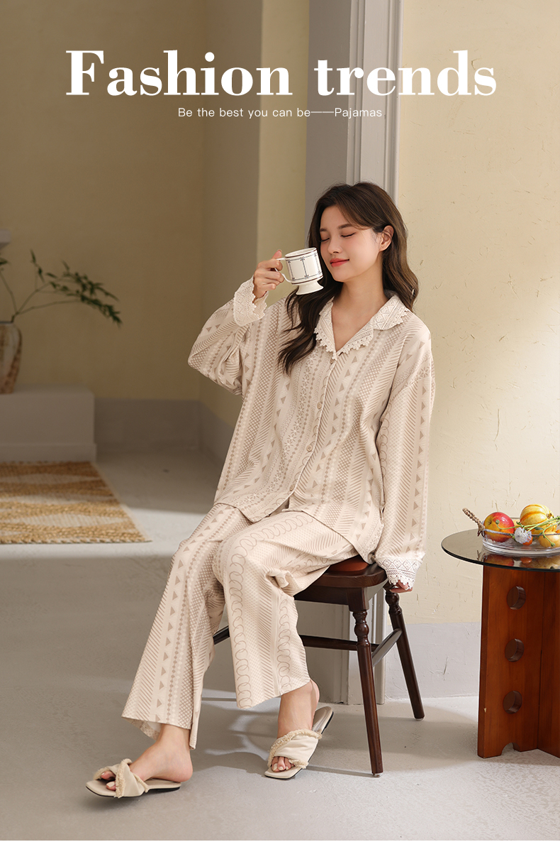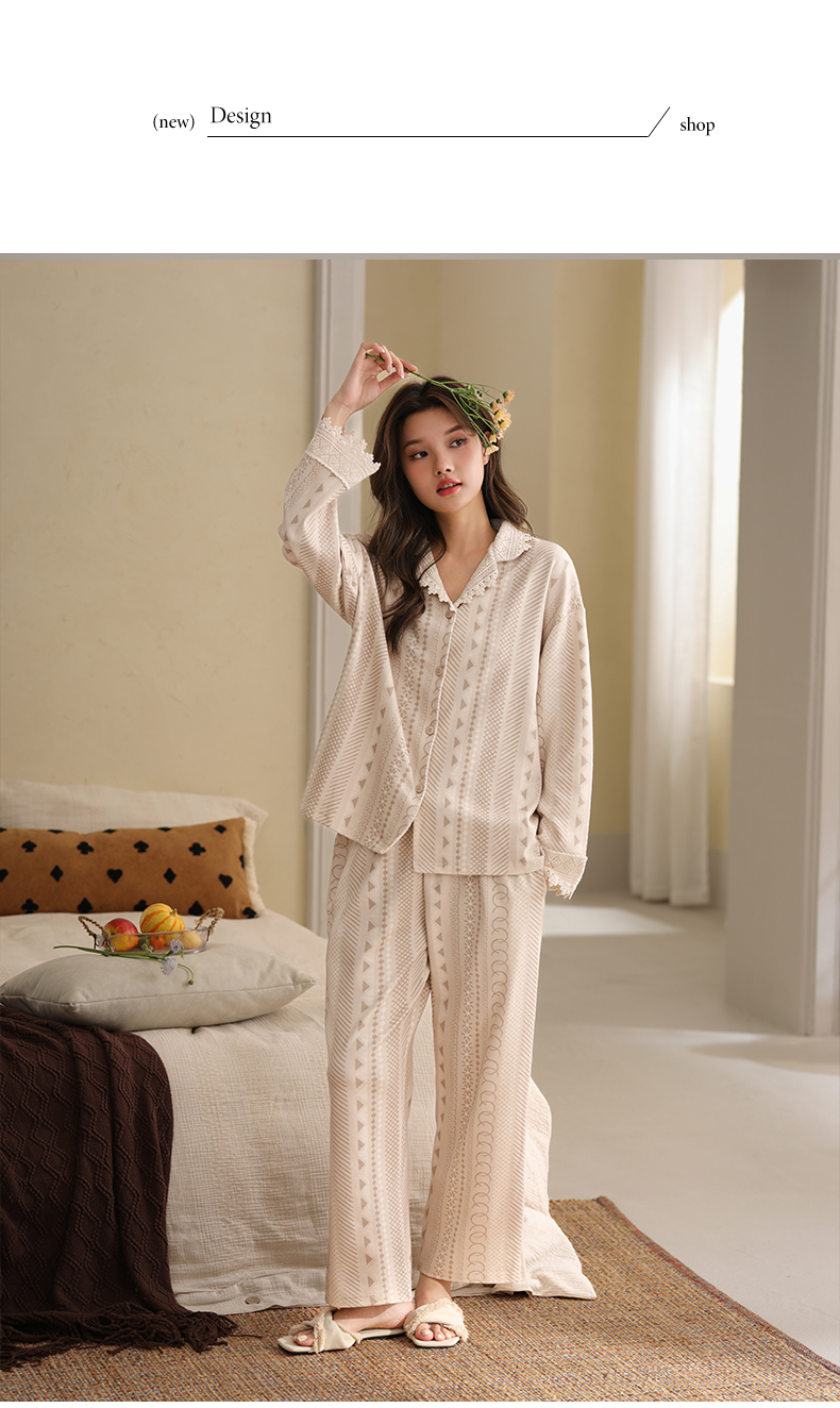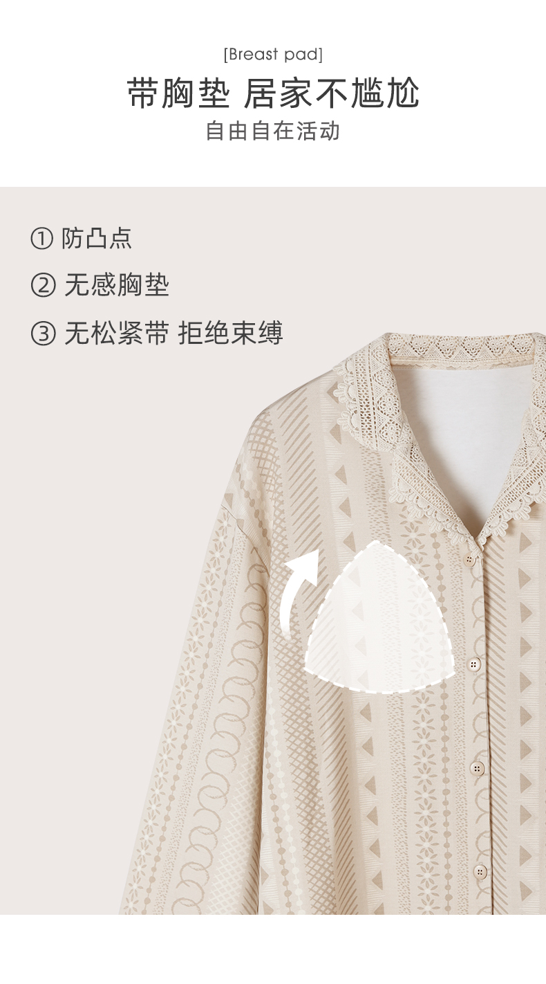 可人儿春秋季带胸垫泡泡绵女士长袖长裤睡衣可外出小众家居服套装
