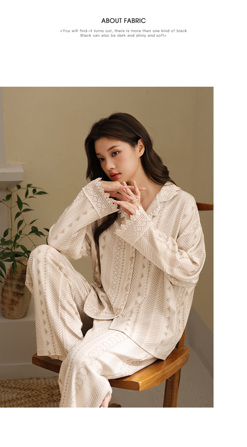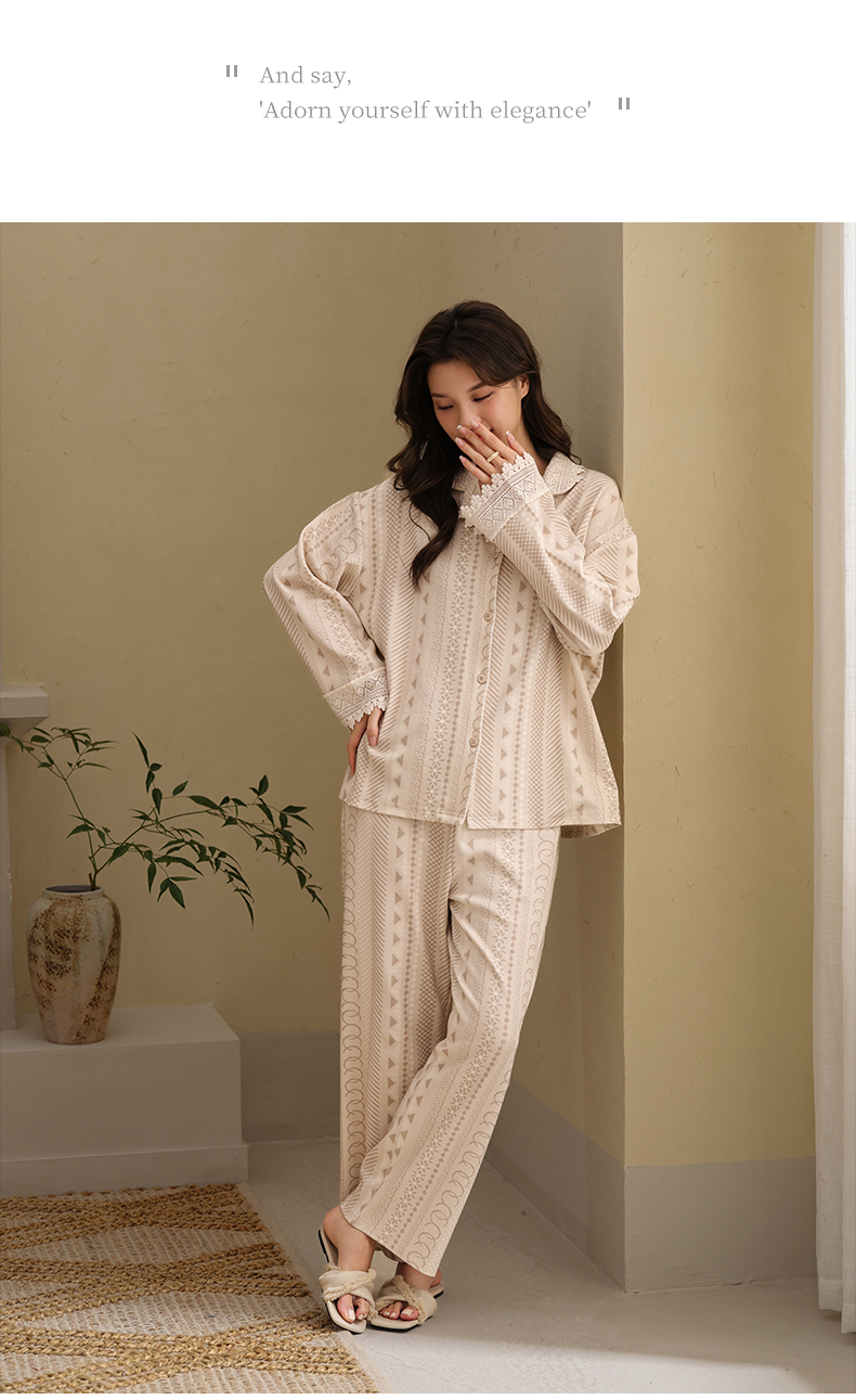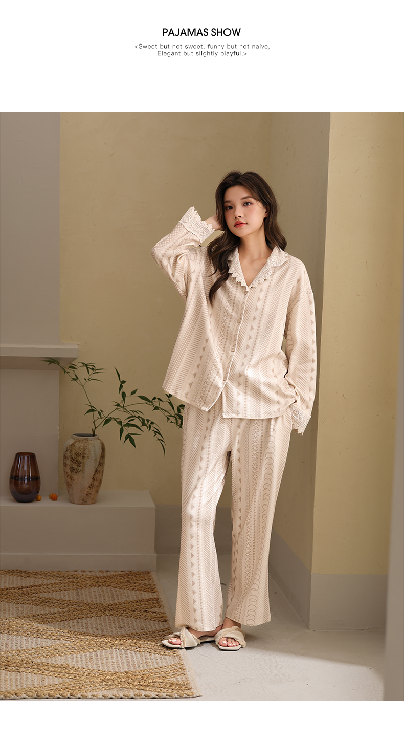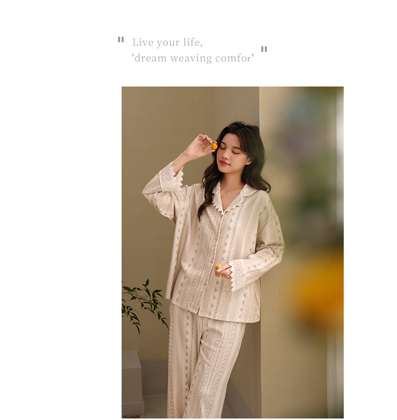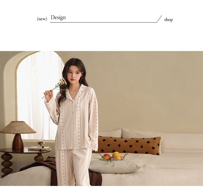 可人儿春秋季带胸垫泡泡绵女士长袖长裤睡衣可外出小众家居服套装