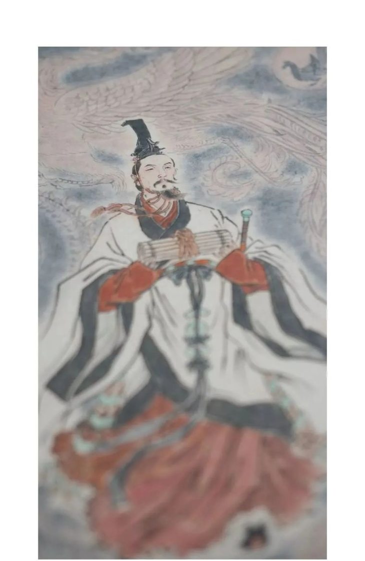 第一张:《忧歌离骚》中,屈原端坐于书案前,执笔凝思,愁眉不展,展现了被楚王疏远后,忧愁幽思而作《离骚》的情景;背景体现了《离骚》词句中出现的兰草、龙凤等元素。