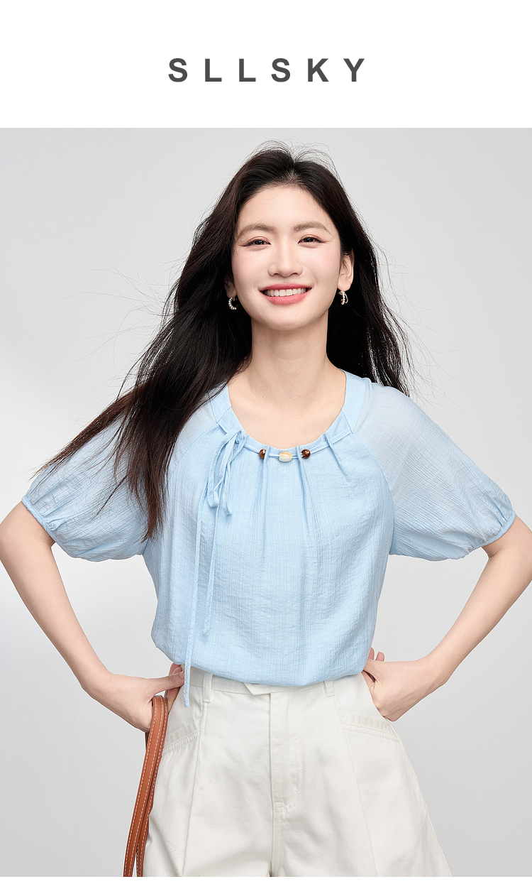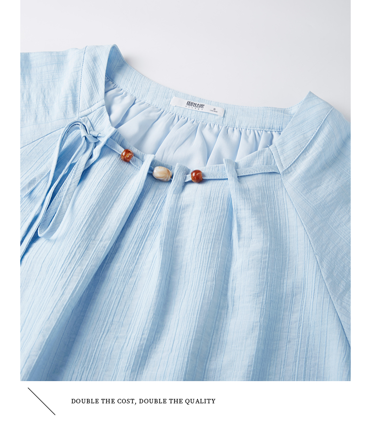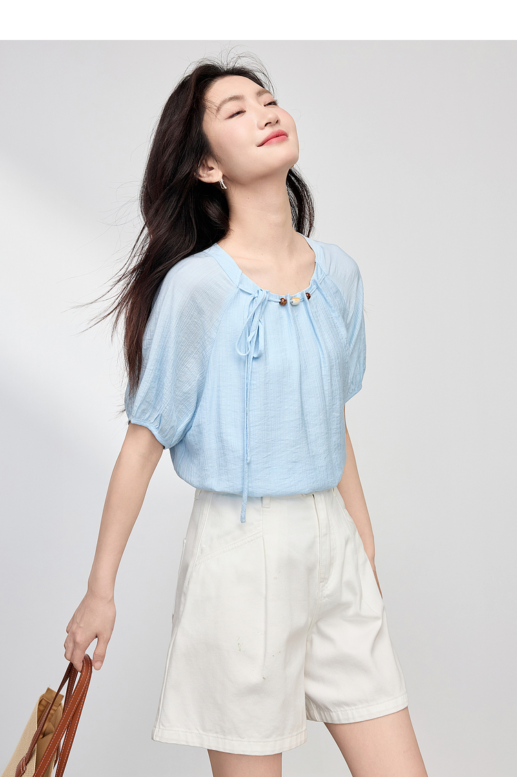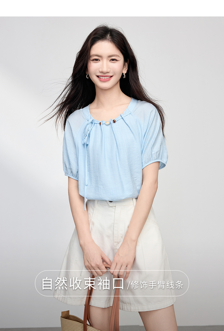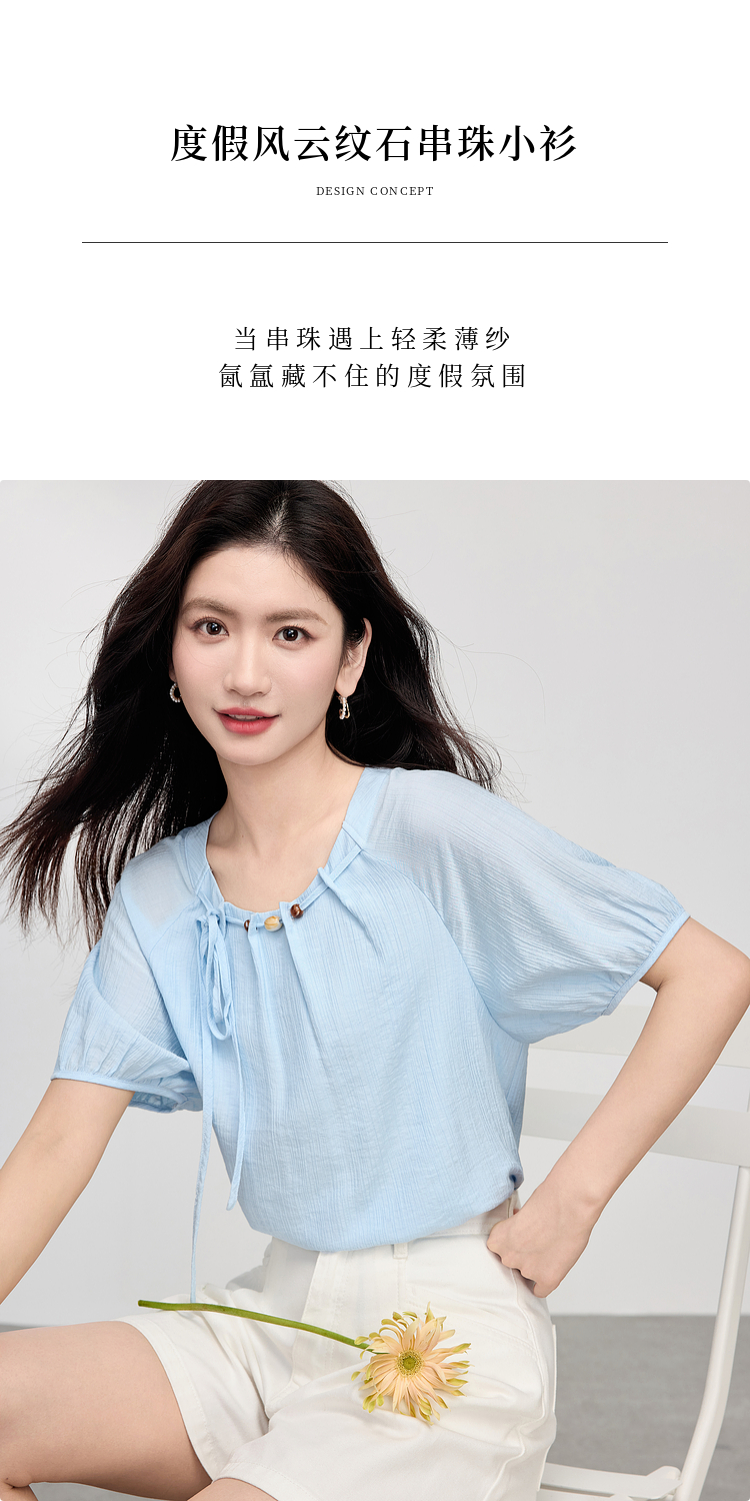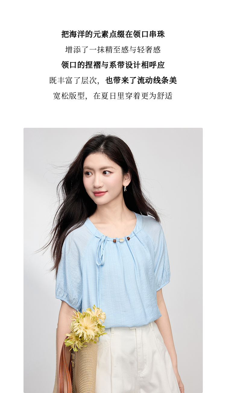 【专属特价】熙世界设计感串珠圆领衬衫女夏季度假风蓝色小衫短袖上衣2025新款