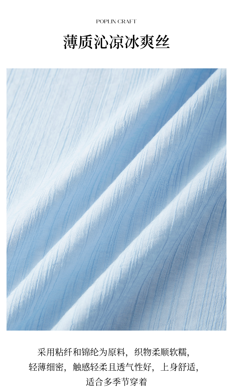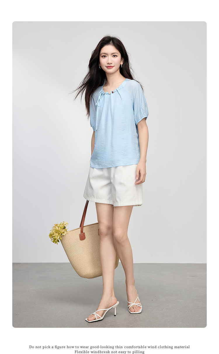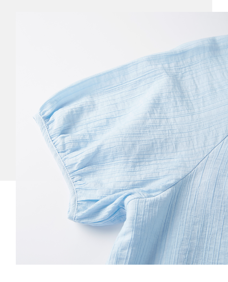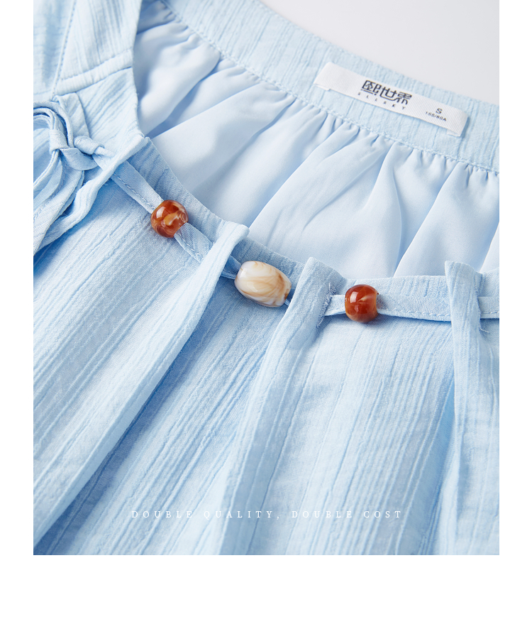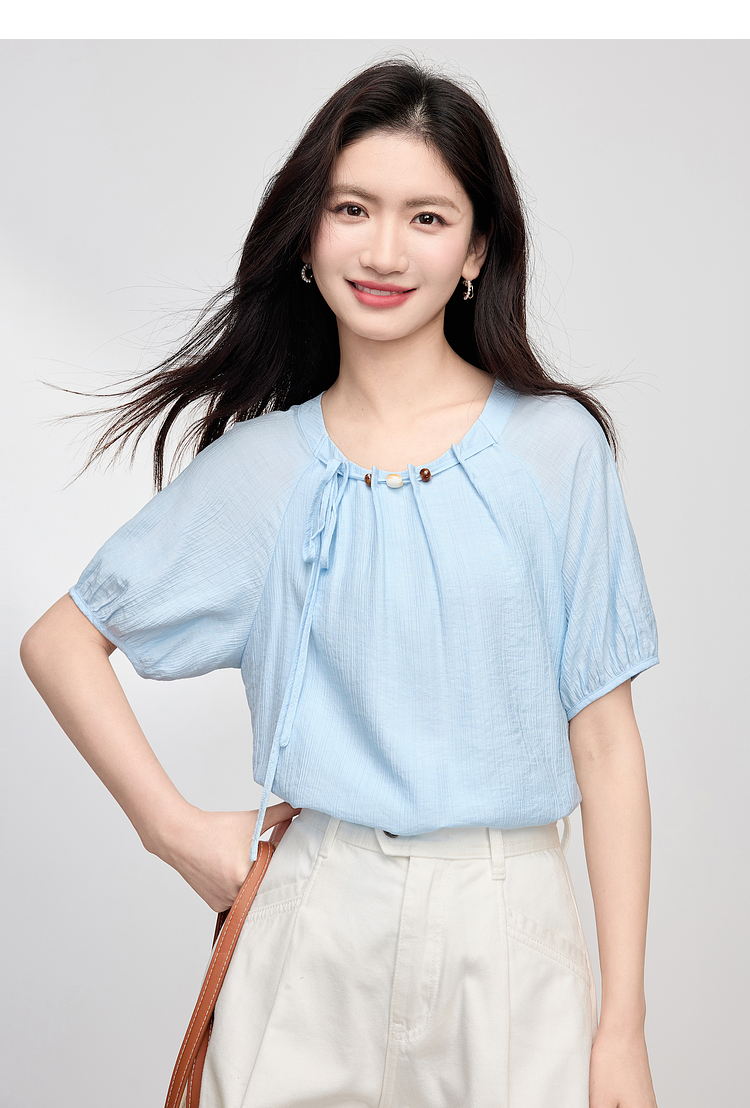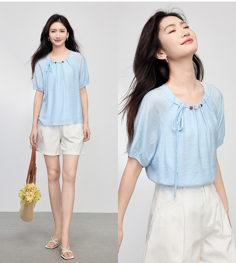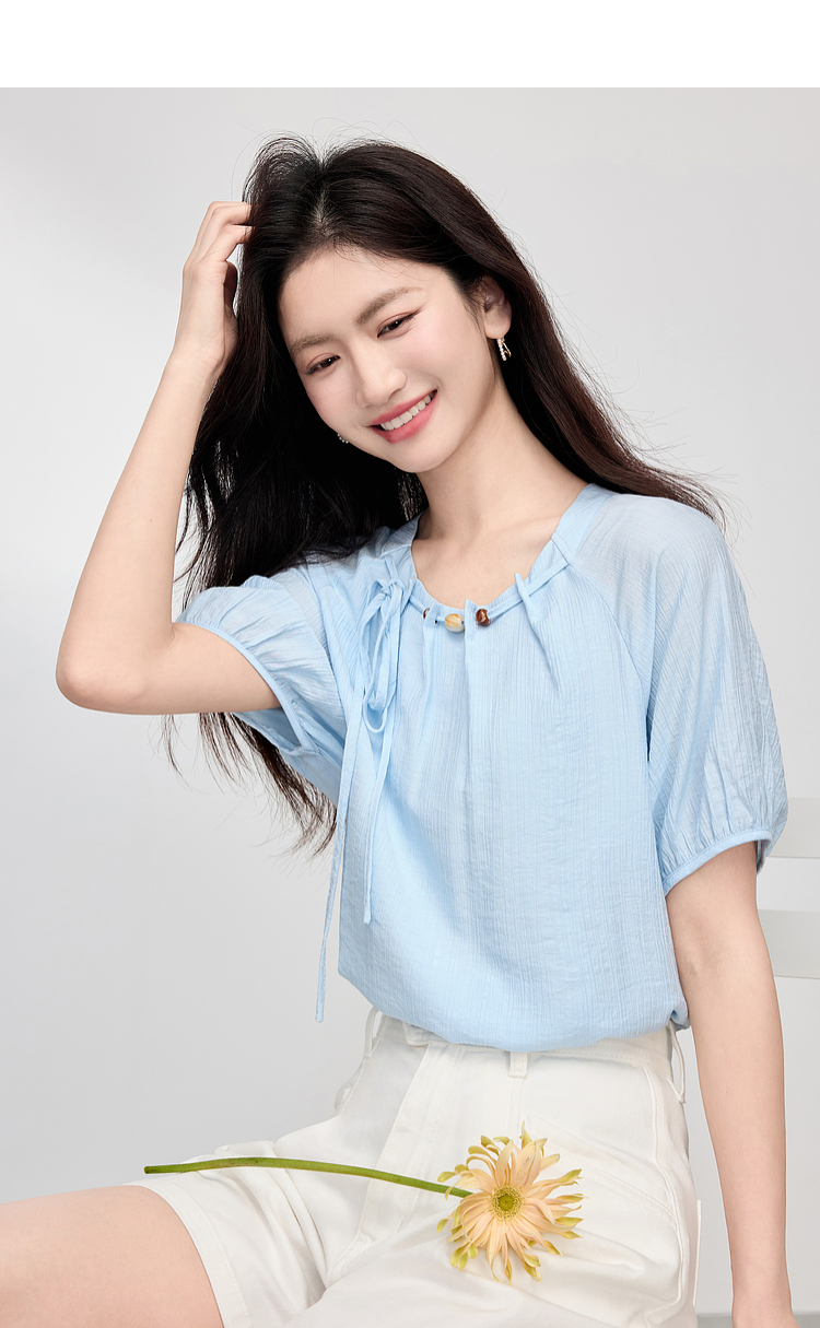 【专属特价】熙世界设计感串珠圆领衬衫女夏季度假风蓝色小衫短袖上衣2025新款