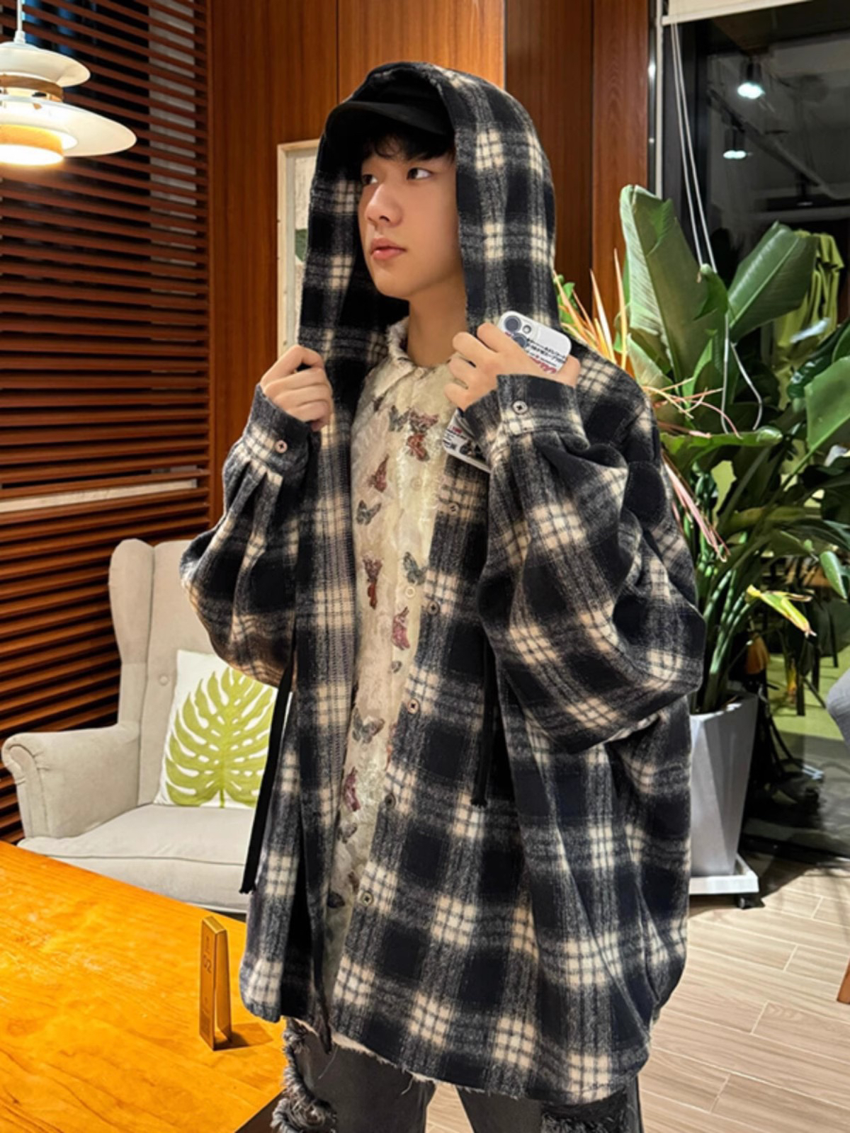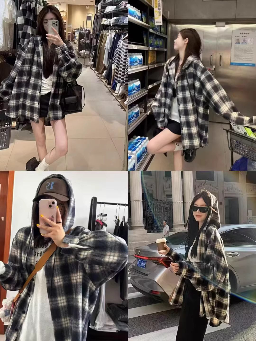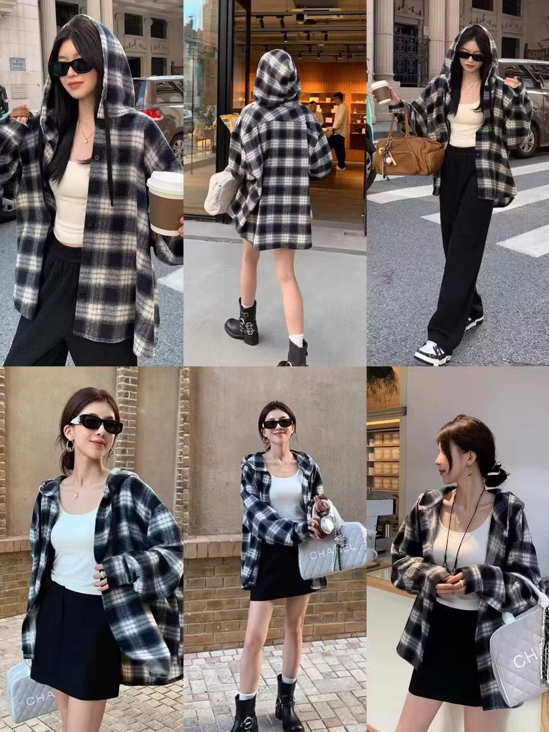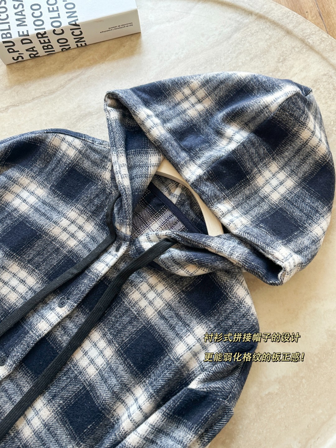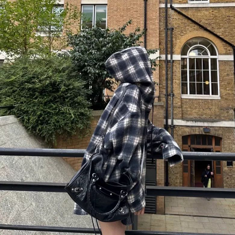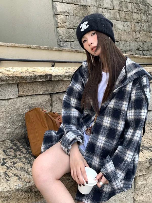 衬衫式拼接帽子的设计 更能弱化格纹的板正感!双层超大体量的帽子 戴上帽子松弛度真的拉满~