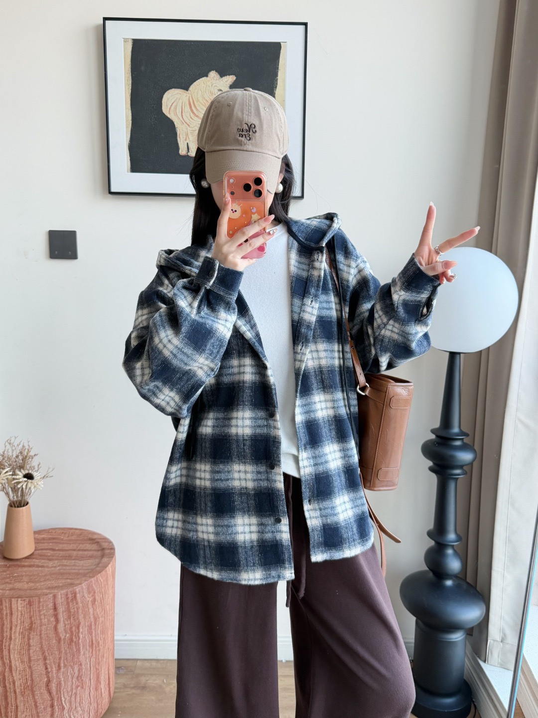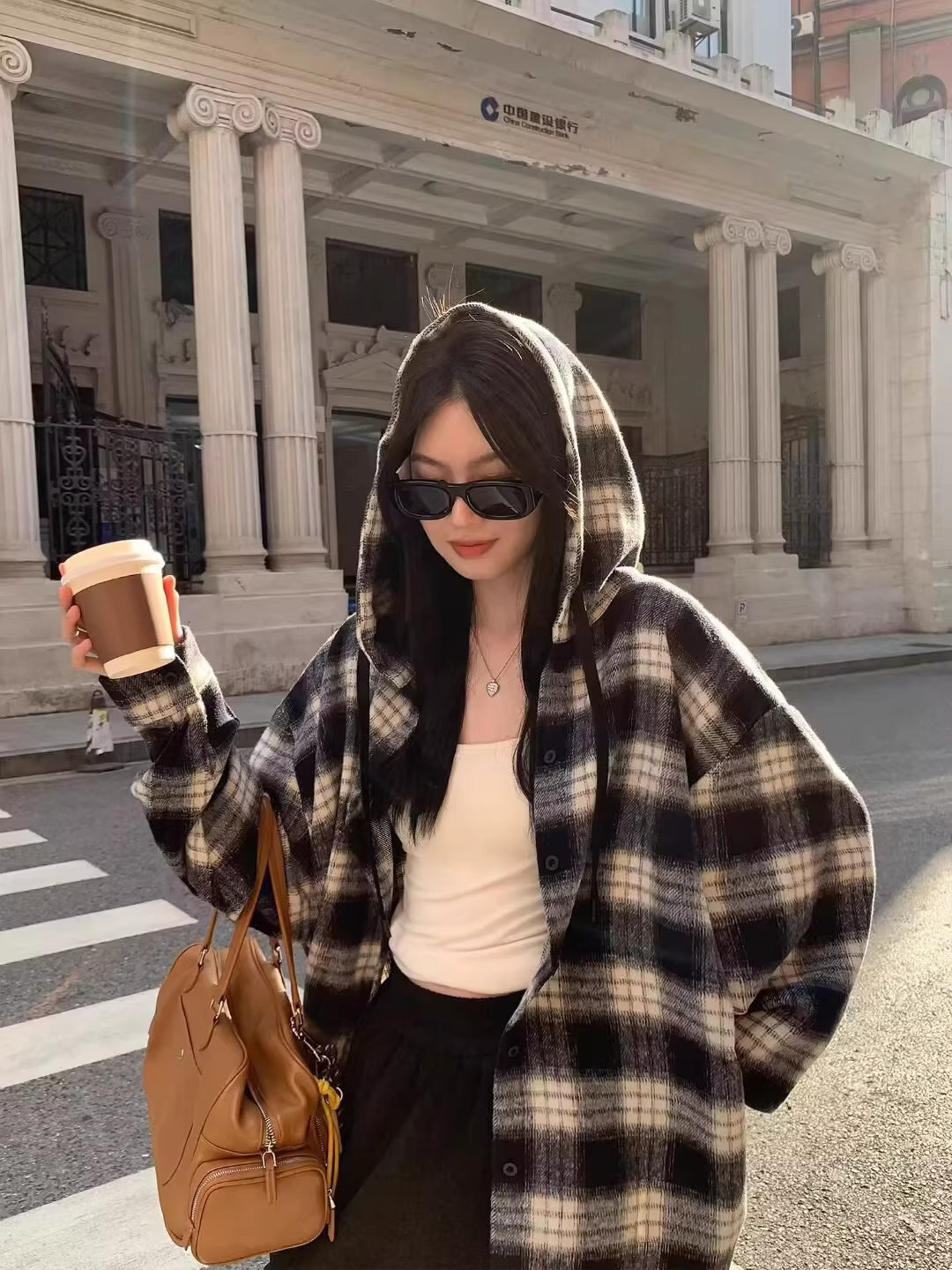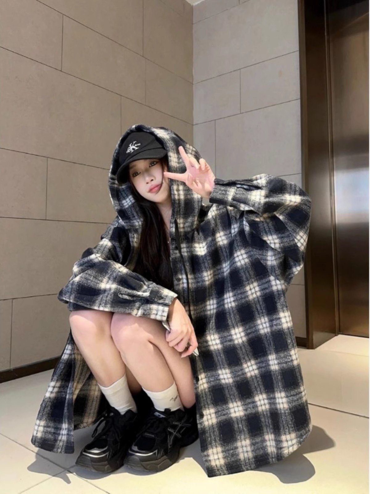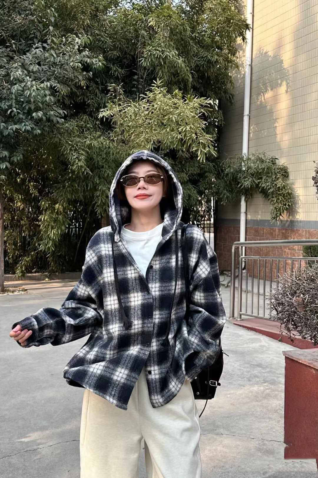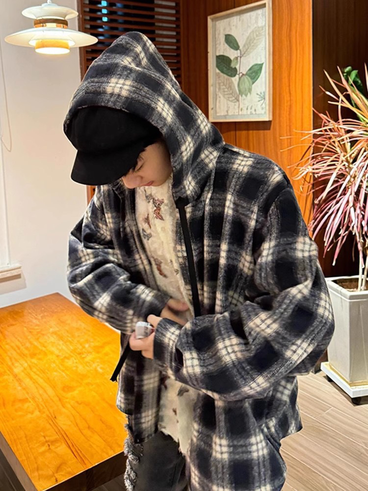 衬衫式拼接帽子的设计 更能弱化格纹的板正感!双层超大体量的帽子 戴上帽子松弛度真的拉满~
